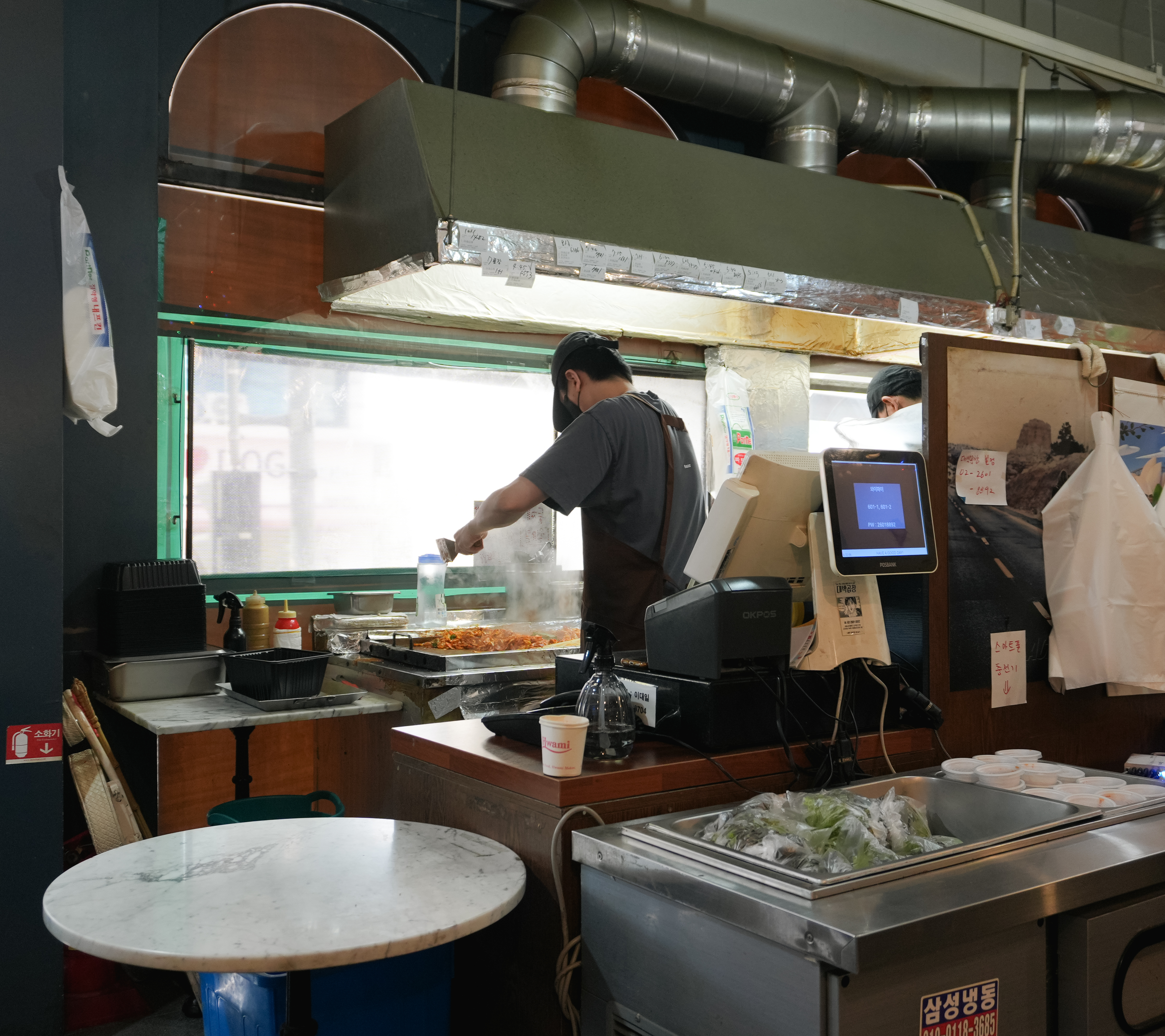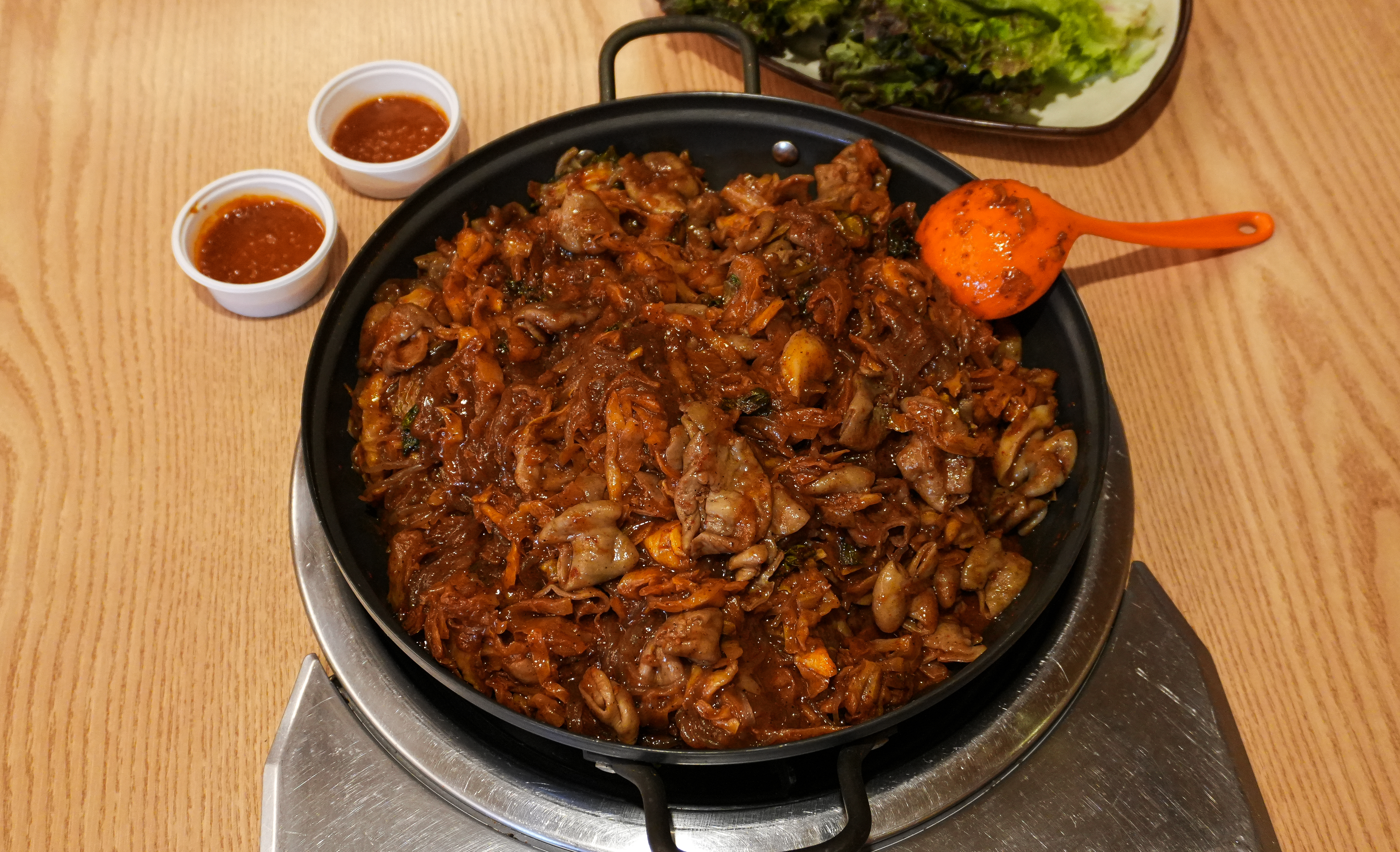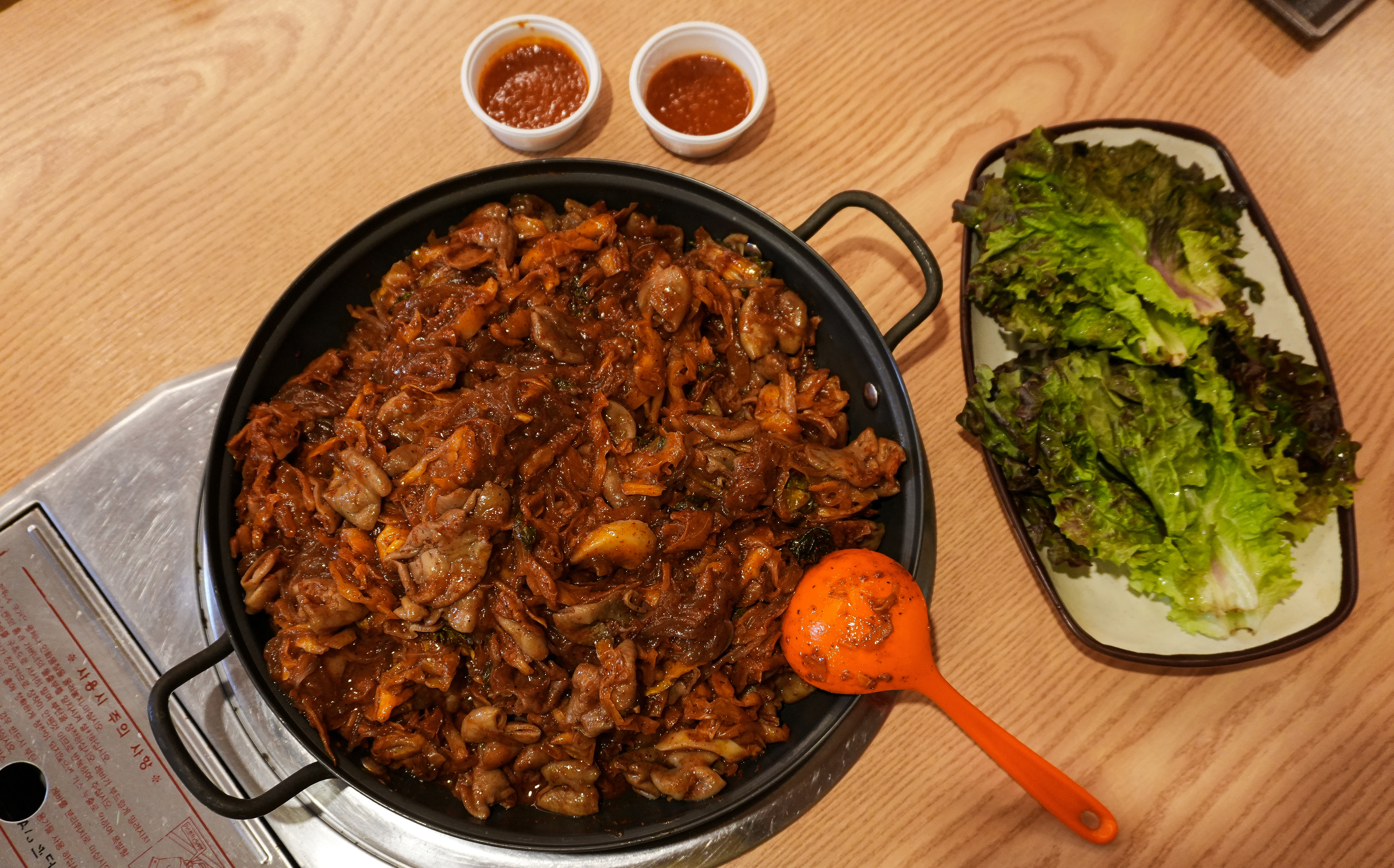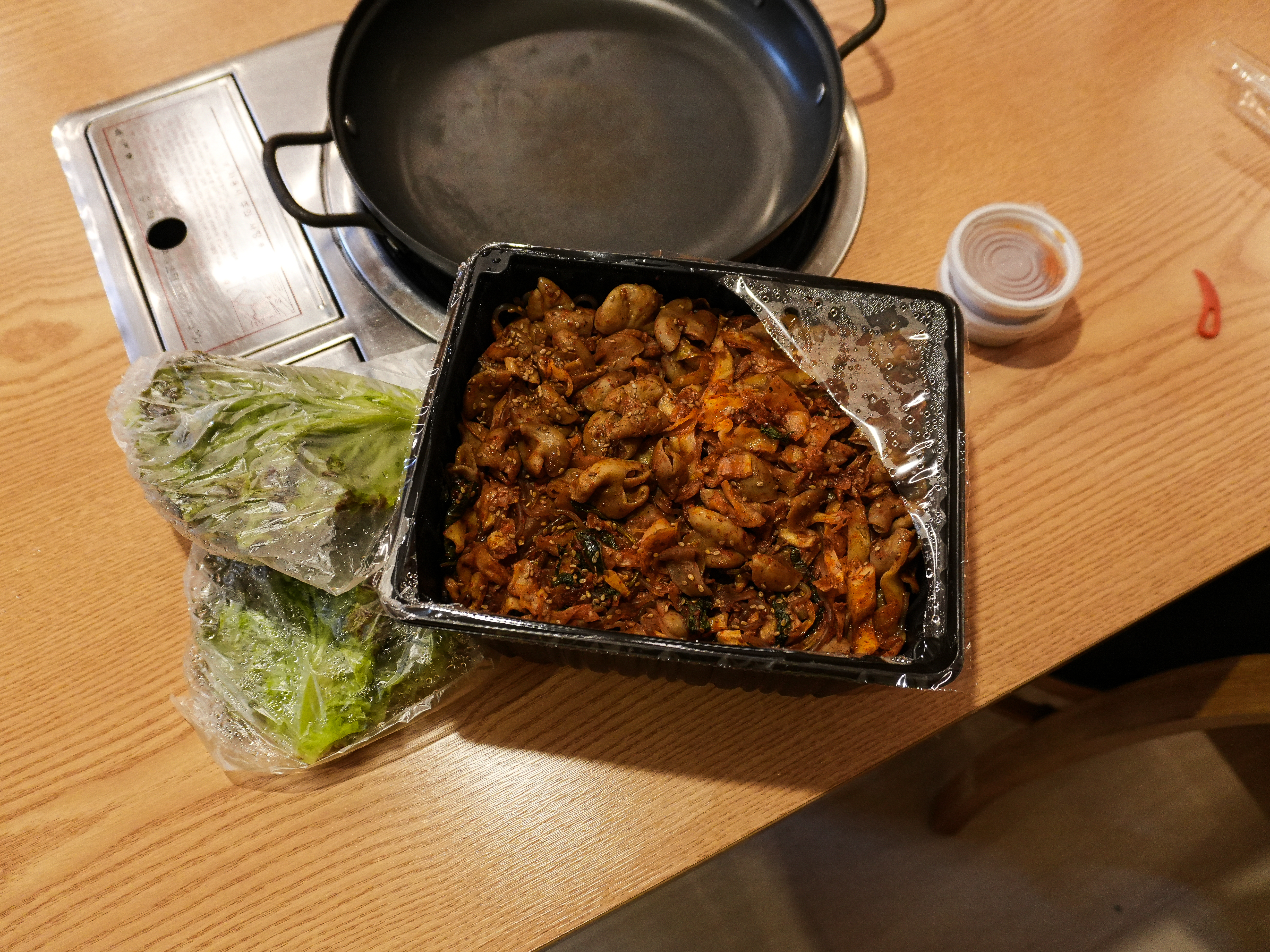 다행히 가게에 포장주문은 조금 더 늦은 시간에 했는데, 일찍 준비해 주셔서 빨리 포장할 수 있었습니다. 덕분에 철판에 곱창볶음을 볶는 과정도 볼 수 있었습니다. 한눈에 봐도 정말 많은 양을 철판에 볶아주시는데 2인분이라고는 믿기지 않는 양이었죠.