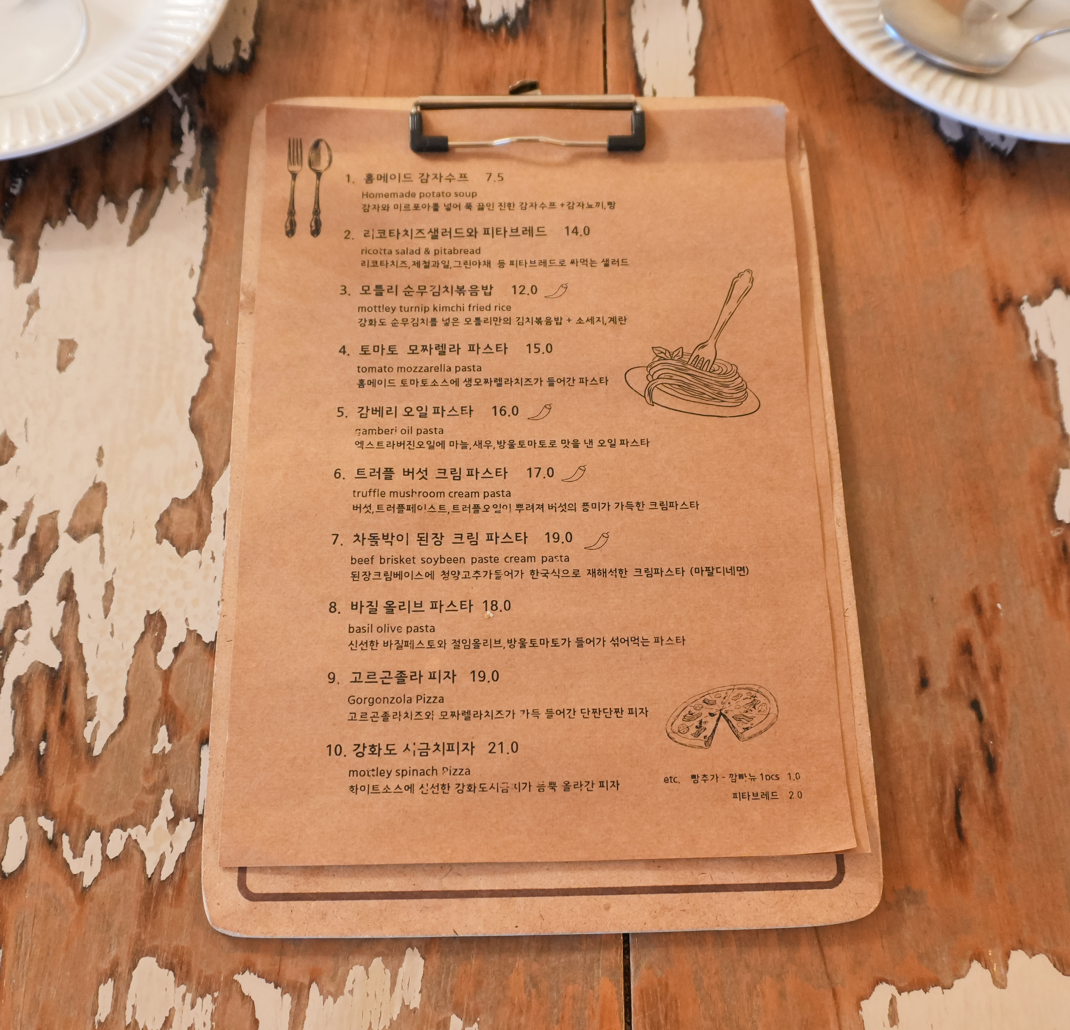 강화 파스타 전문점 모틀리의 메뉴는 홈메이드감자수프, 리코타치즈샐러드와피타브레드, 모틀리순무김치볶음밥, 토마토모짜렐라파스타, 감베리오일파스타, 트러플버섯크림파스타, 차돌박이된장크림파스타, 바질올리브파스타, 고르곤졸라피자, 강화도시금치피자 그리고 음료 메뉴가 있었습니다.