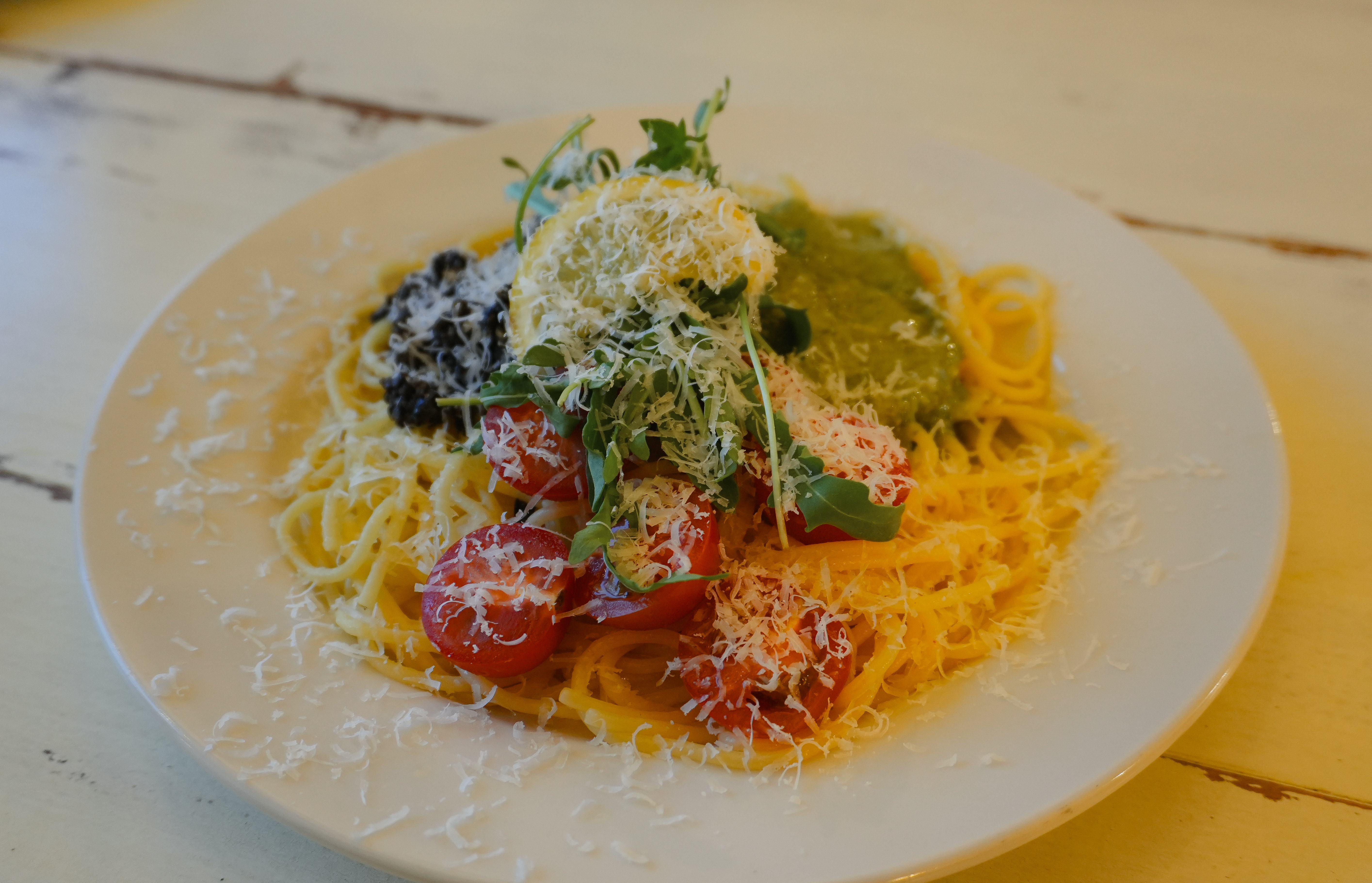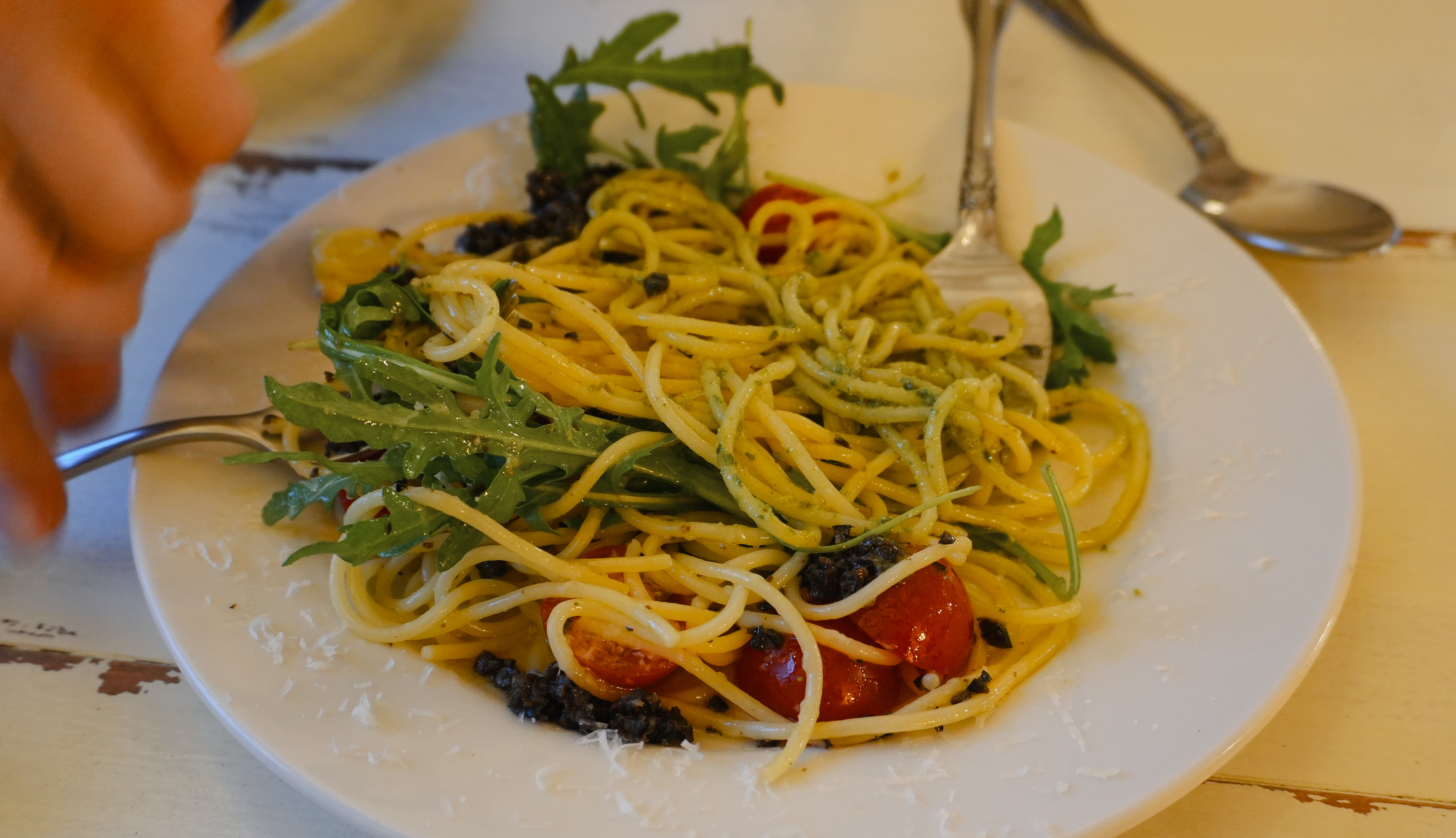 주문한 바질올리브파스타와 차돌박이된장크림파스타가 나왔습니다. 바질올리브파스타는 바질페스토와 방울토마토, 올리브를 넣어 만든 파스타였고, 차돌박이된장크림파스타는 된장크림베이스에 청양고추와 꼬불꼬불한 마팔디네면이 들어간 실험적인(?) 메뉴였습니다.