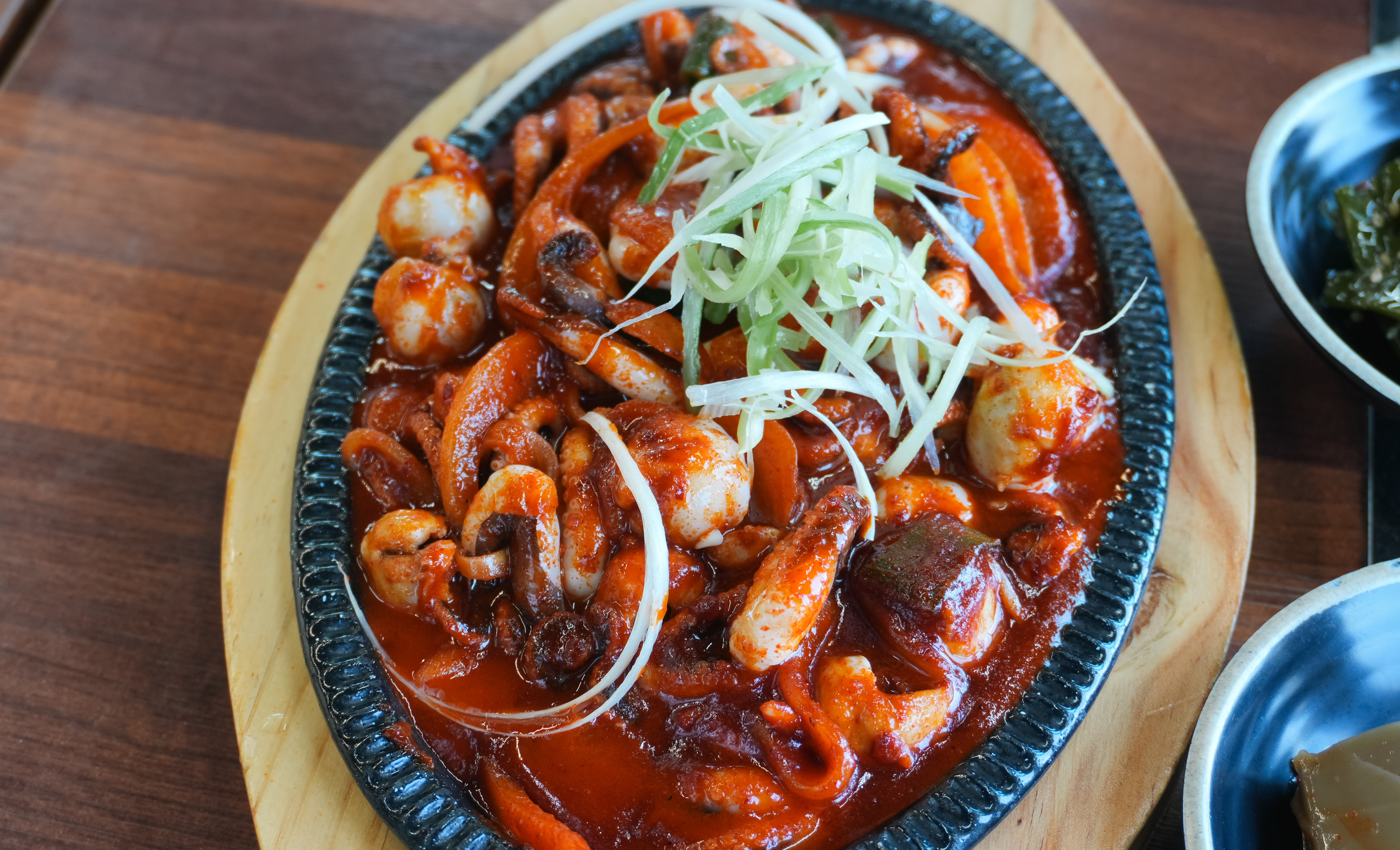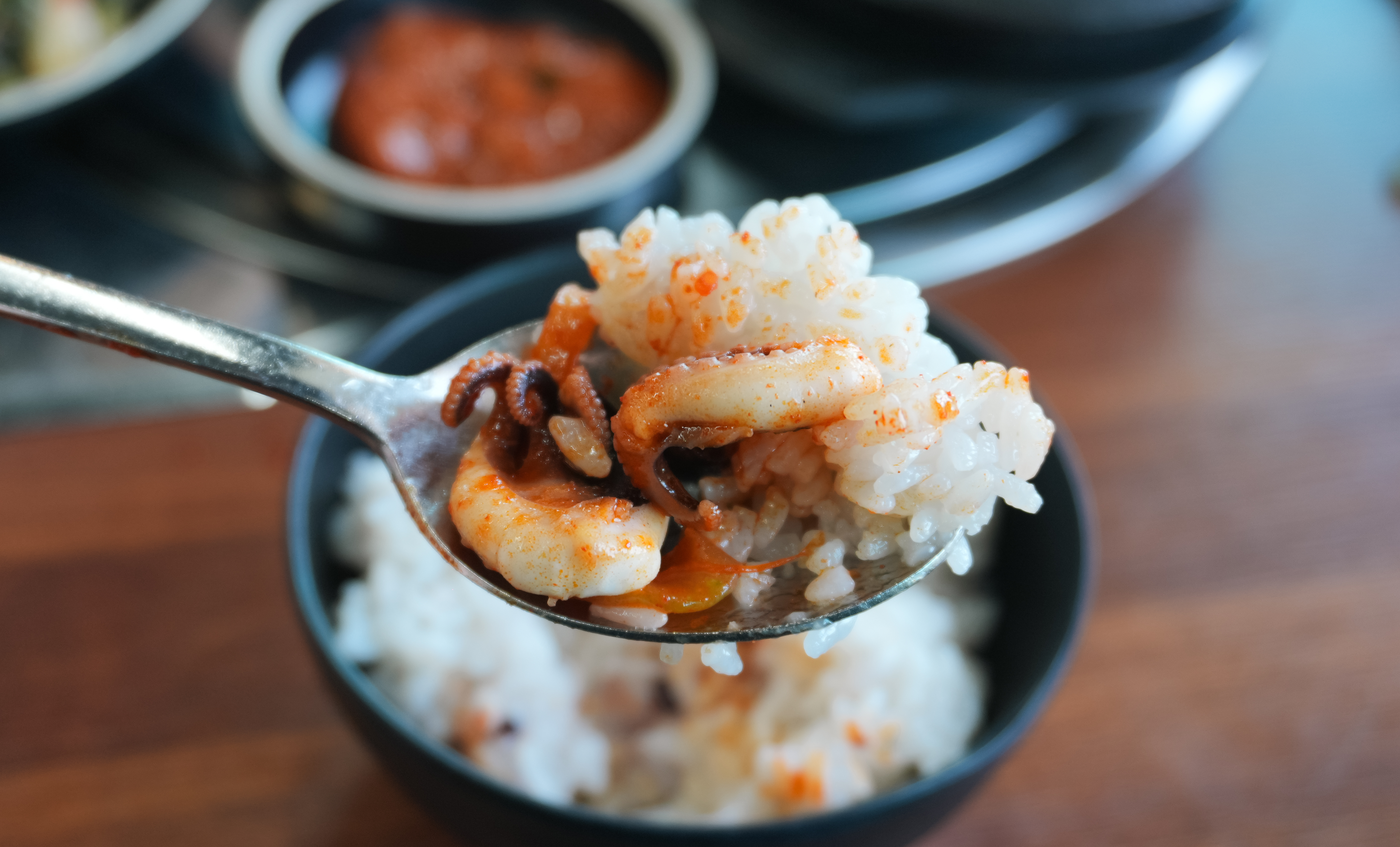 쭈꾸미쌈정식에는 메인 메뉴인 쭈꾸미볶음과 기본 반찬 5가지와 된장찌개, 우렁쌈장이 나왔습니다. 추가 쌈채소는 위에 언급하였던 셀프바에서 직접 가져다 먹으면 되었고요. 기타 반찬은 사장님께 부탁드리면 자리에 가져다주고 있었습니다.