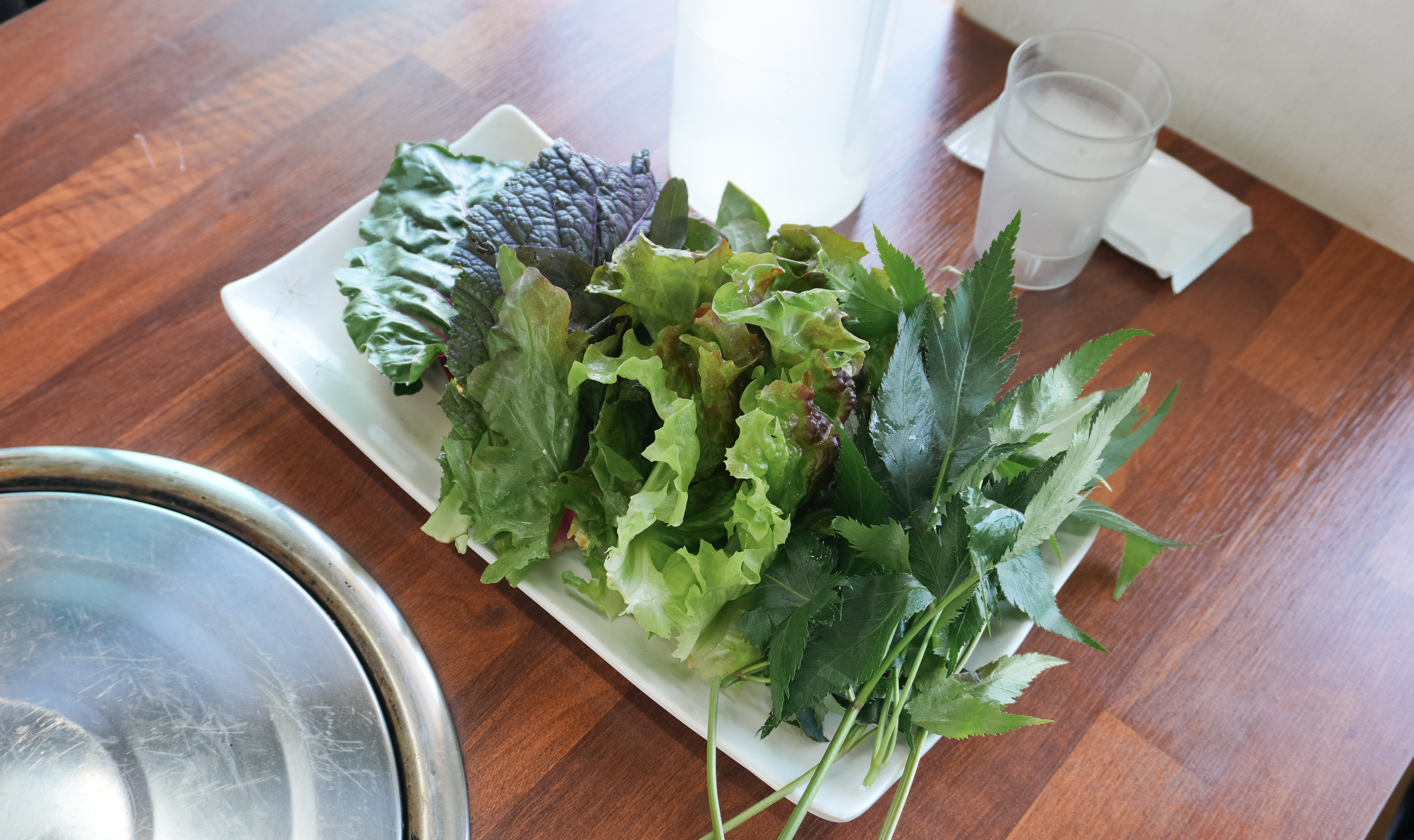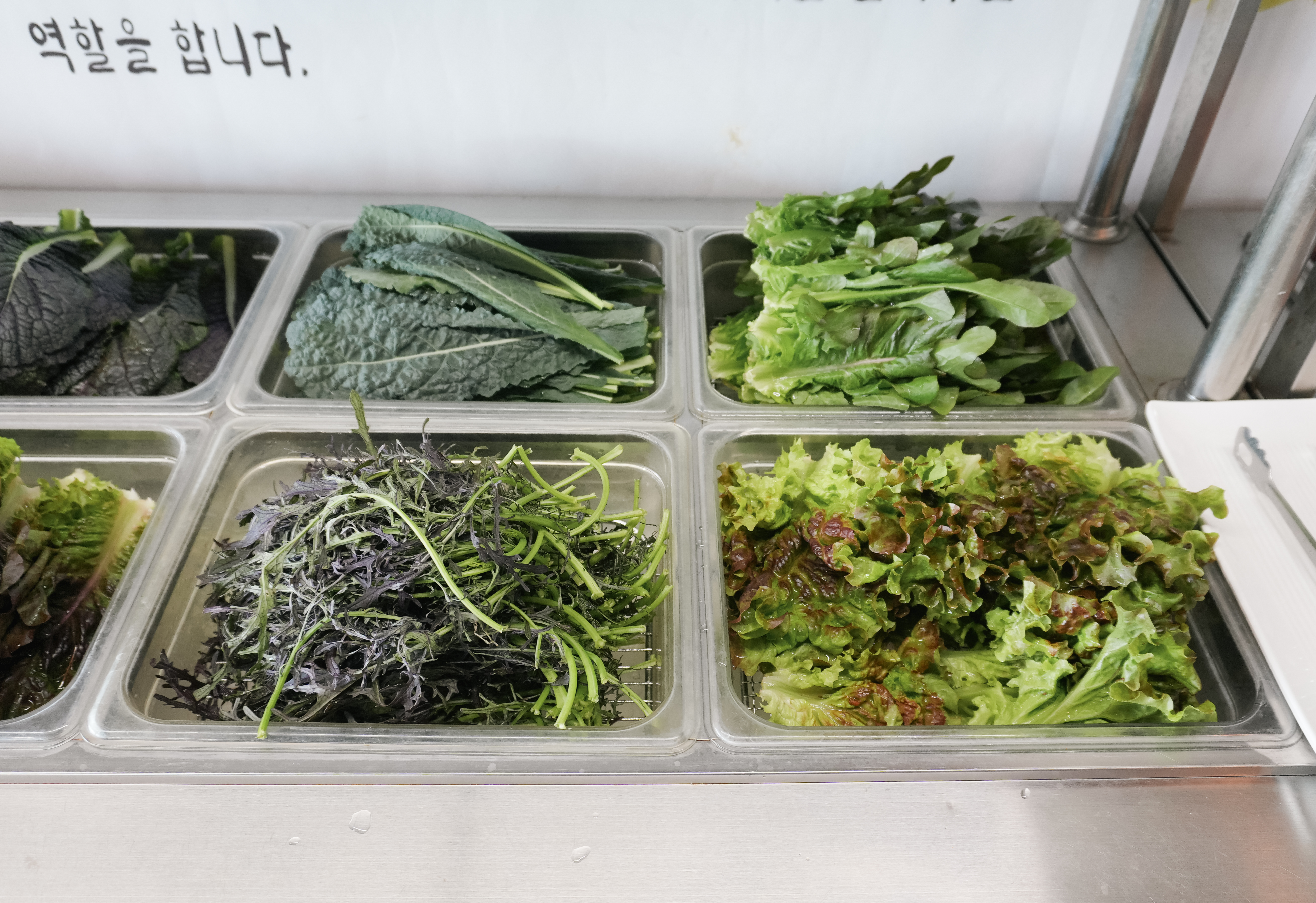 먼저, 셀프바에서 채소를 담아왔습니다. 종류별로 8가지 쌈채소가 있었는데 제가 좋아하는 케일이나 당귀도 있어서 넉넉하게 가져왔습니다. 추가로 얼마든지 가져올 수 있으니 너무 욕심부리지는 않았습니다.