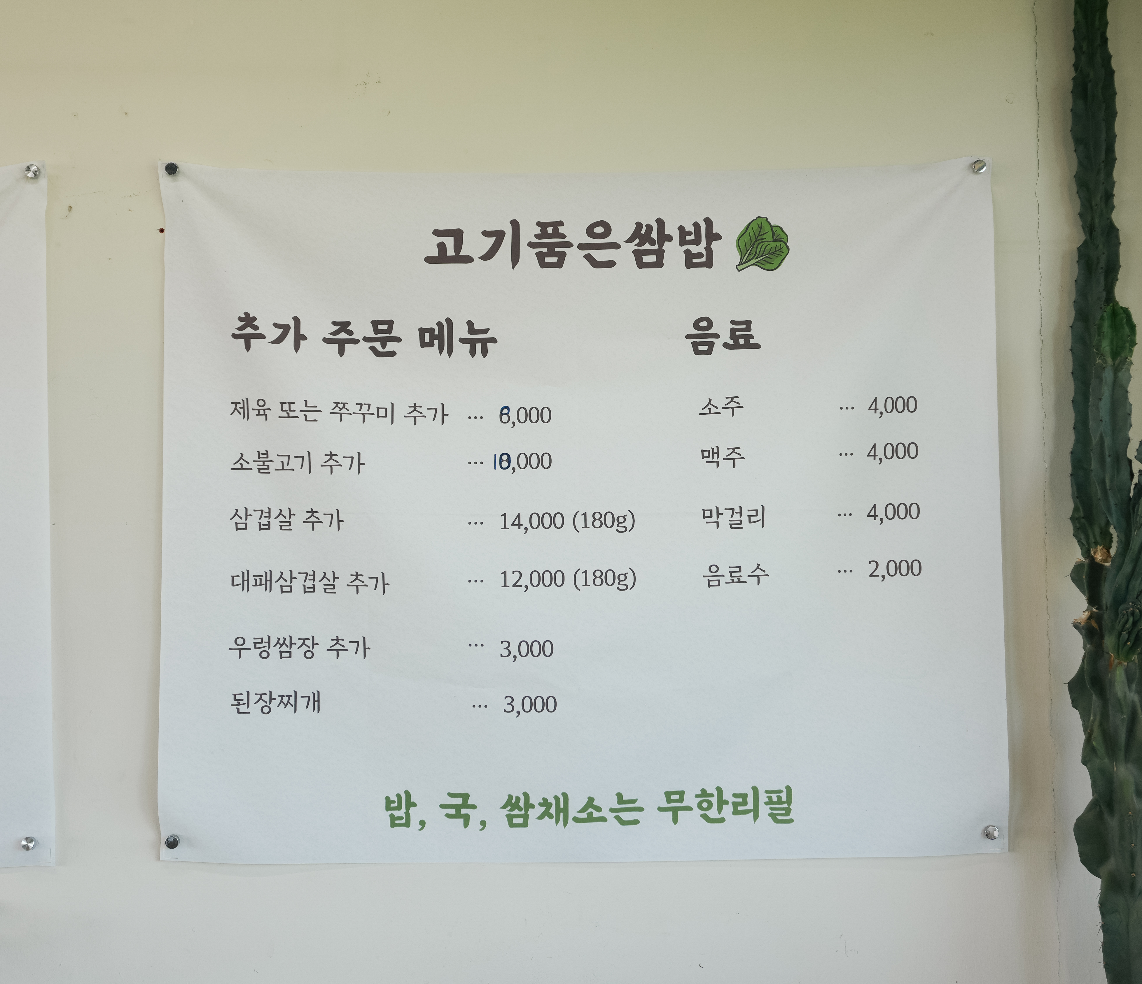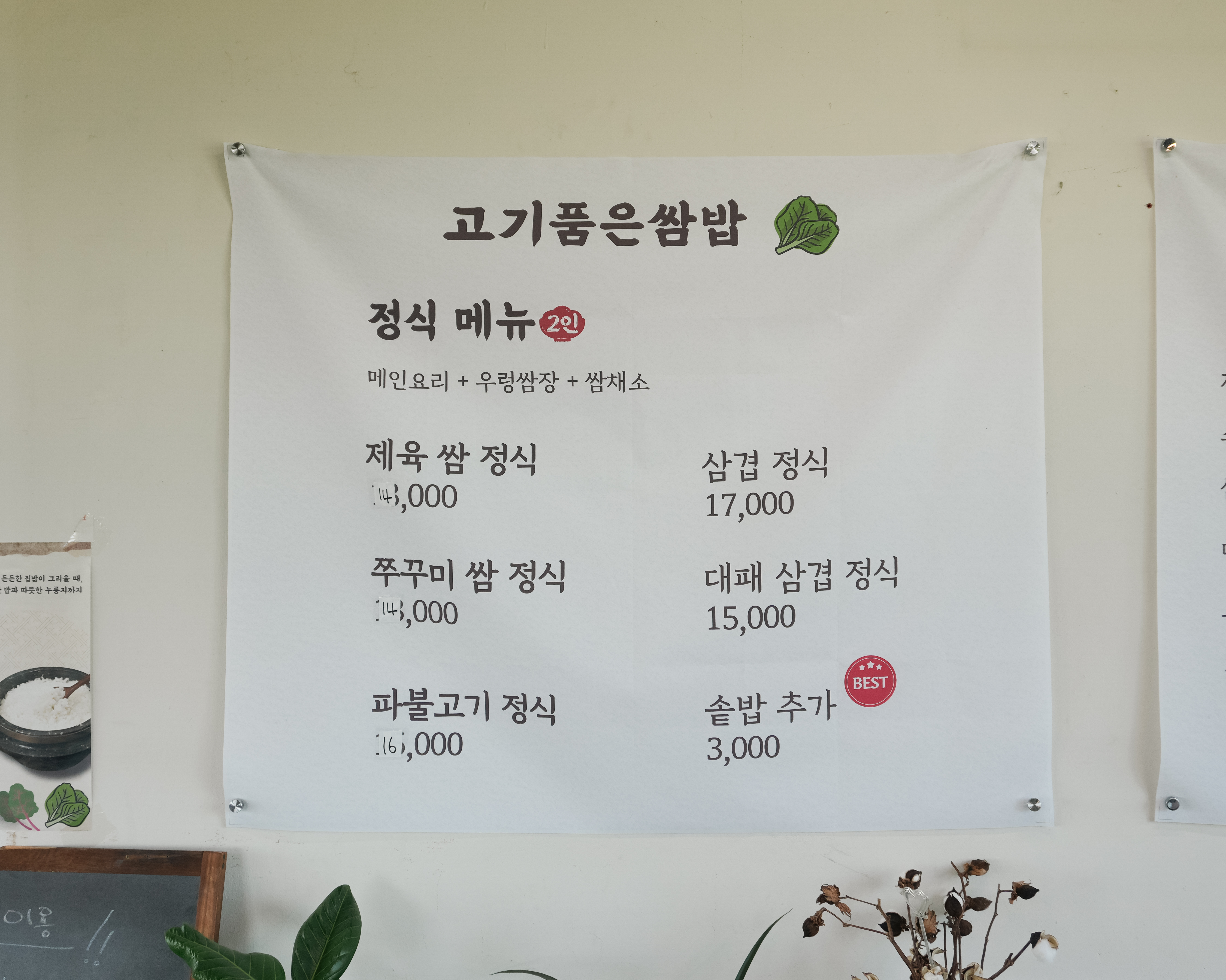 메뉴를 살펴보시면 제육쌈정식, 쭈꾸미쌈정식, 파불고기정식, 삼겹정식, 대패삼겹정식, 솥밥추가 그밖에 추가 메뉴로 제육 또는 쭈꾸미, 소불고기, 삼겹살, 대패삼겹살, 우렁쌈장, 된장찌개를 추가할 수 있었습니다.