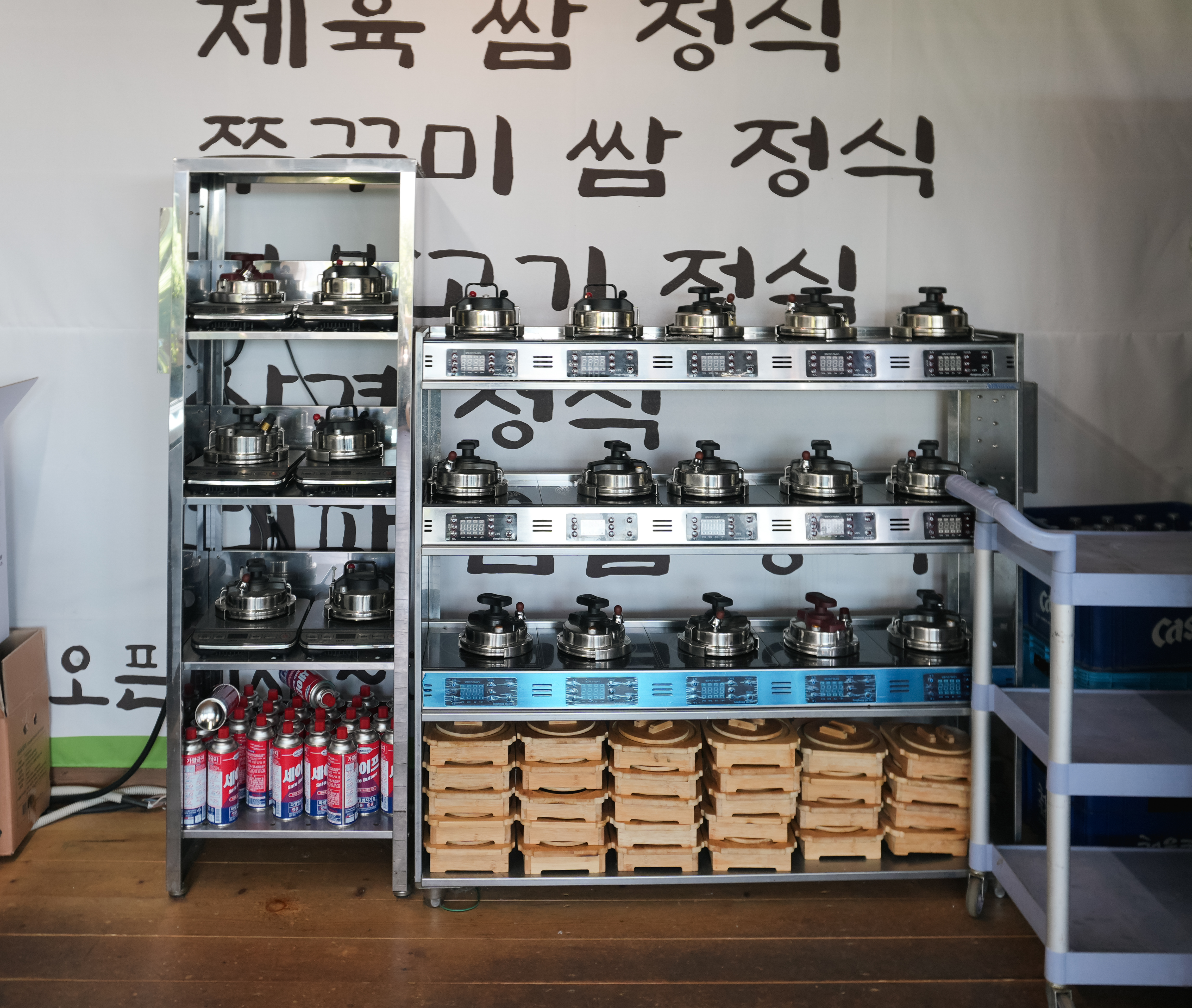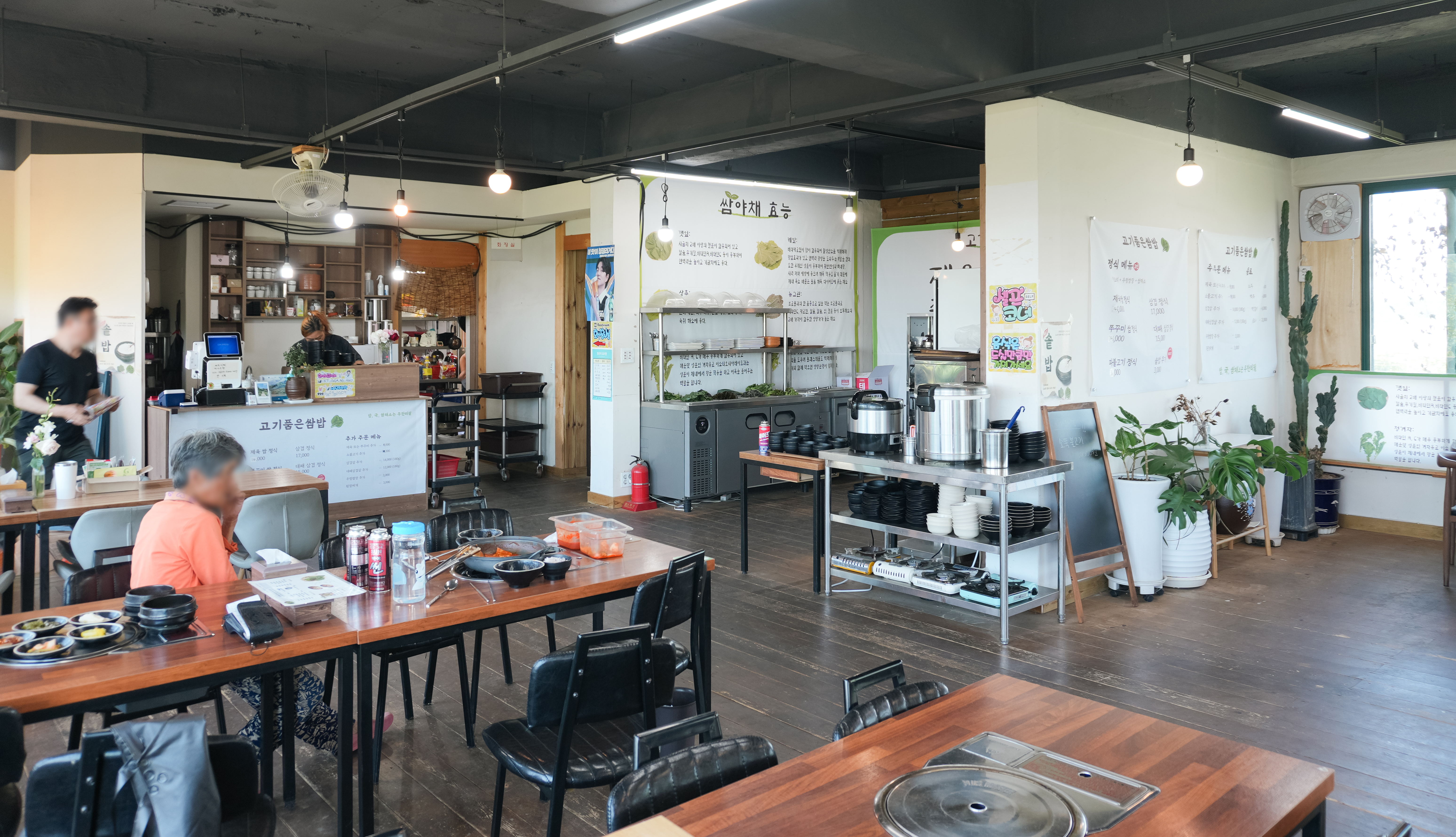 초지리 고기품은쌈밥 가게 내부의 분위기는 위와 같았습니다. 그냥 일반적인 식당 느낌이었는데, 이곳의 특장점은 쌈채소와 밥을 내가 원하는 만큼 가져다 먹을 수 있다는 점이었습니다. 가게 한편에는 솥밥도구들도 보였습니다.