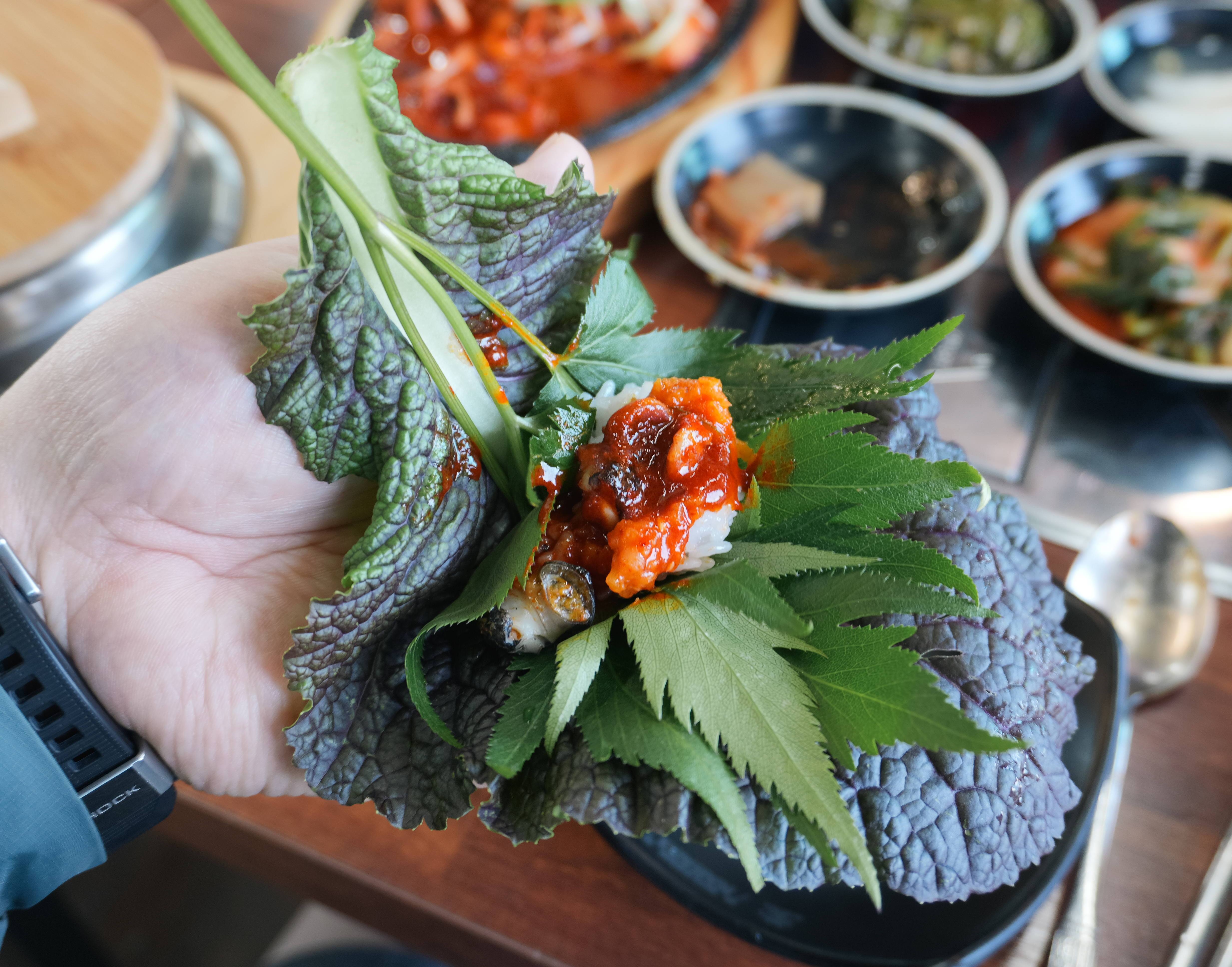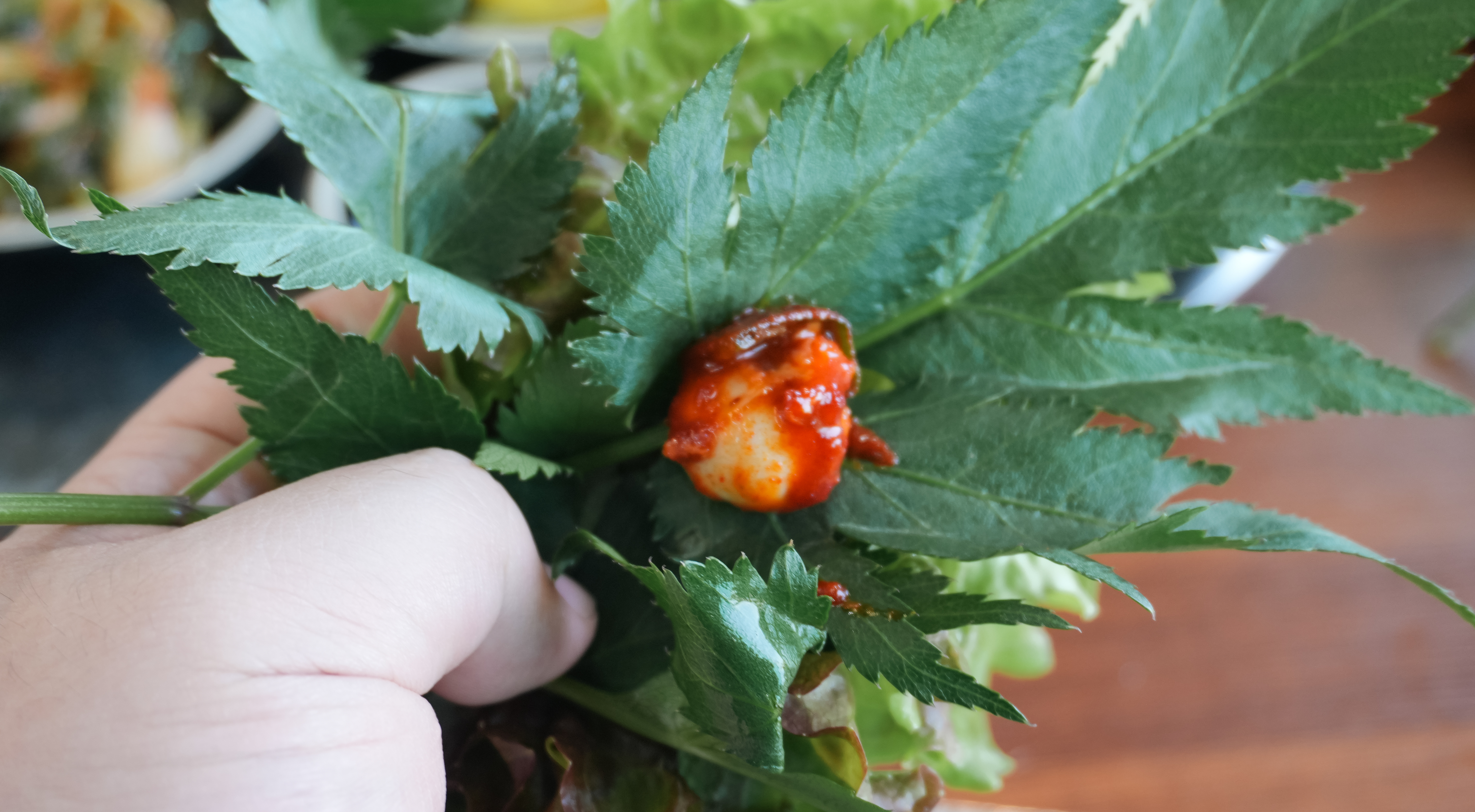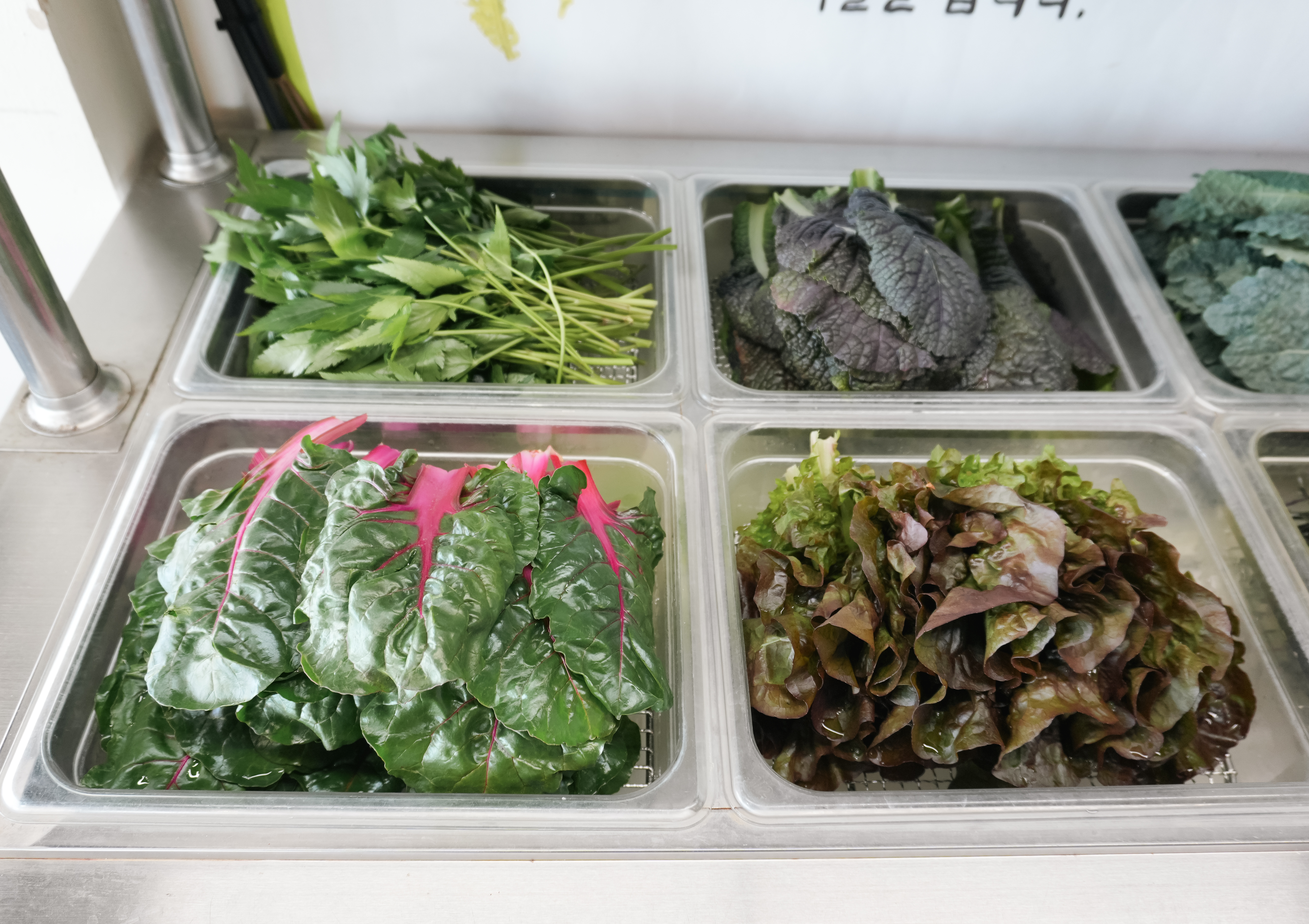 먼저, 셀프바에서 채소를 담아왔습니다. 종류별로 8가지 쌈채소가 있었는데 제가 좋아하는 케일이나 당귀도 있어서 넉넉하게 가져왔습니다. 추가로 얼마든지 가져올 수 있으니 너무 욕심부리지는 않았습니다.