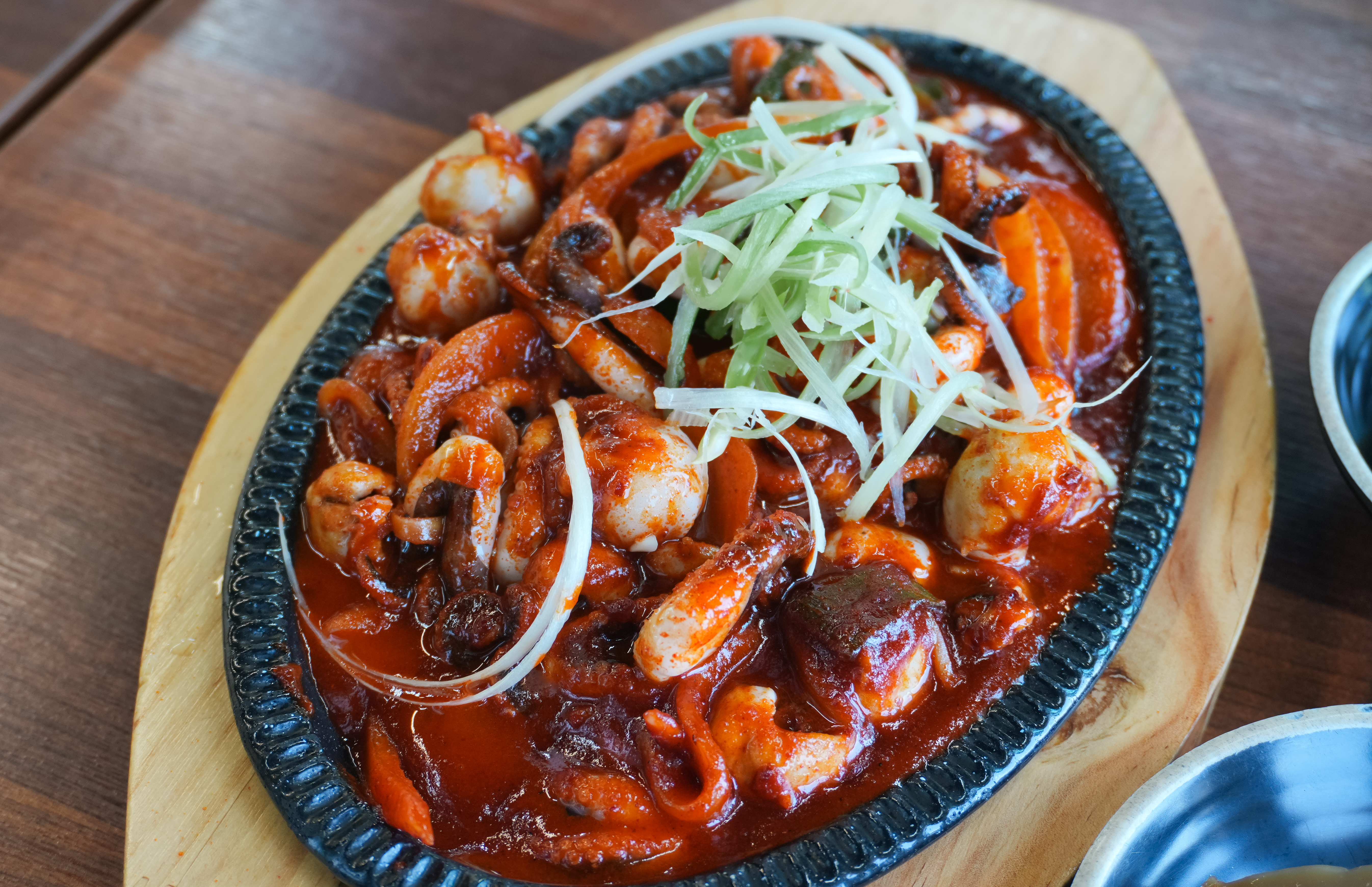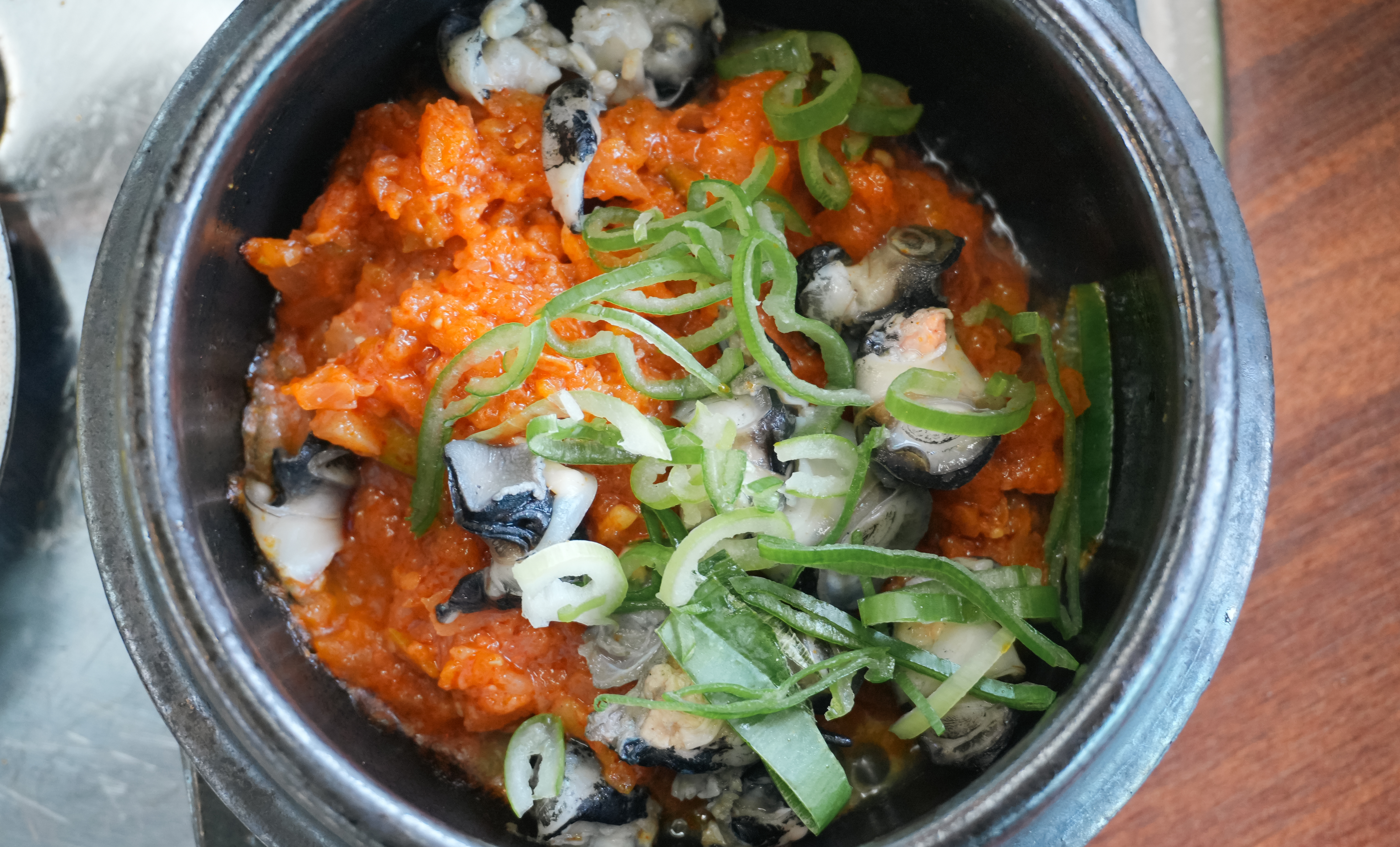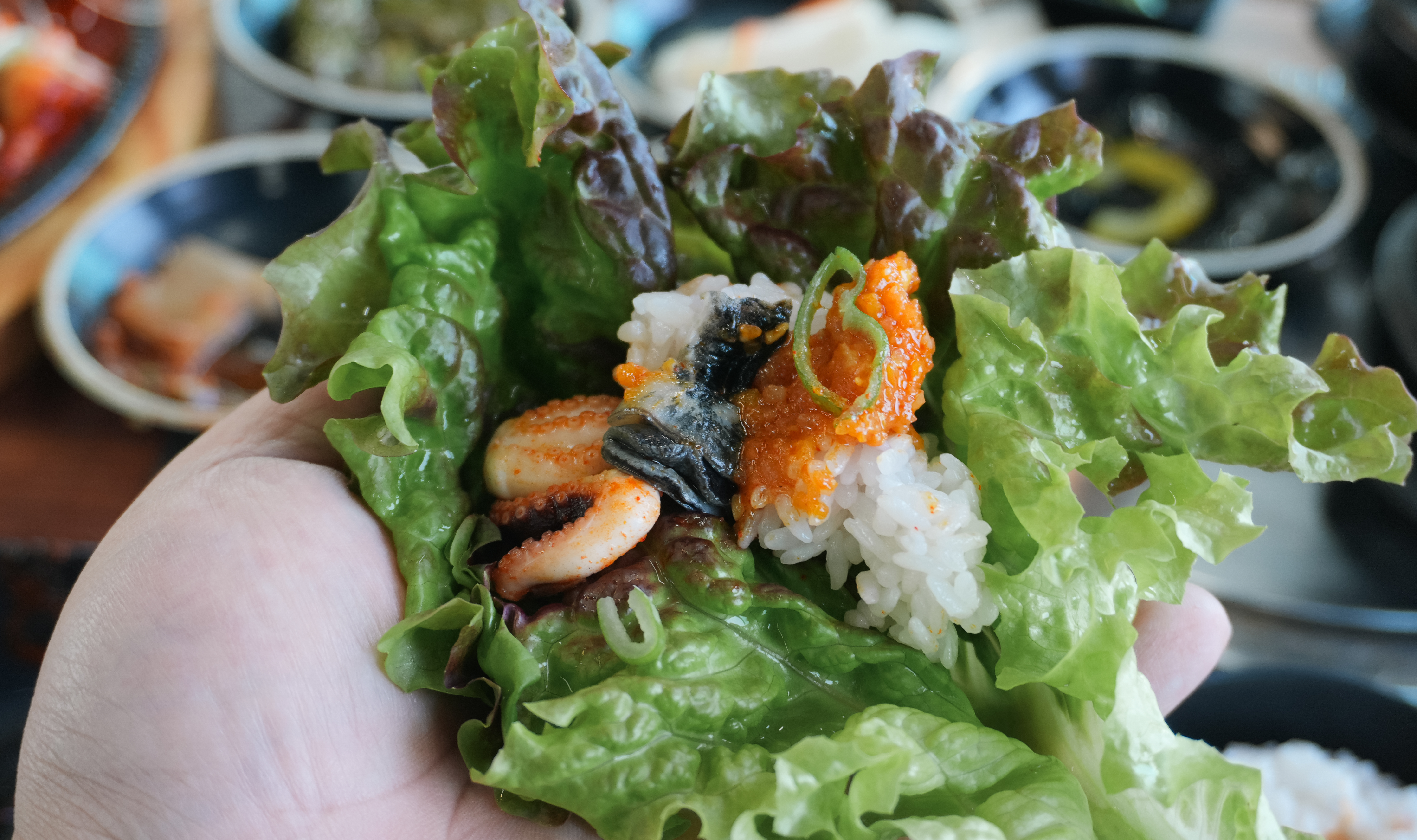 강화도 고기품은쌈밥의 쭈꾸미볶음은 소스가 생각보다 매콤하지는 않았고, 불향이 나더라고요. 그래도 밥이랑 비벼먹기 좋게 국물이 자작하게 있어서 먹기 좋았습니다. 물론 쌈으로 먹어도 좋았고요. 갓 지어 나온 돌솥밥에 바로 먹어도 좋았고, 쌈채소와 우렁이쌈장을 함께 곁들여서 먹어도 맛있었습니다.