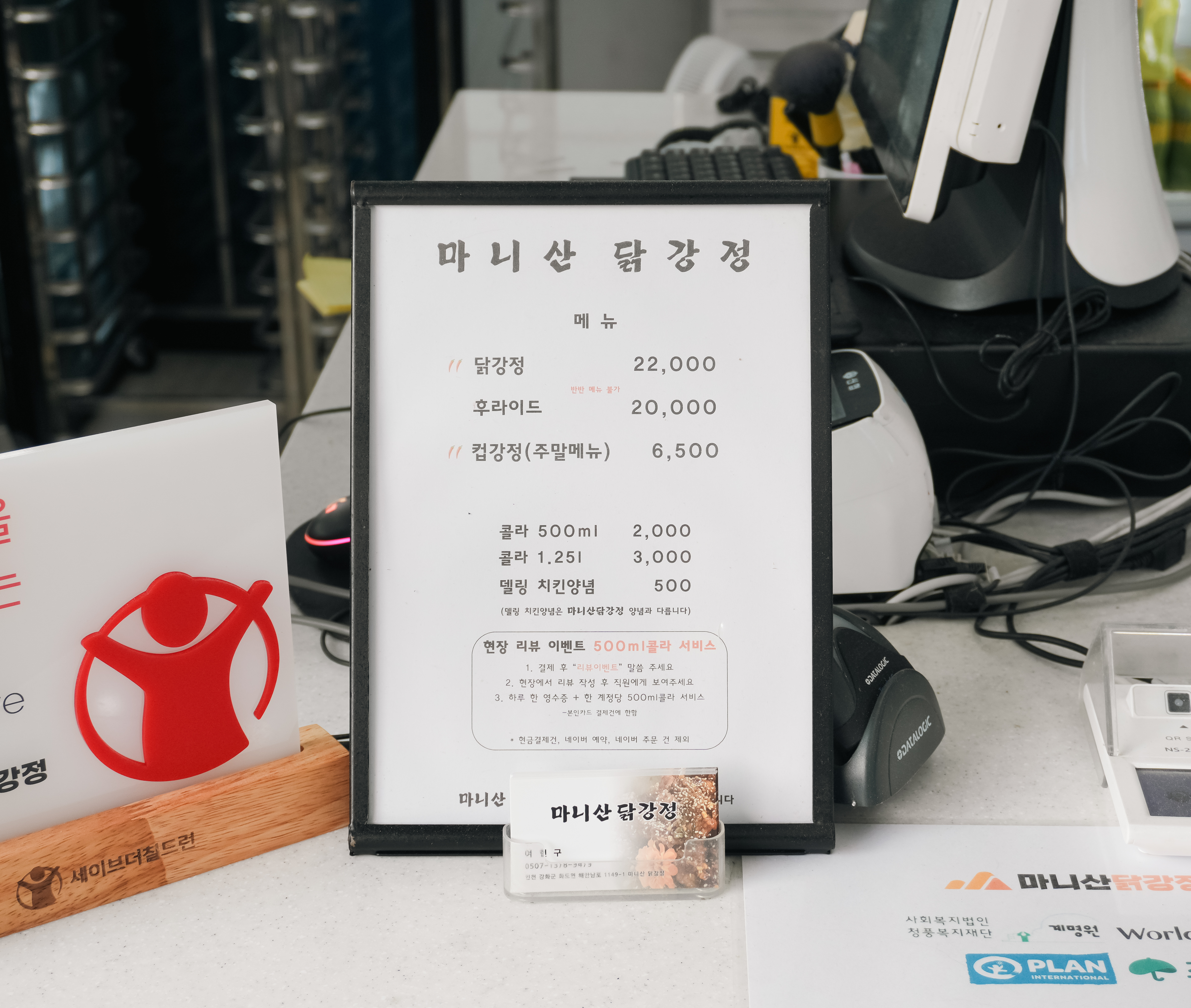 마니산닭강정은 인천 강화군 화도면 사기리 234-10, 1층에 위치한 가게였습니다. 이곳은 유명인들도 다녀갔는지 사진과 함께 사인이 걸려 있었고, 대기하는 손님들도 많이 있어서 주문하고 한 20분 정도 대기해야 했습니다.