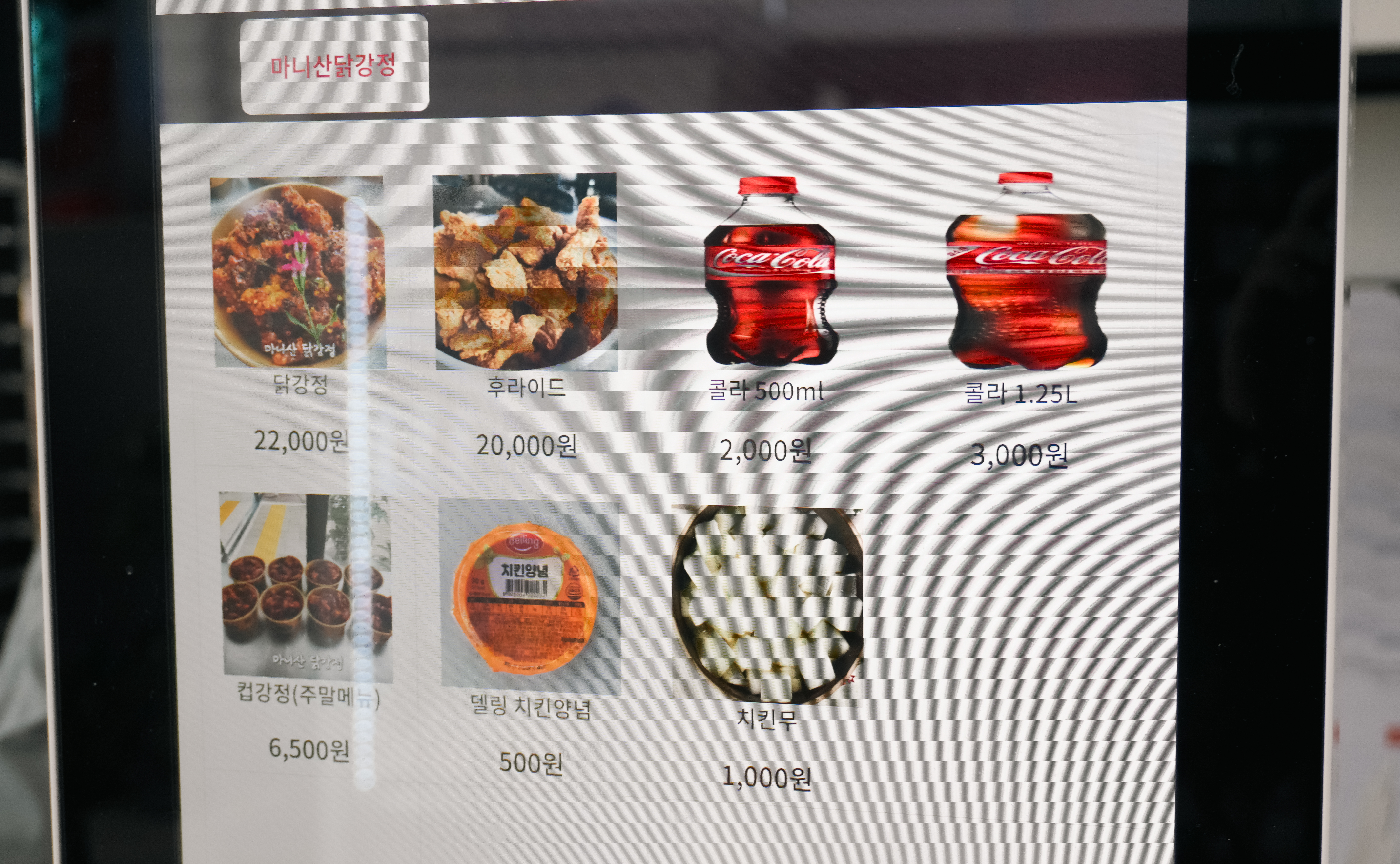 강화도 마니산닭강정 메뉴는 키오스크에서 메뉴를 주문할 수 있었는데요. 닭강정, 프라이드, 컵강정 등이 있었습니다. 가장 많이 판매되는 닭강정은 22,000원이었고, 컵강정은 6,500원으로 부담 없는 가격에 맛볼 수 있었습니다. 저는 22,000원 닭강정을 주문했습니다.
