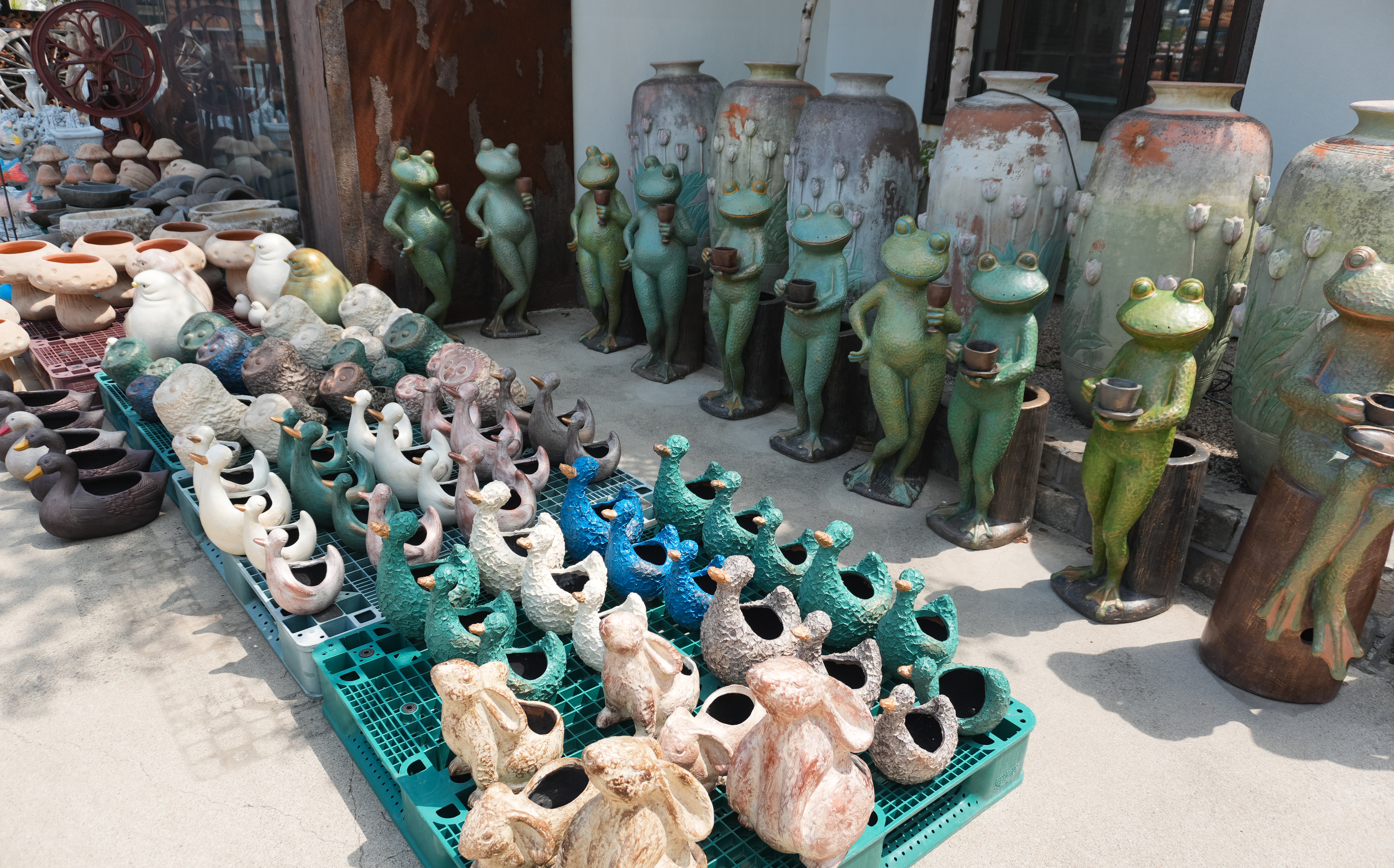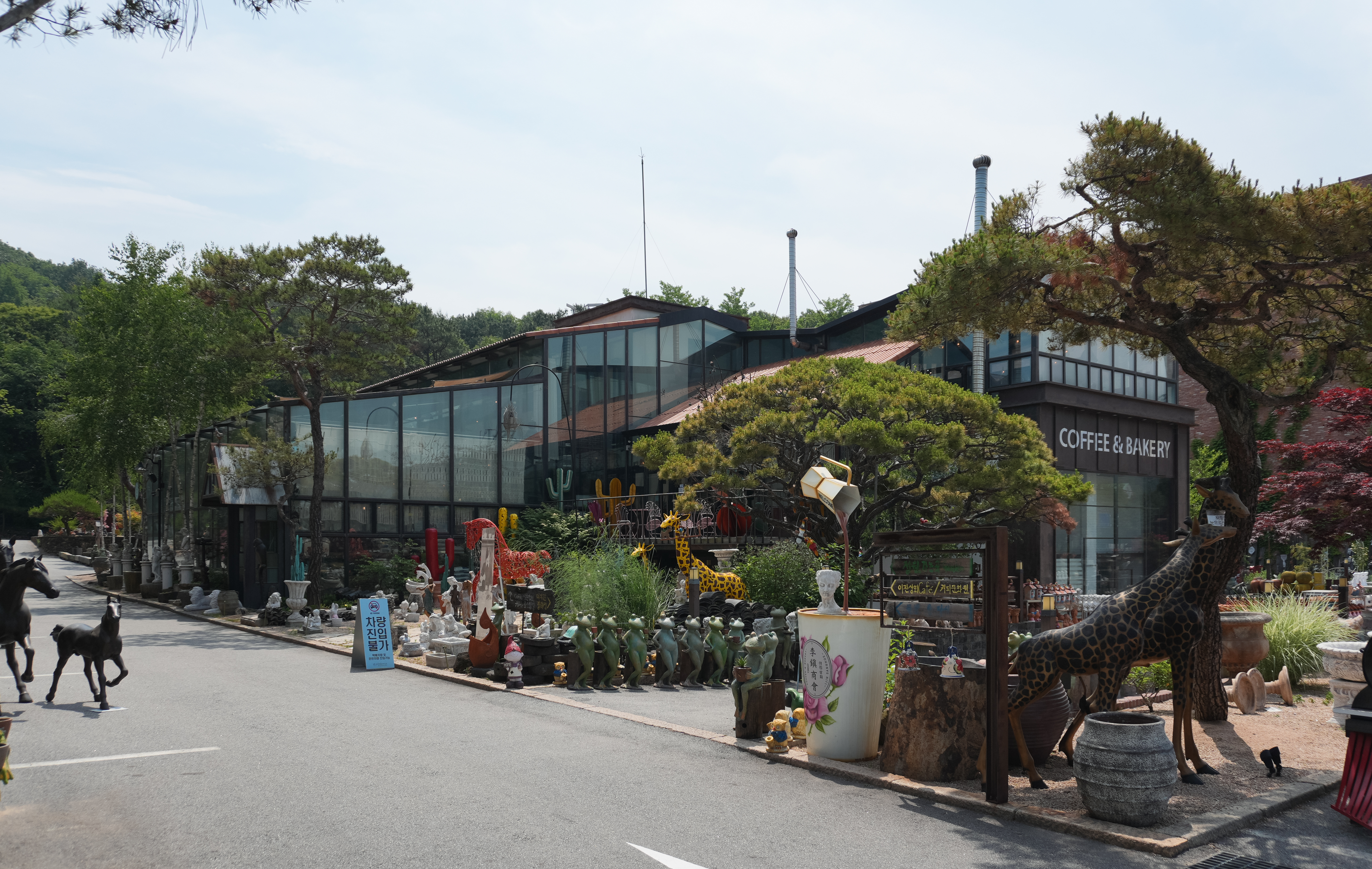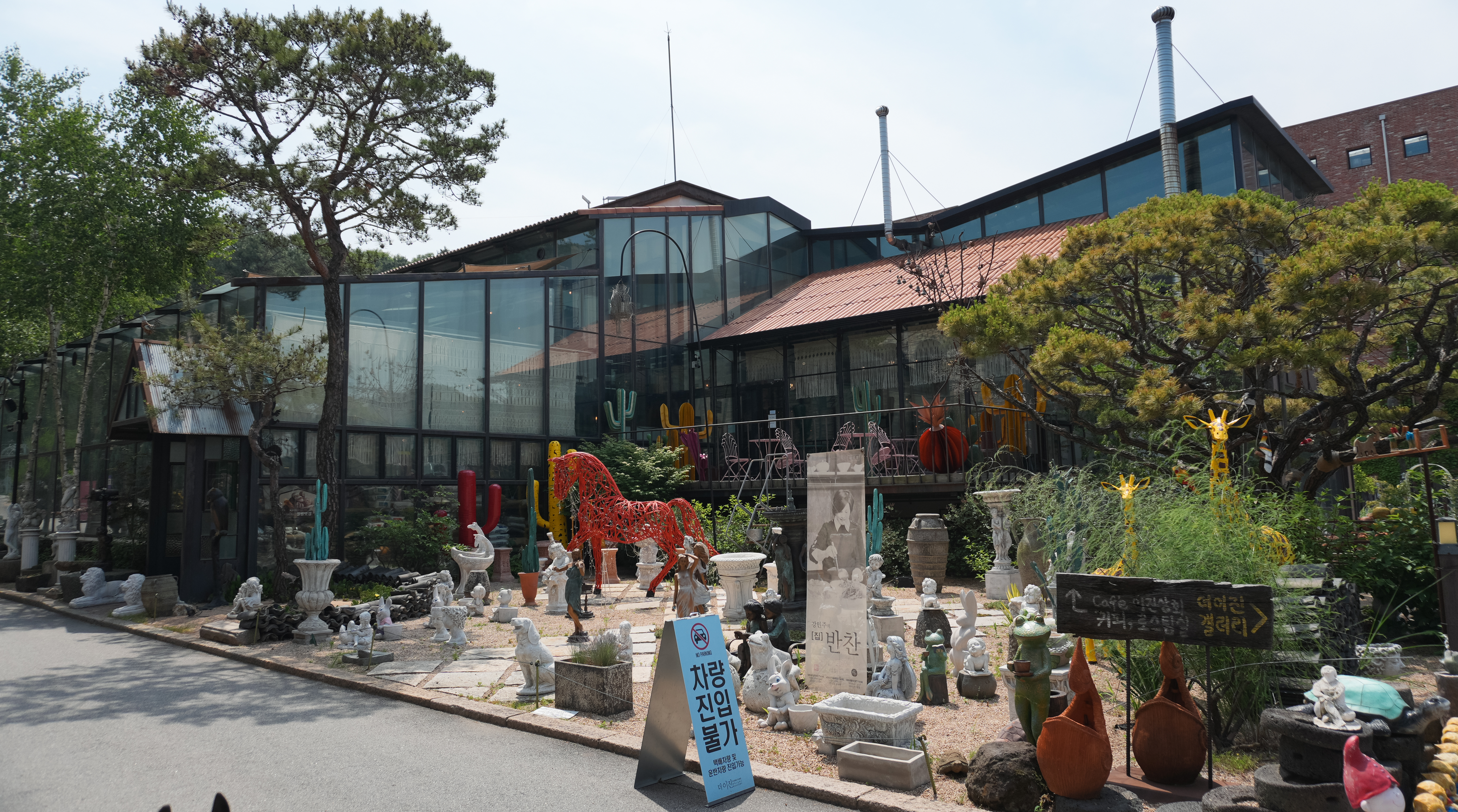 이진상회 카페 외부에는 각종 도자기들과 전시물이 있었습니다. 가게는 전체적으로 녹이 슨듯한 철판을 이용해 황갈색톤을 하고 있었습니다. 가게 곳곳에 놓인 토기들도 마침 비슷한 색상이라 톤앤매너가 잘 어울린다고 볼 수 있었죠. 특히 곳곳에 있는 토기들은 정원 가꾸기 좋아하시는 분들이 좋아할 만한 아이템들로 가득했습니다.