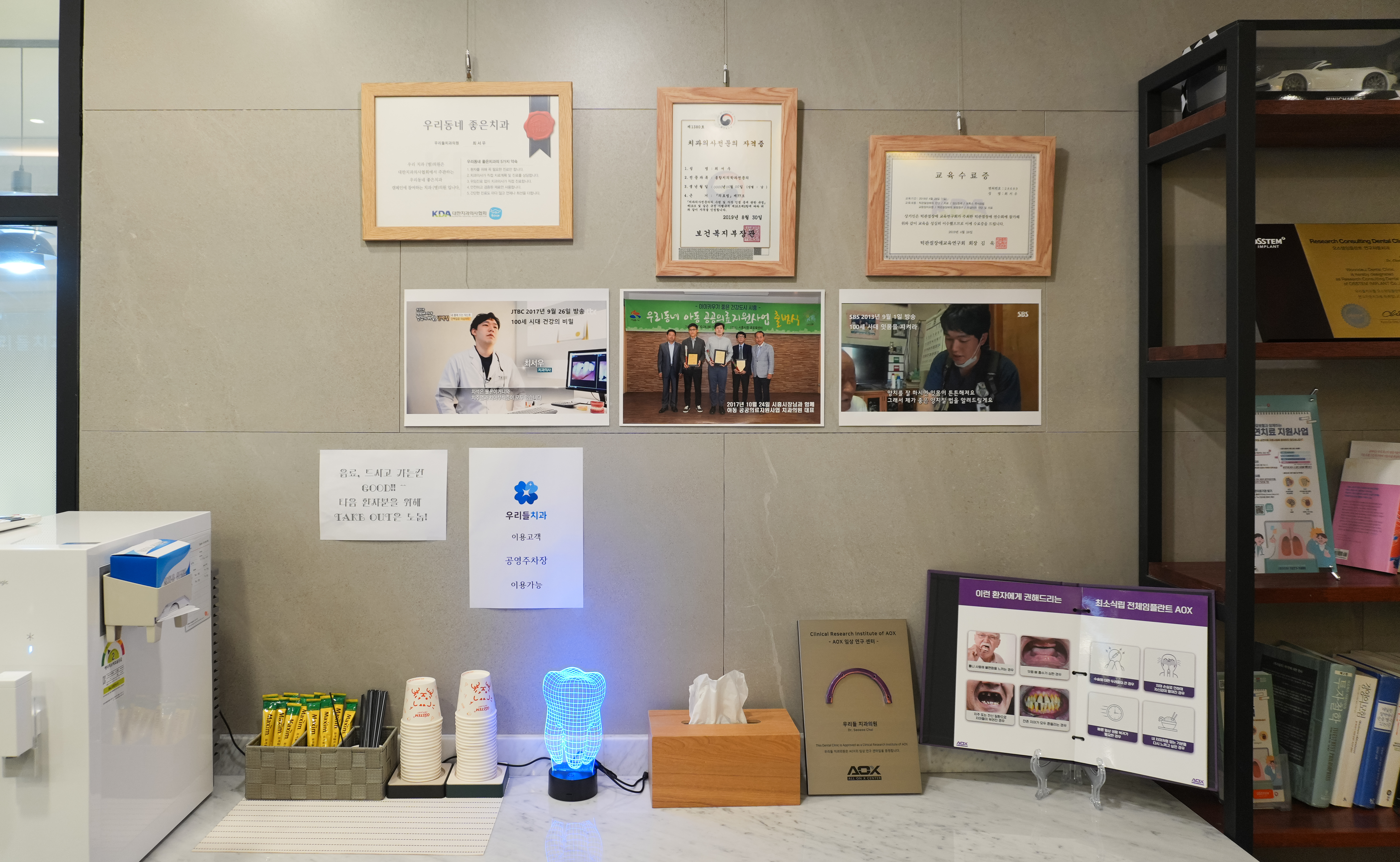 우리들치과 내부를 살펴보시면 깔끔하고 편안한 실내 분위기를 느낄 수 있었습니다. 특히 충치치료, 잇몸치료 그리고 임플란트를 잘하는 치과인 만큼 치과에는 최소식립 전체 임플란트에 대한 안내가 적힌 배너를 볼 수 있었습니다. 가끔 주위에서 임플란트를 하거나, 잇몸치료 이야기를 듣다 보면, 스케일링 같은 주기적인 관리만 잘해주면 큰돈 안 들이고도 오래도록 건강한 치아를 유지할 수 있다는 것에, 제 가치관은 평소에 치아 관리를 잘해주어야겠다고 생각이 있습니다.