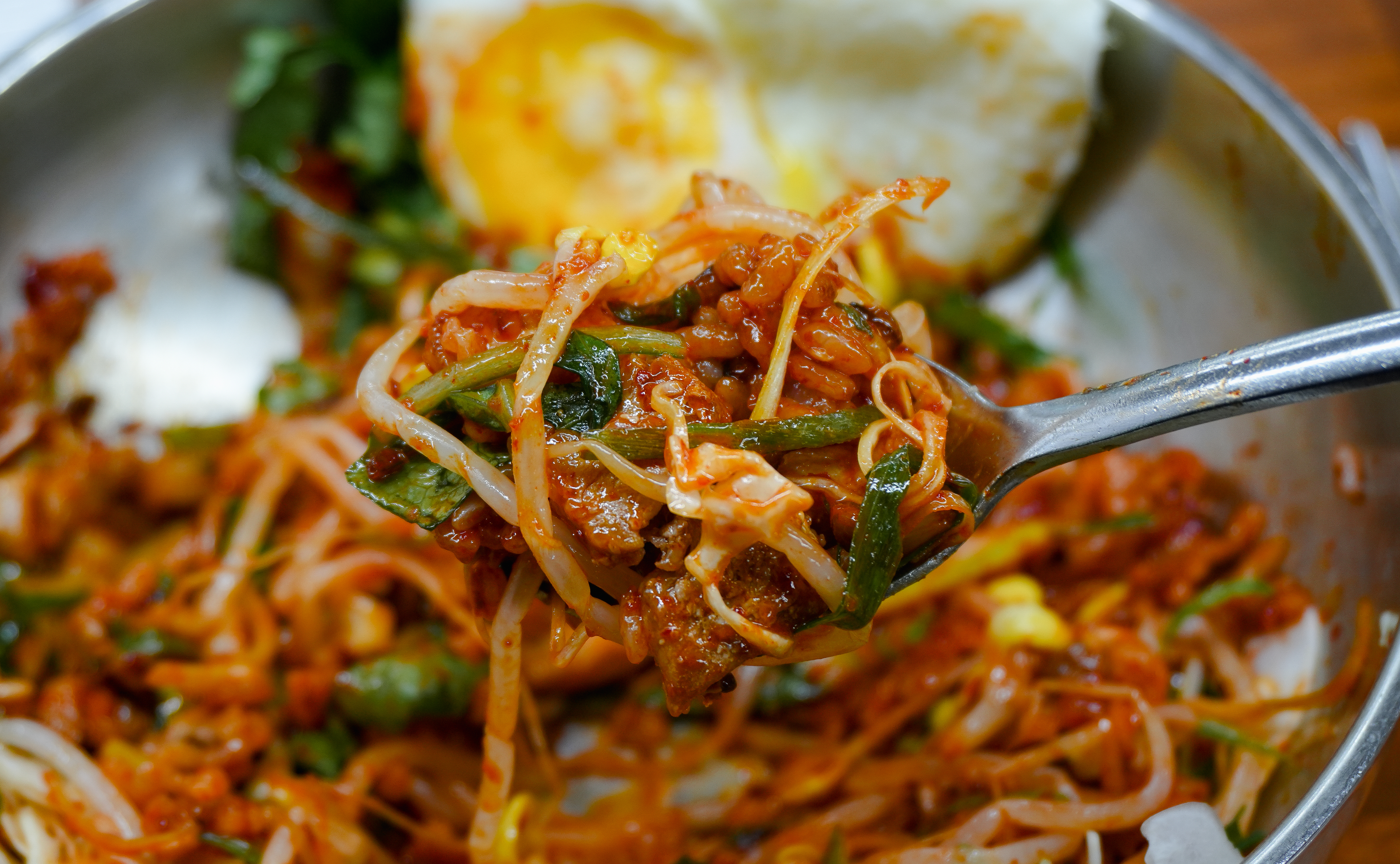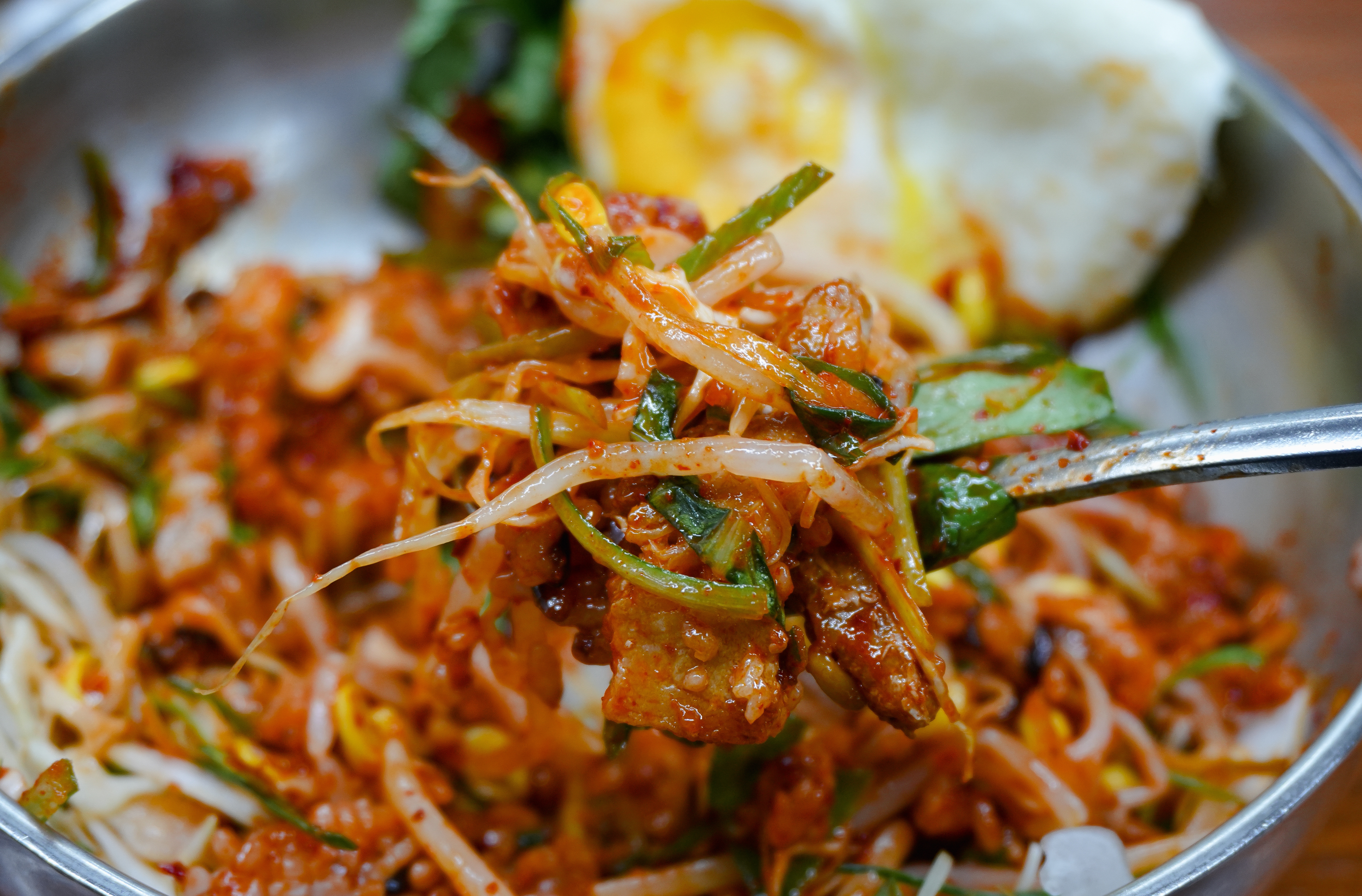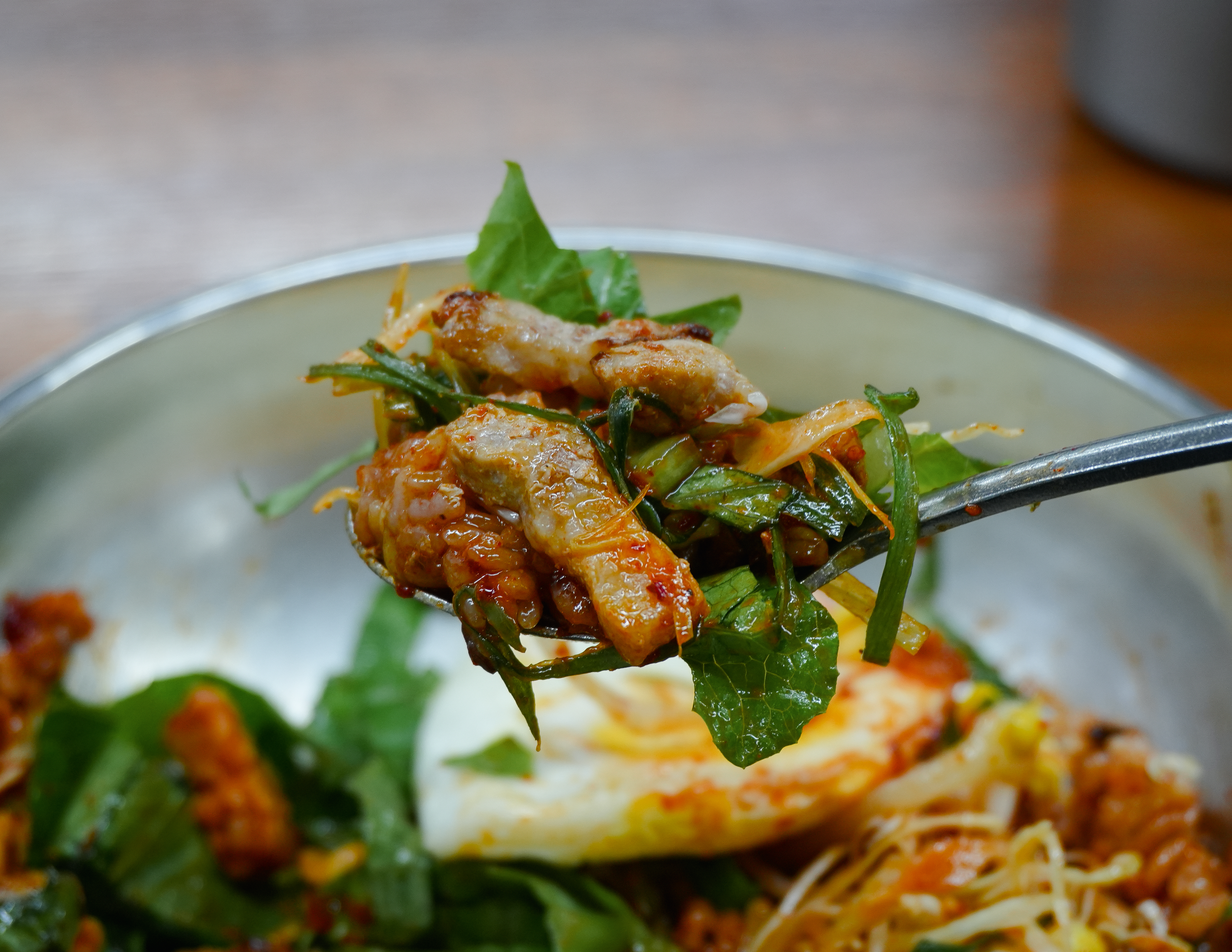 청주 그집에가면 삼겹살 비빔밥의 모습은 위와 같습니다. 삼겹살 비빔밥에는 잘 구워진 삼겹살에 콩나물, 파채, 양배추채, 깻잎, 고추장 등이 들어있었습니다. 보통의 비빔밥에 나물이 들어가는 것과는 사뭇 다르죠(?). 가만히 생각해 보면 콩나물, 파채, 깻잎 등의 재료들은 삼겹살 구워 먹을 때 같이 곁들이는 채소들이더라고요.