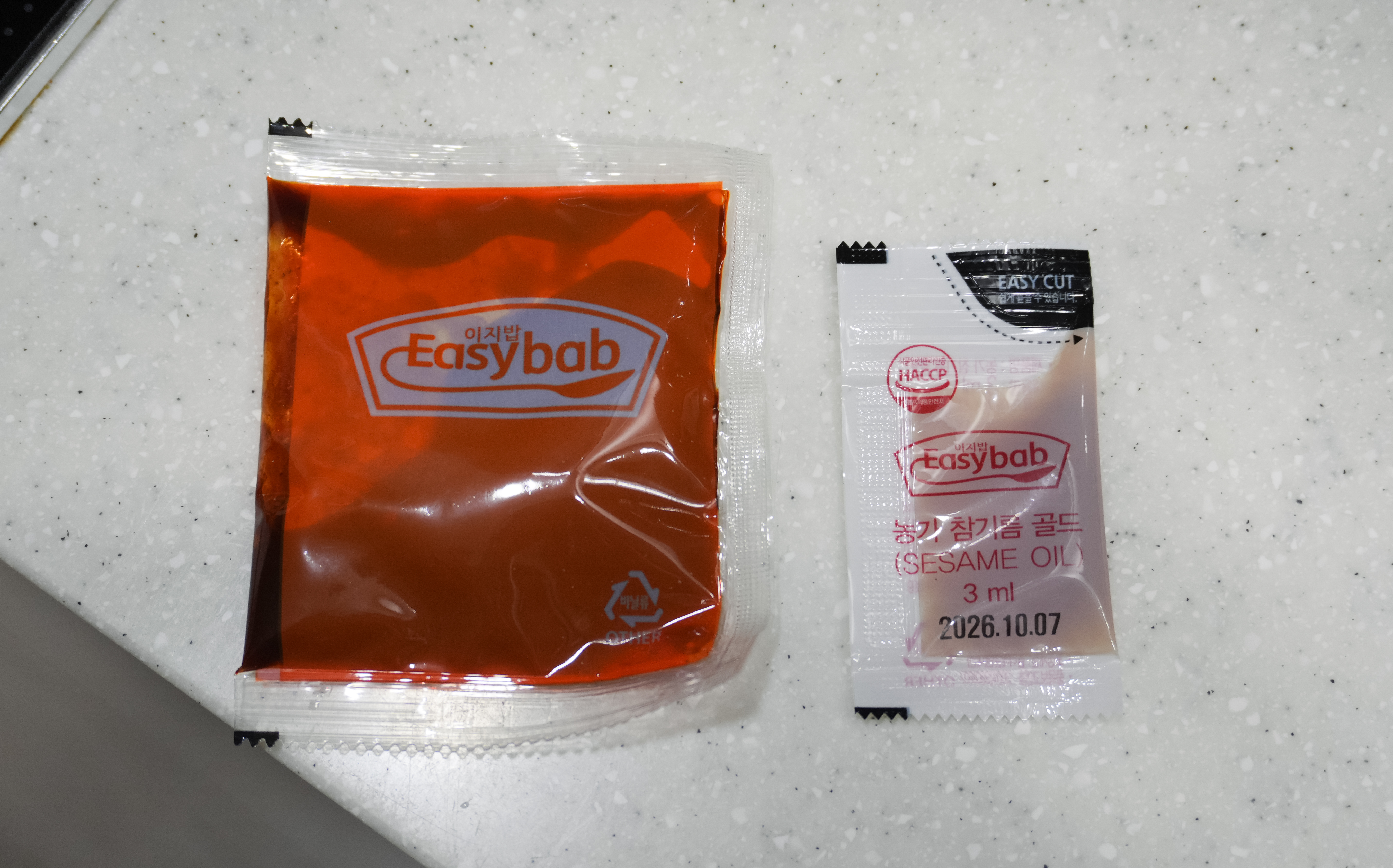 쇠고기비빔밥 제품의 구성은 위와 같습니다. (1)비빔밥 본품과 숟가락, 그리고 (2)발열체봉투 그리고 숟가락이 있었습니다. 비빔밥 본품에는 비빔장과 참기름 두 가지가 들어있었습니다.