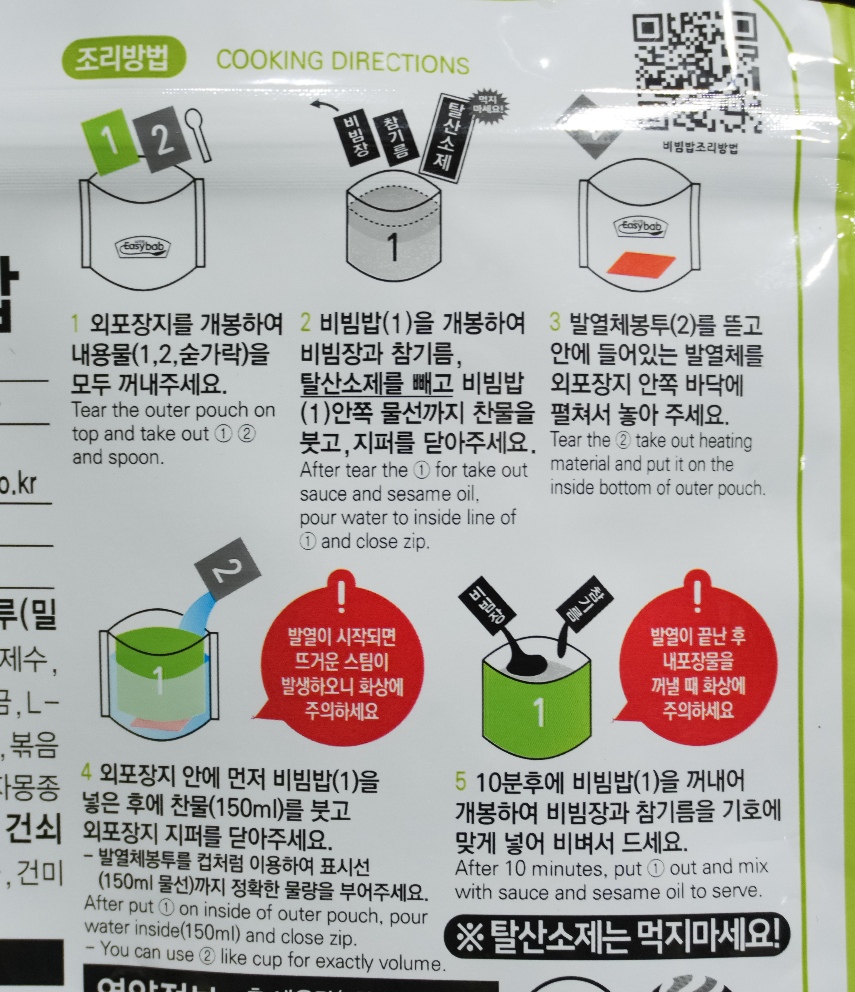 핫앤쿡 쇠고기비빔밥 전투식량의 조리방법은 위와 같습니다. ➊ 외포장지를 개봉하여 내용물(1, 2, 숟가락)을 모두 꺼내주세요. ➋ 비빔밥(1)을 개봉하여 비빔장과 참기름, 탈산소제를 빼고 비빔밥(1)안쪽 물선까지 찬물을 붓고, 지퍼를 닫아주세요. ➌ 발열체봉투(2)를 뜯고 안에 들어있는 발열체를 외포장지 안쪽 바닥에 펼쳐서 놓아주세요. ➍ 외포장지 안에 먼저 비빔밥(1)을 넣은 후 찬물(150㎖)를 붓고 외포장지 지퍼를 닫아주세요. ➎ 10분 후에 비빔밥(1)을 꺼내어 개봉하여 비빔장과 참기름을 기호에 맞게 넣어 비벼서 드세요.