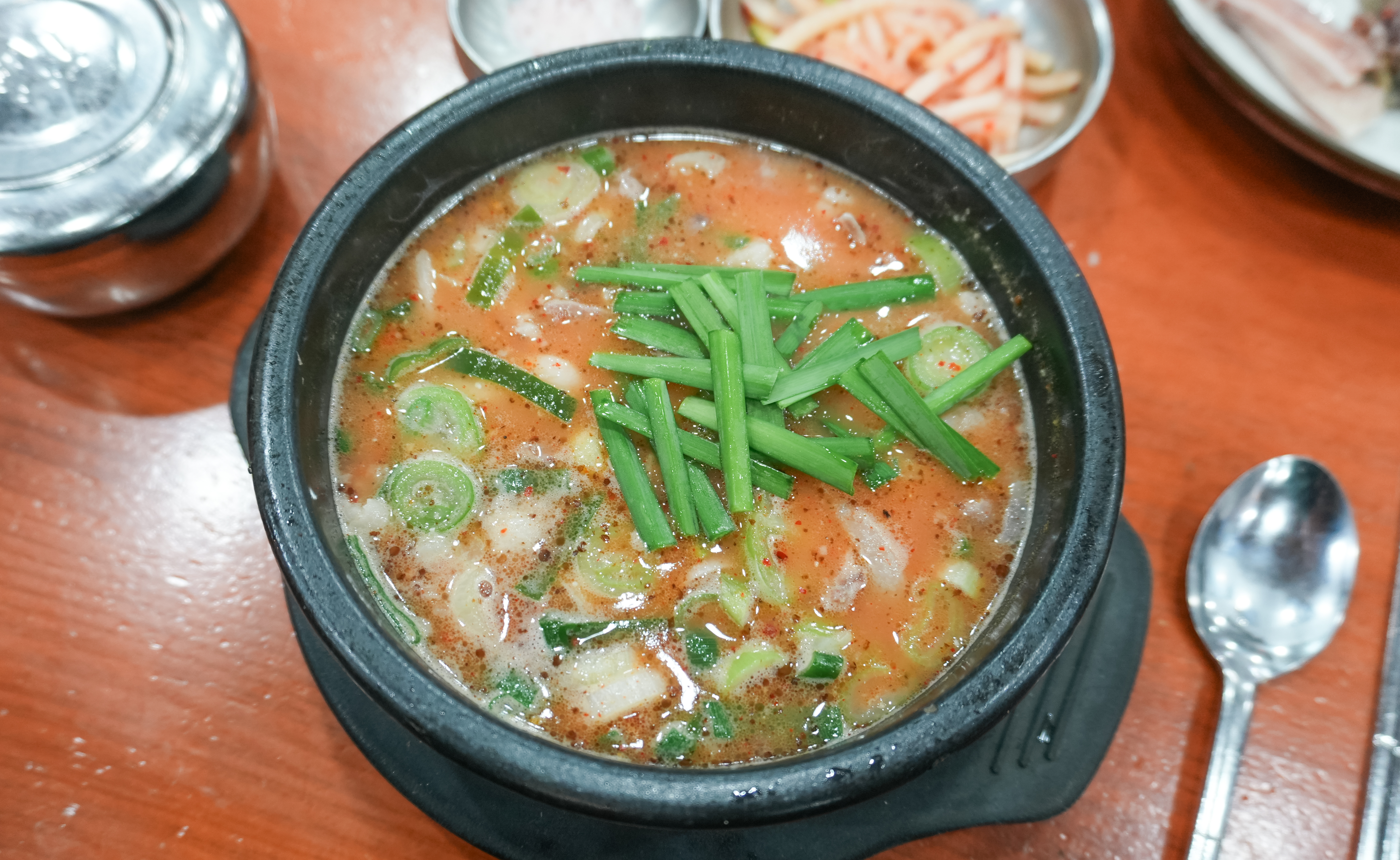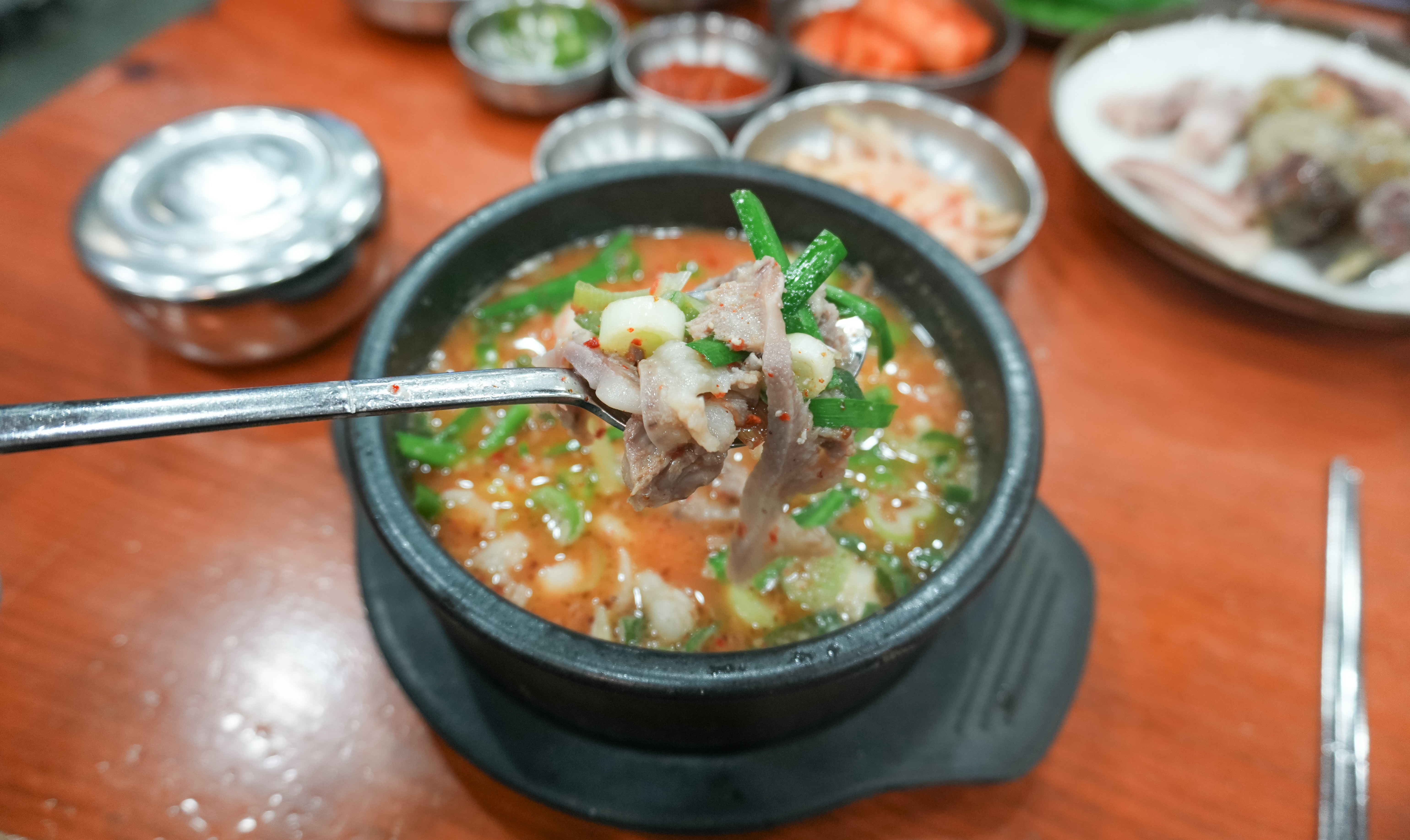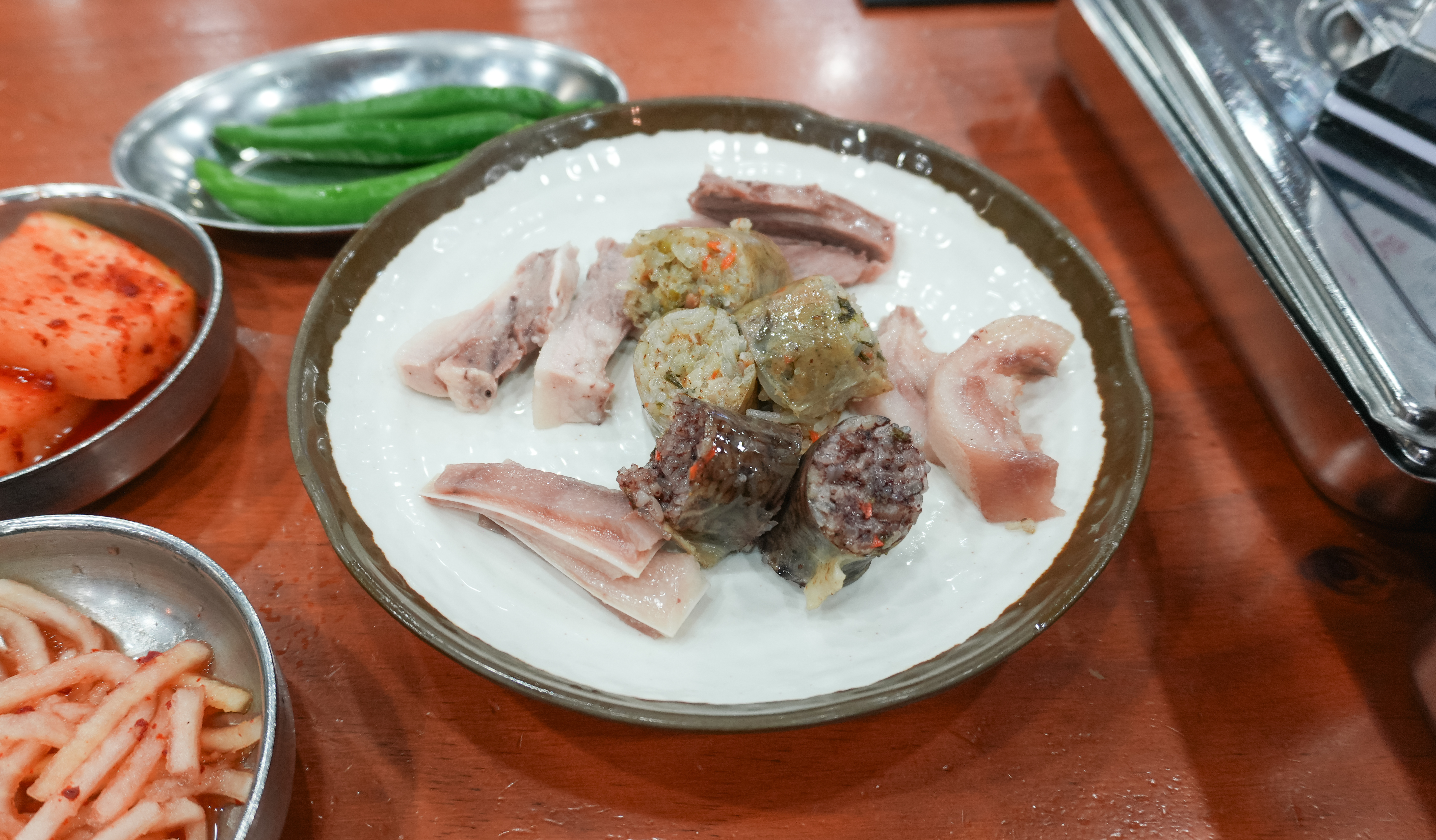 함경도찹쌀순대의 순대국정식은 위와 같이 나왔습니다. 정식에 나오는 수육과 순대 몇 가지 그리고 순대국이 나왔는데, 순댓국은 얼큰한 양념장이 들어있어 맛있었고, 부추와 섞박지, 무생채 같은 반찬들도 순대국과 같이 곁들이면 좋았습니다.