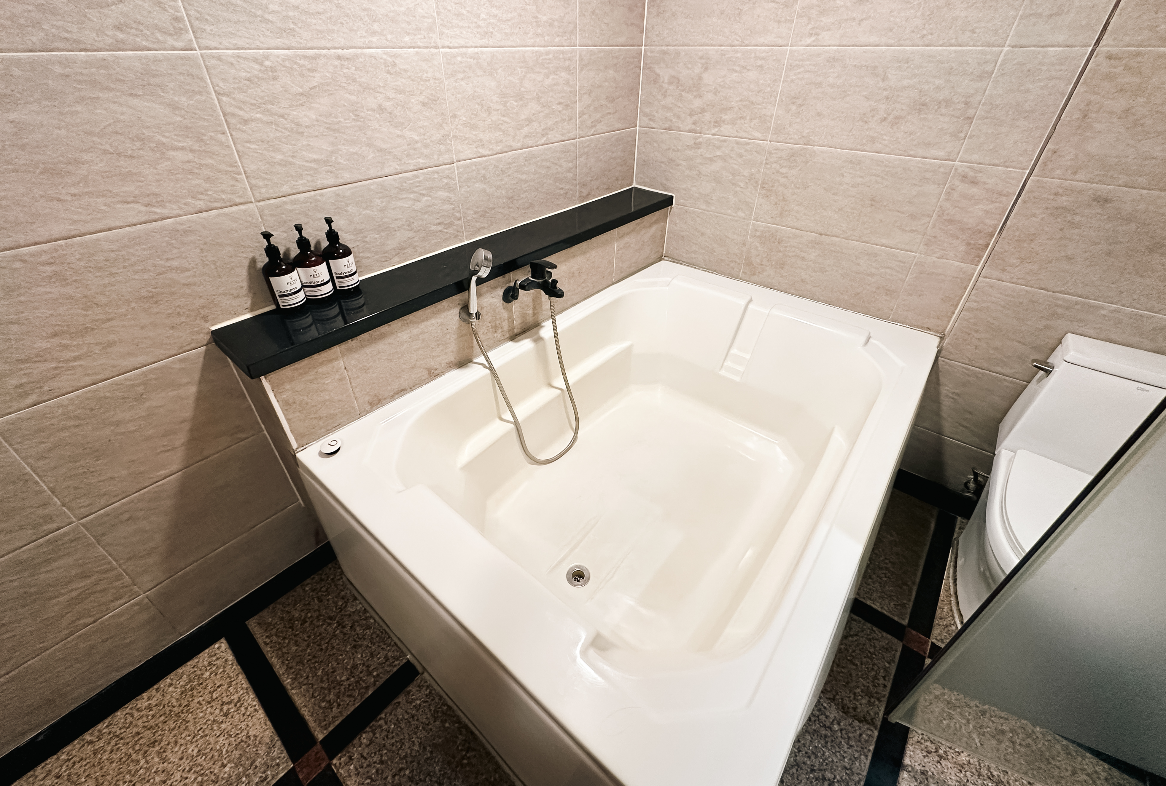 욕실에는 성인 2명도 들어갈(?) 커다란 욕조가 있었고, 세면대와 샤워부스가 있었습니다. 가끔 피곤한 날이면 욕조에 물 담아두고 몸 녹이면 피로도 싹 풀리고 너무 좋더라고요. 이제 가장 궁금하셨을(?) 퇴실시간에 대한 정보를 드리겠습니다. 쁘띠호텔의 퇴실시간은 오후 3시. 보통 빠르면 11시 늦더라도 1시쯤이 많은데, 여기는 여유 있게 퇴실할 수 있어서 가끔 일정 없을 때는 뒹굴거리기도 하고 노트북 가져와서 일도 하고 한답니다.