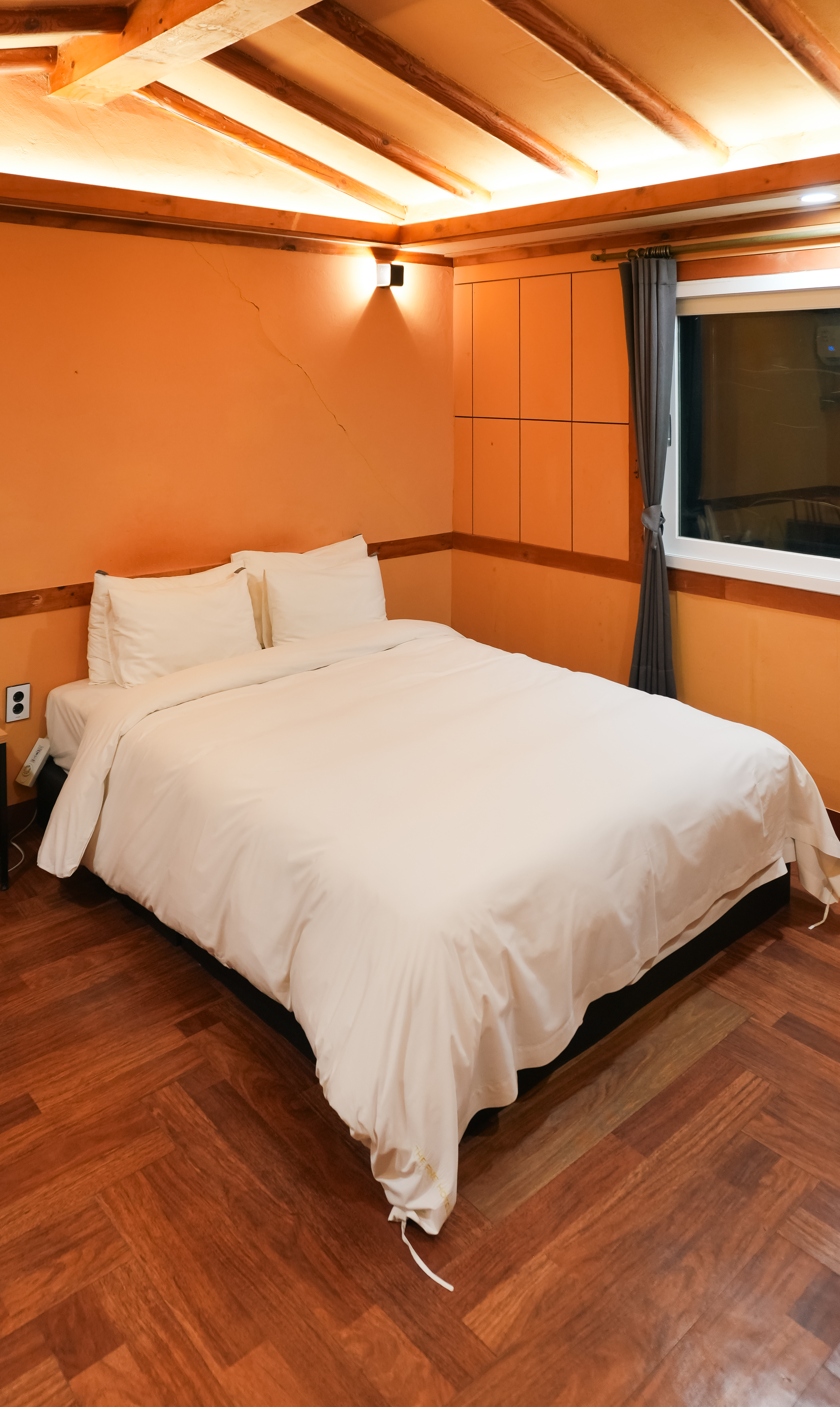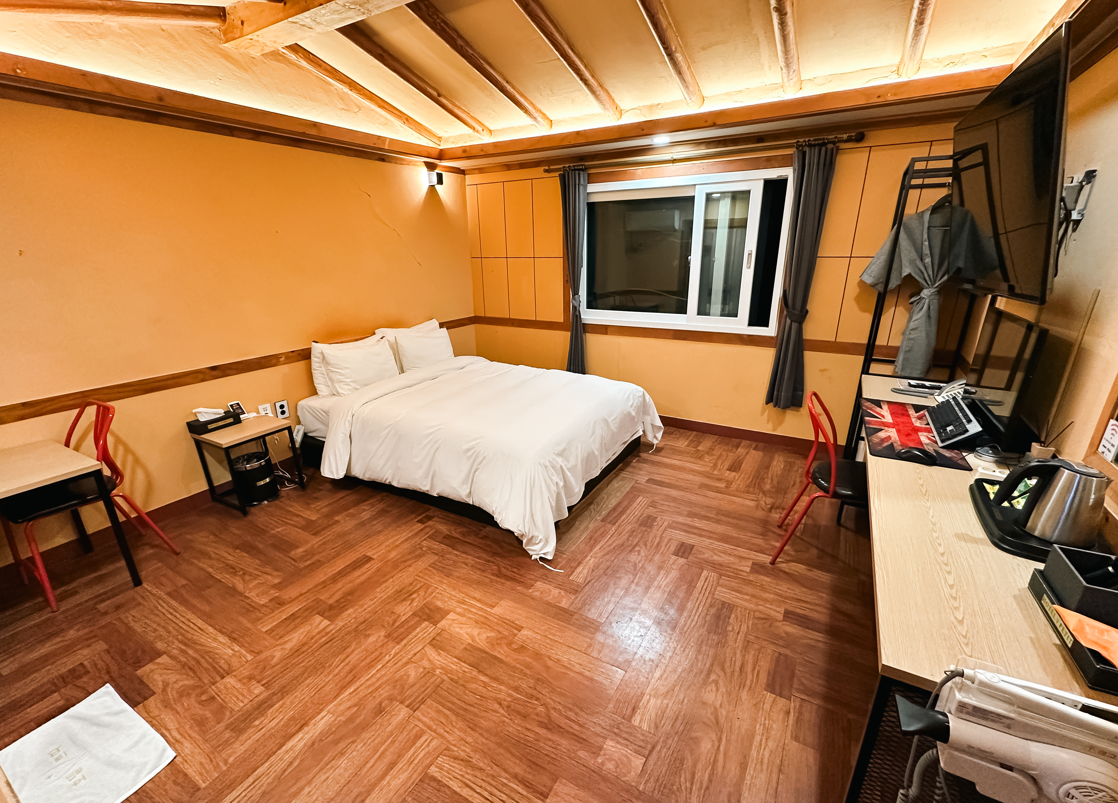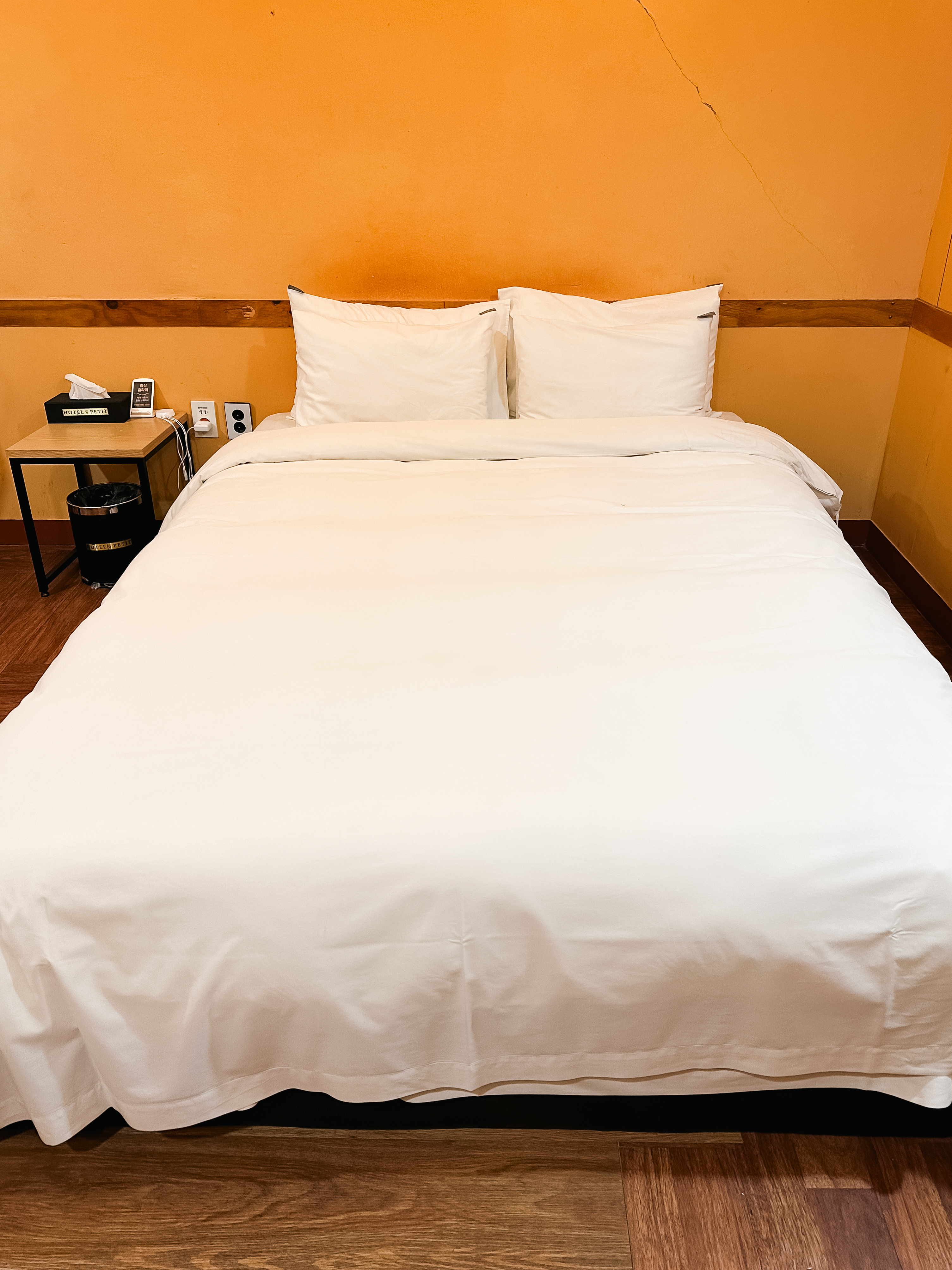 쁘띠호텔 침실의 모습은 위와 같았고, 방의 크기는 혼자서 숙박하기엔 꽤 넓은 편이었습니다. 특히 황토방처럼 되어있는 호텔의 방은 나름 분위기도 아늑했고, 따뜻한 느낌이 들어서 좋았습니다.
