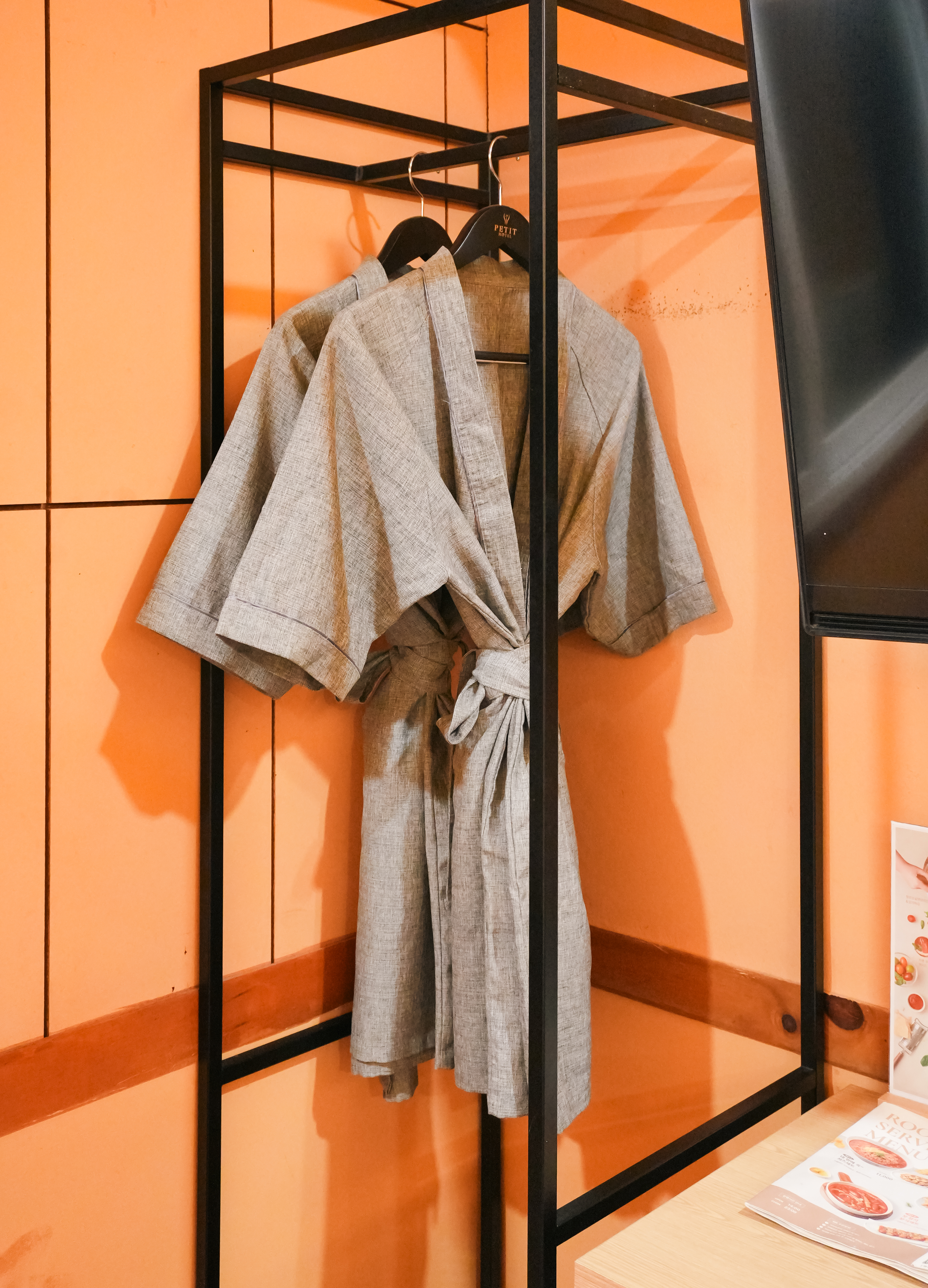 방에는 숙박하면서 입을 가운과 냉장고에 생수와 음료 두 가지가 제공되고 있었습니다. 쁘띠호텔에는 간단한 어매니티가 제공되고 있었는데, 면도기, 칫솔, 치약, 세면용품 등이 들어있었습니다. 에어컨을 틀어보니 깨끗하게 관리되어 있어서 마음 놓고 이용할 수 있었습니다.