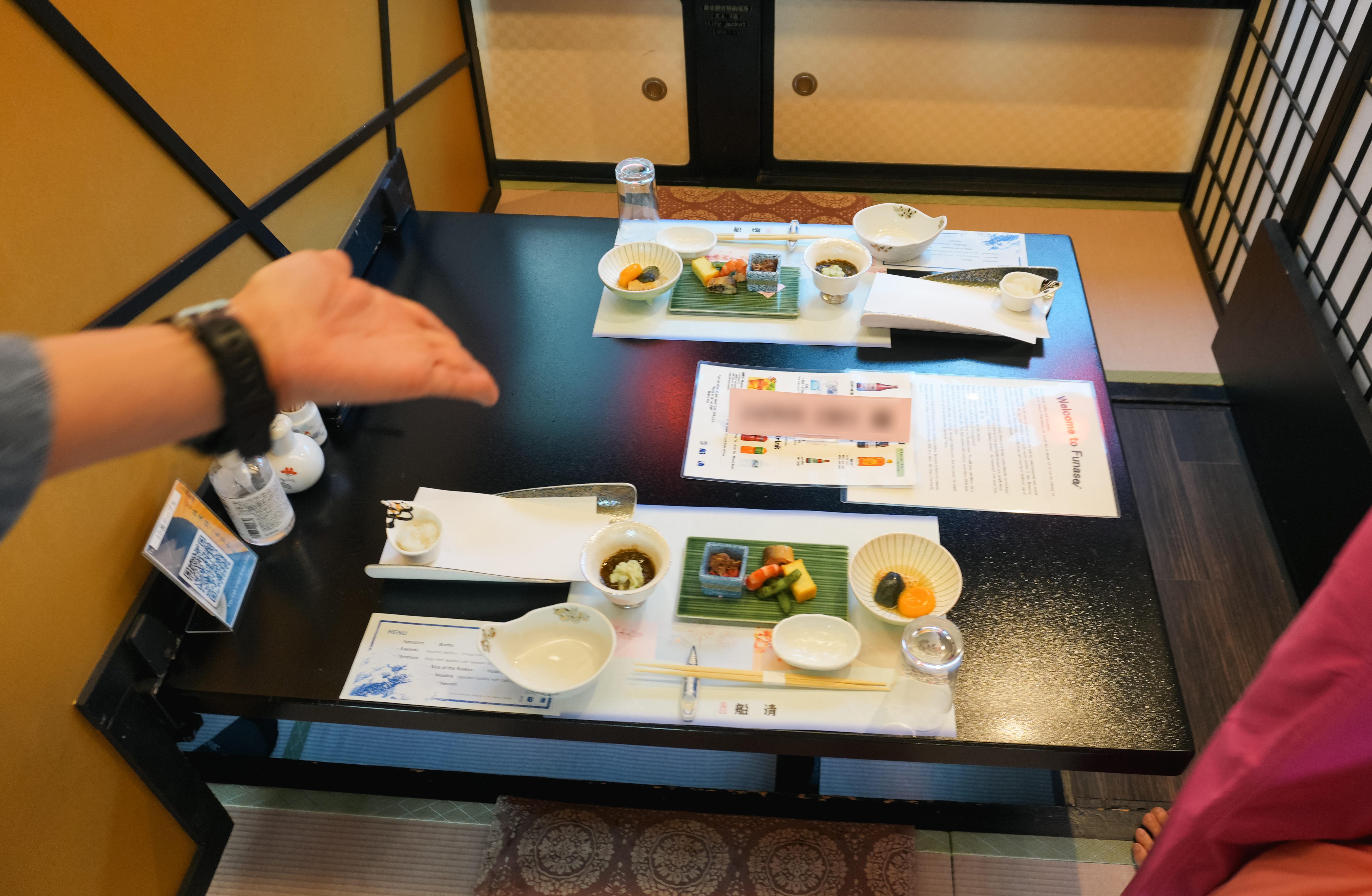 야카타부네 놀잇배 디너크루즈에 승선을 시작했습니다. 승선할 때는 신발을 벗고 탑승하였고, 각자 예약한 대로 지정된 자리가 마련되어 있어서, 안내를 받아 제 자리에 가서 앉았습니다. 저는 보트의 중간쯤이었는데, 주로 방송은 일본어로 하지만 코스에 대한 안내문을 한국어로도 제공하고 있어서 불편함은 없었습니다.