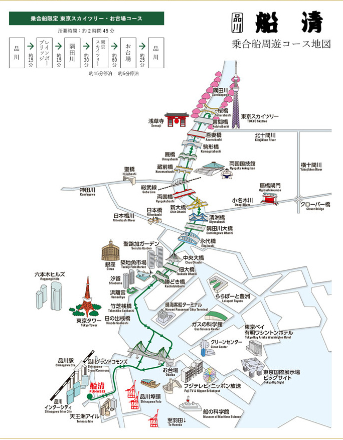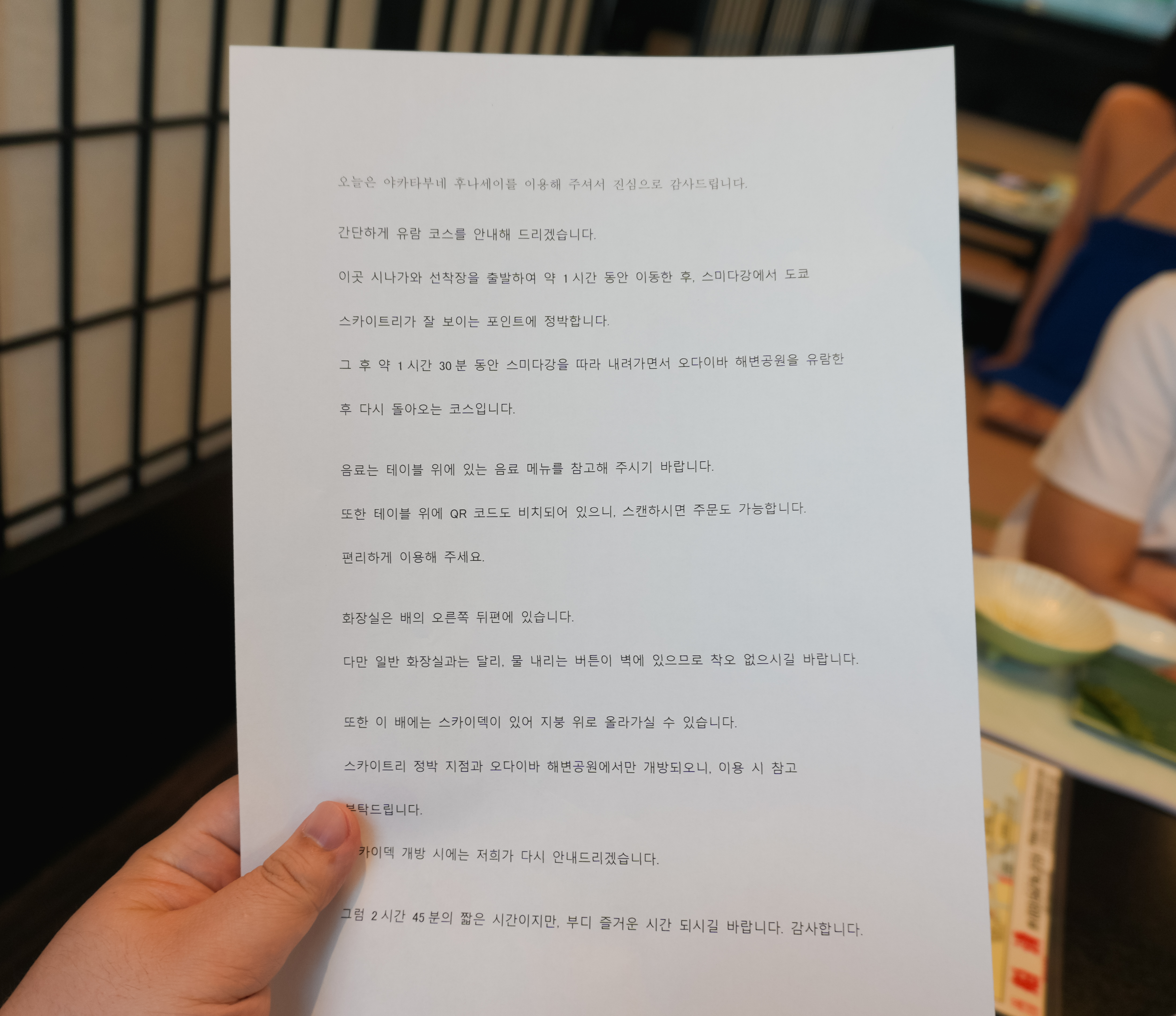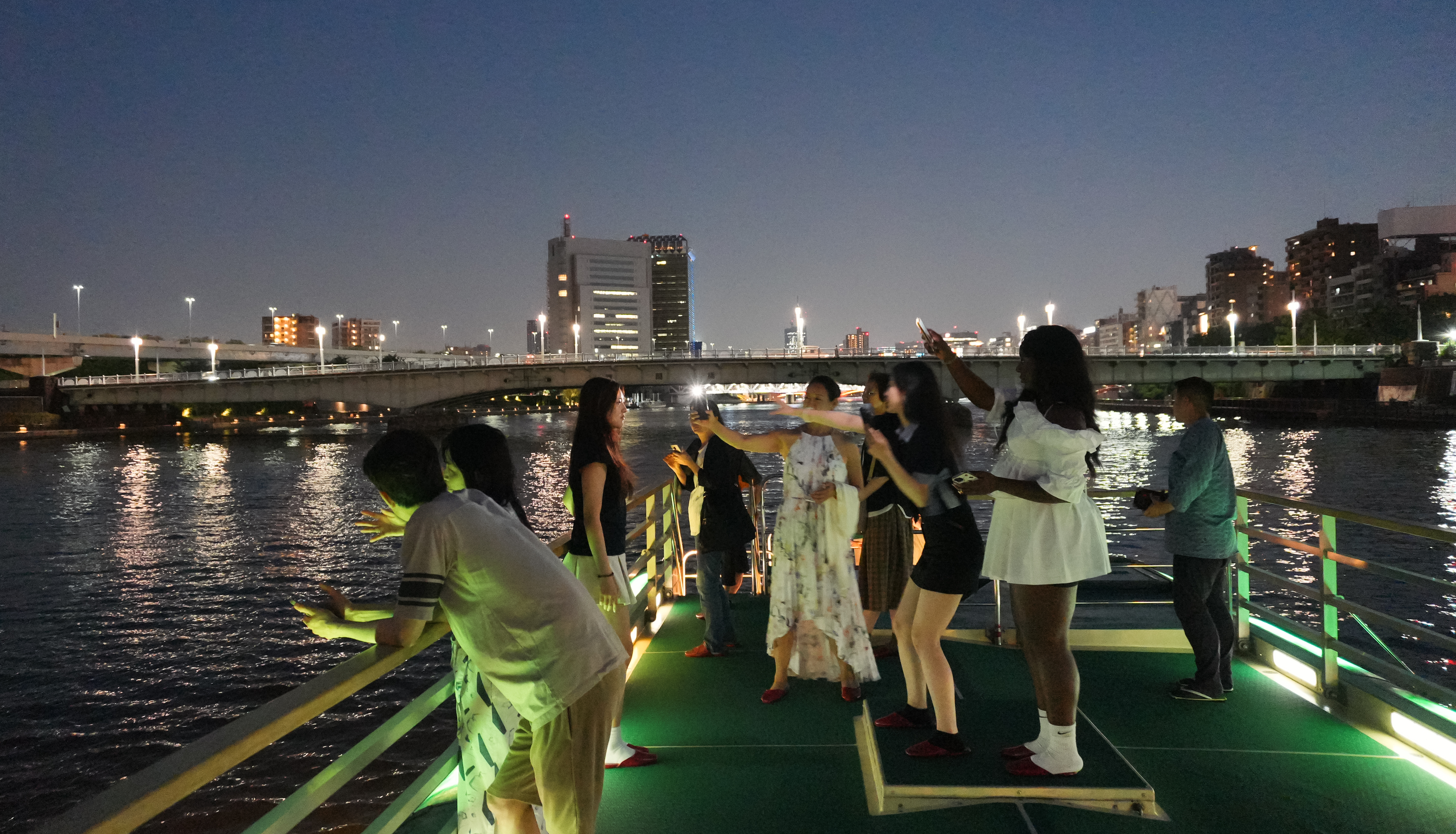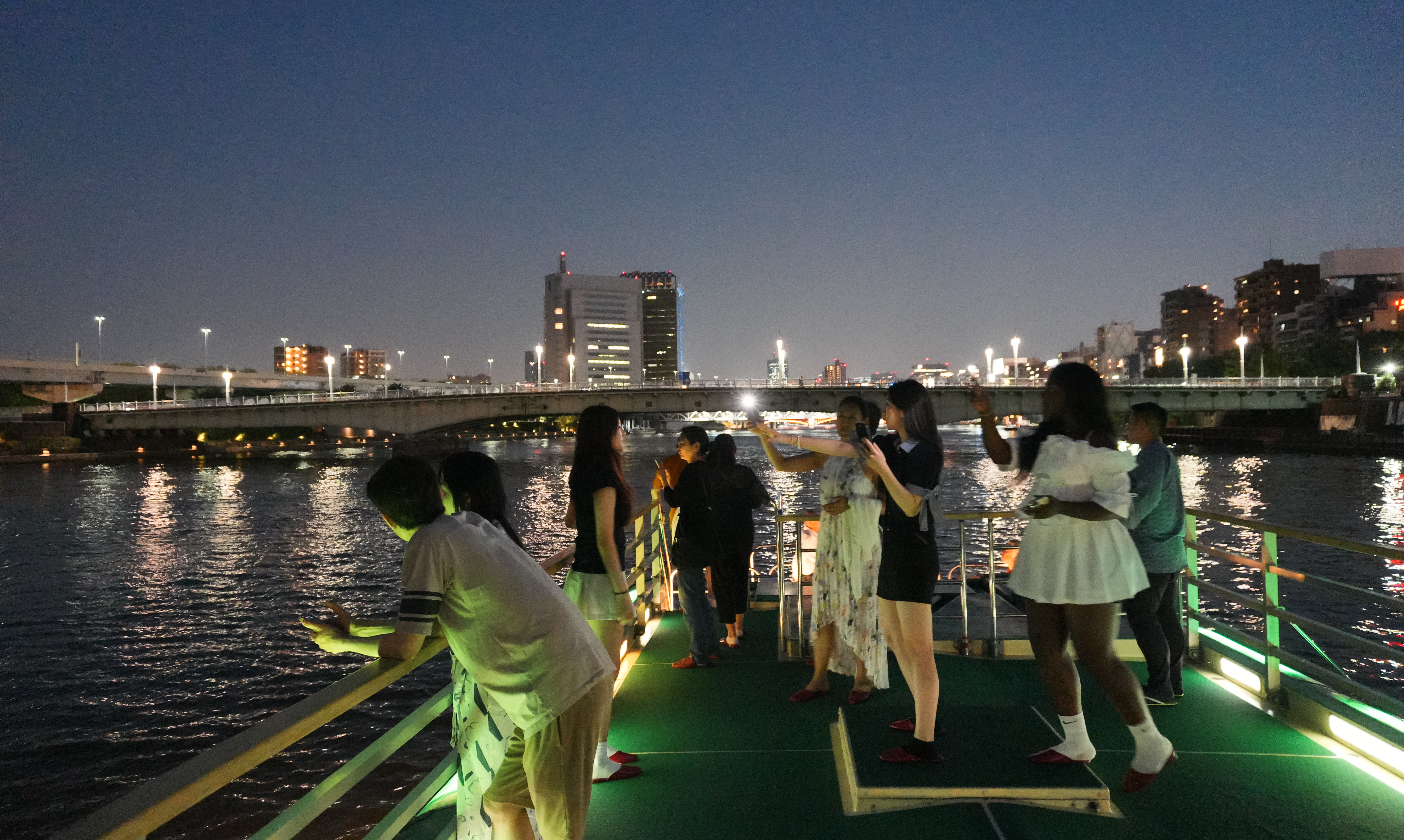 야카타부네는 시나가와 선착장을 출발하여 스미다강에서 도쿄 스카이트리가 잘 보이는 포인트에 정박하고, 약 1시간 30분 동안 스미다강을 따라 내려오면서 오다이바 해변공원을 유랑하고 돌아오는 코스라고 합니다. 총 승선시간은 2시간 45분 정도 된다고 합니다. 그동안 식사도 하고 이야기도 나눌 수 있었습니다.