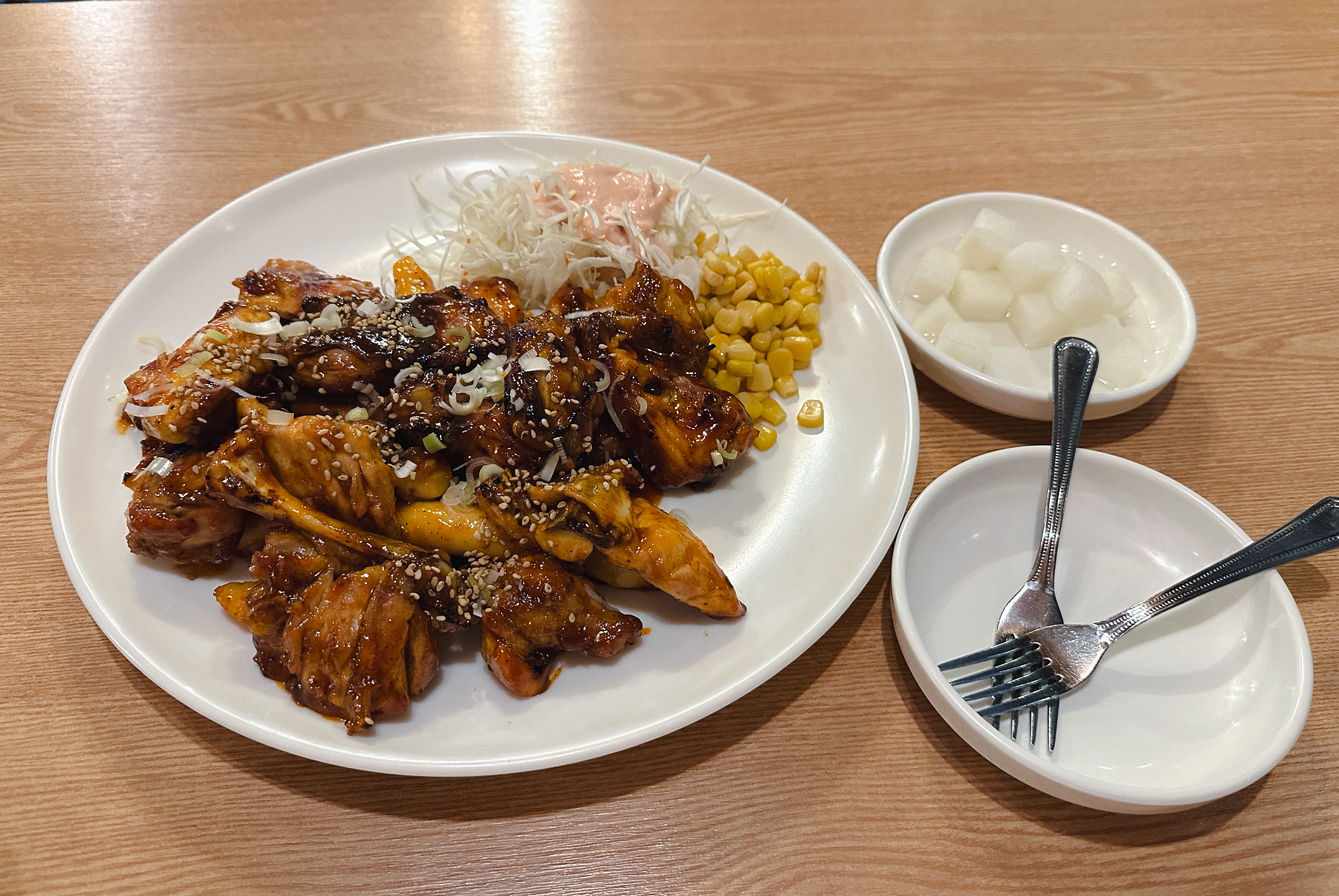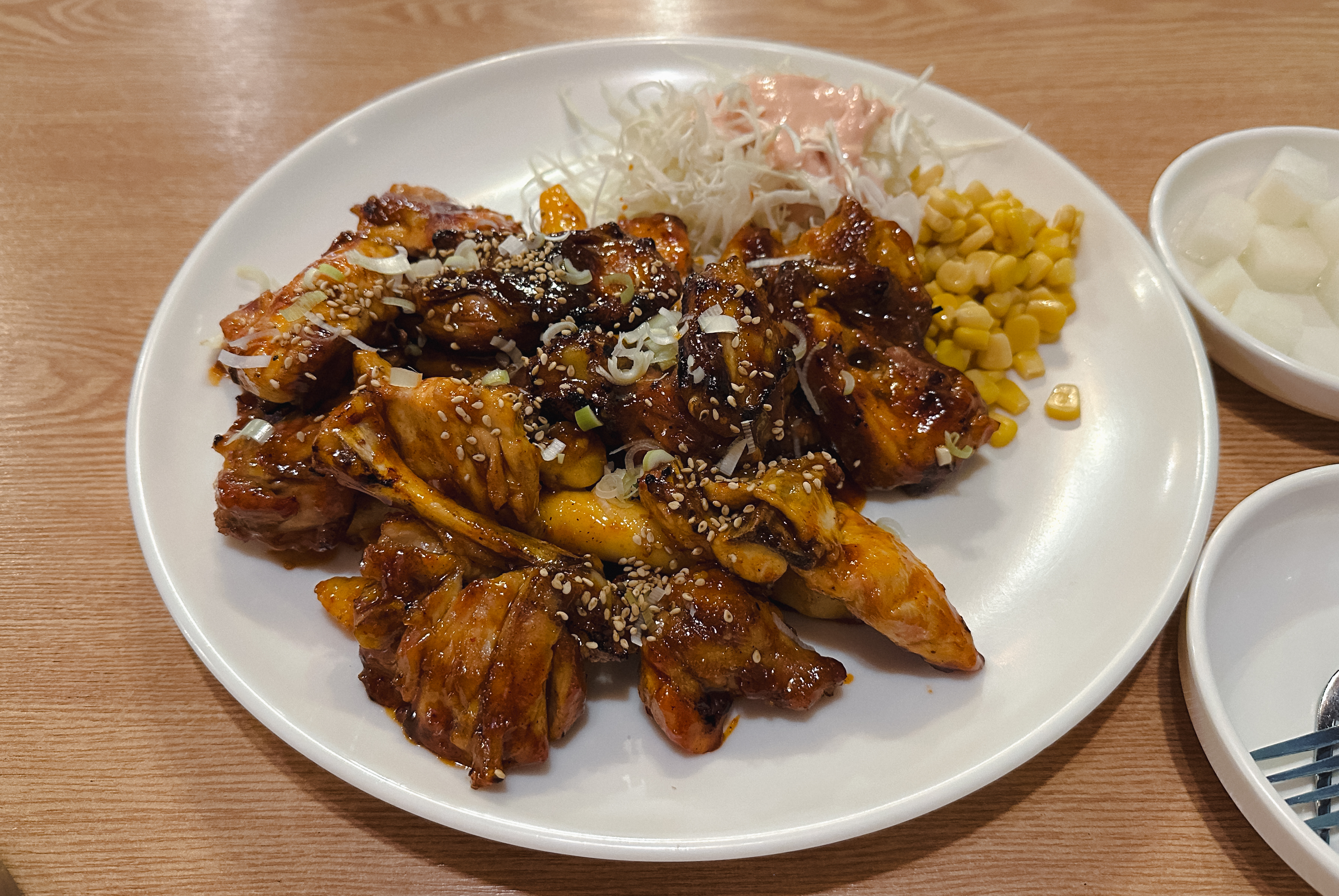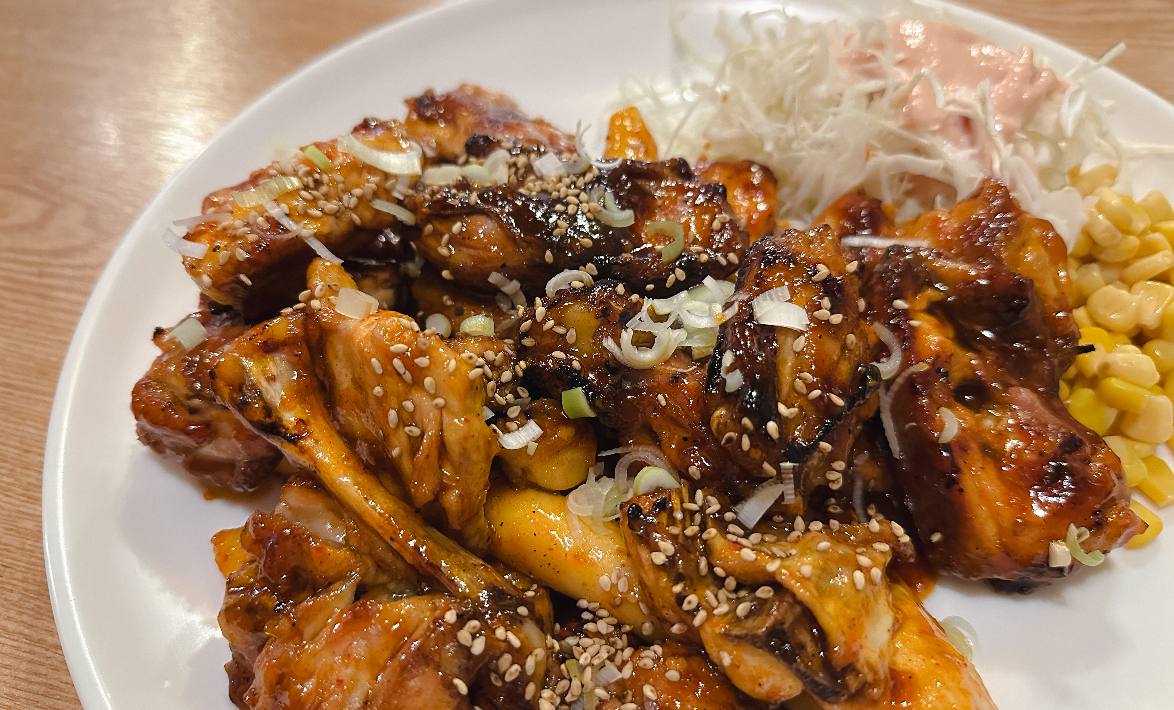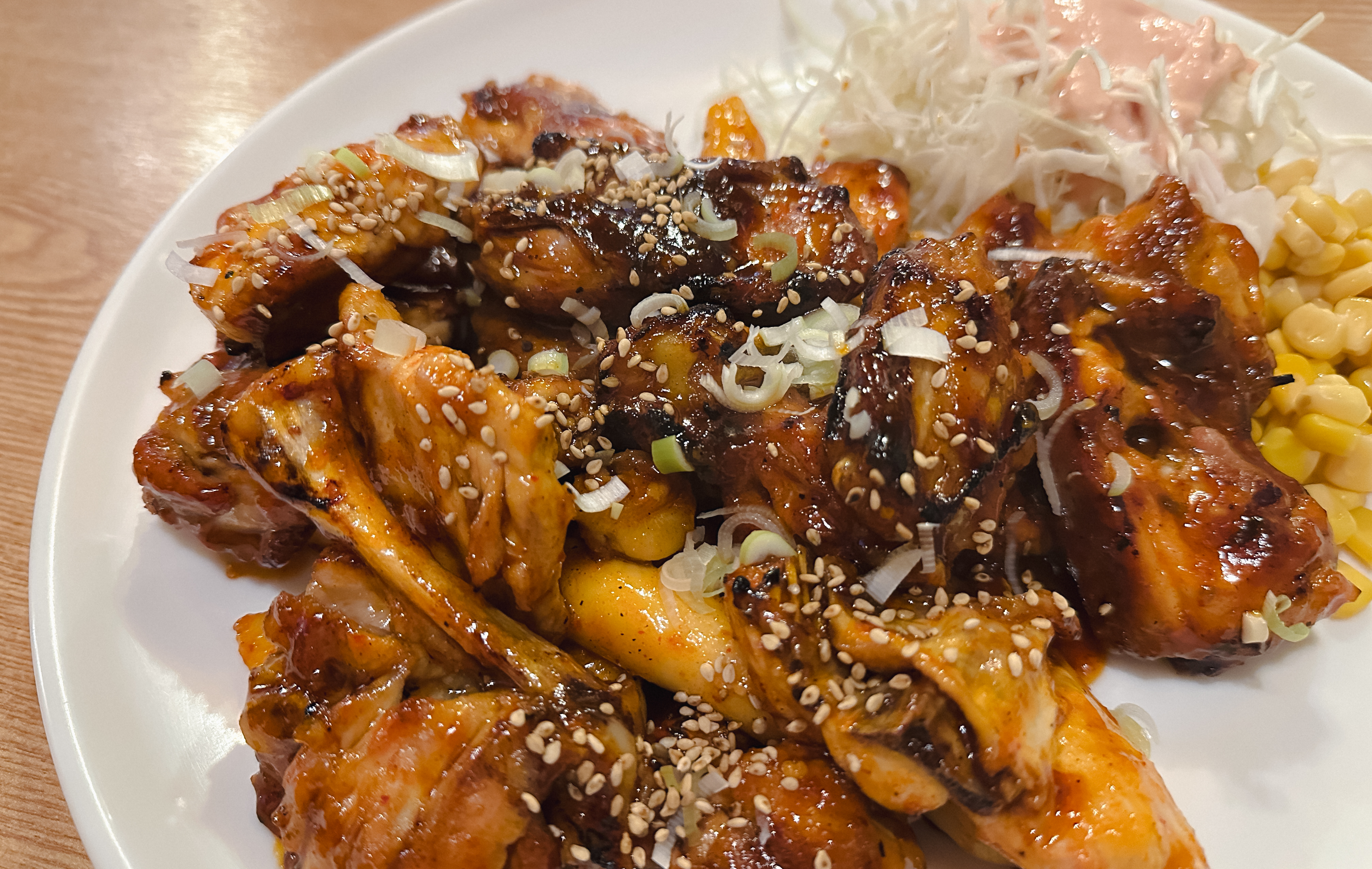 KNC 숯불바베큐의 양념정통바베큐 보통맛이 나왔습니다. 해당 메뉴는 치킨무와 옥수수콘, 양배추샐러드가 함께 제공되었는데, 양념은 살짝 매콤하면서 달짝지근함도 있는 맛이었습니다.