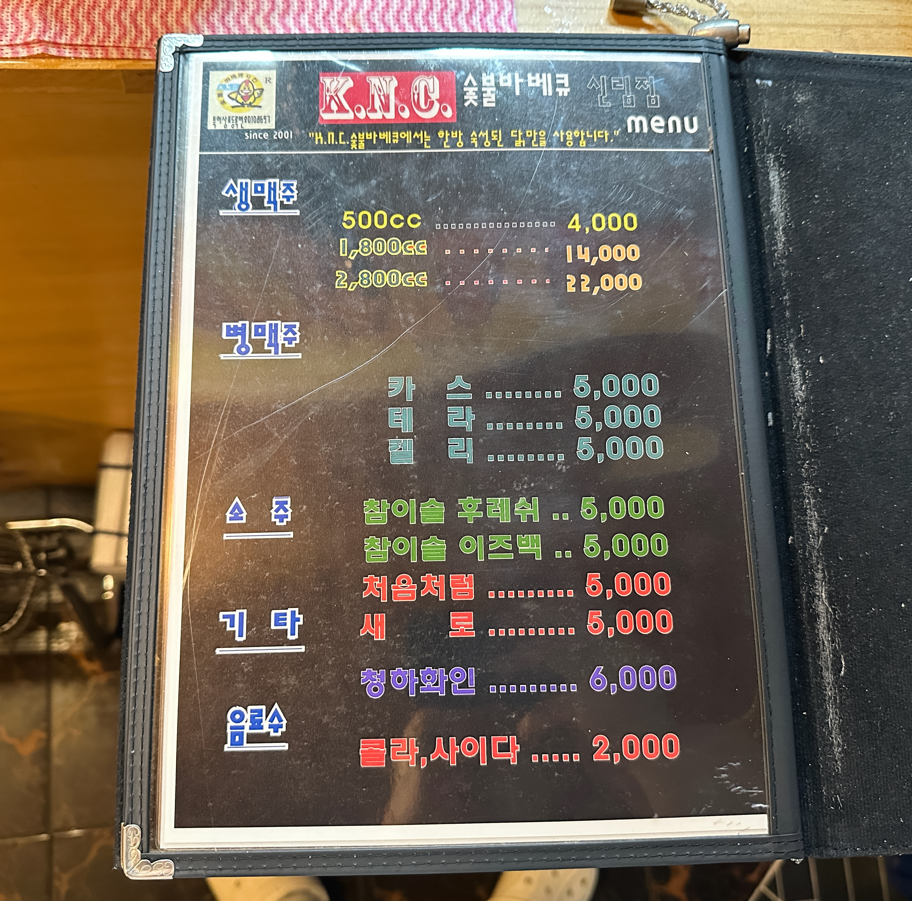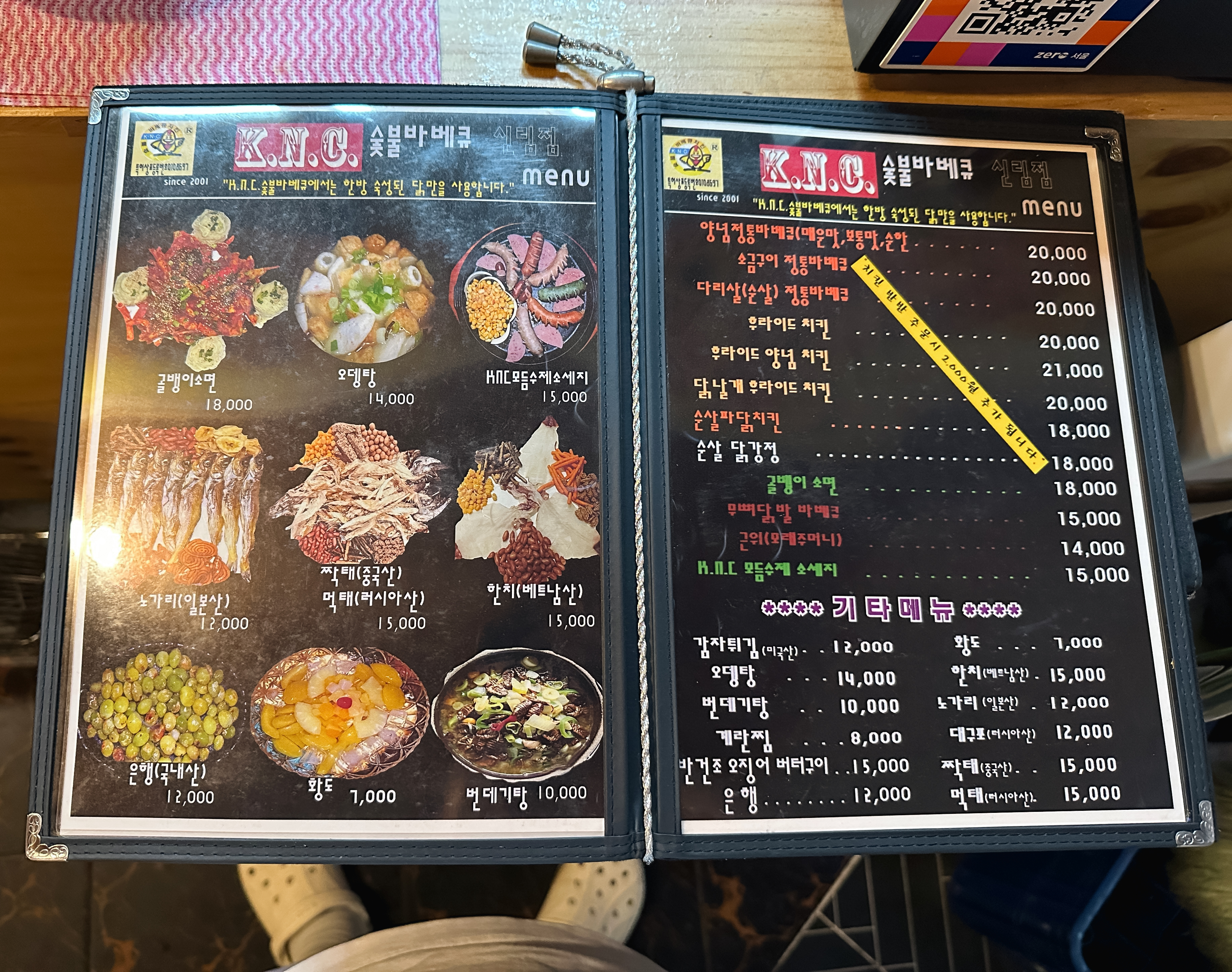 신림동 KNC 숯불바베큐는 양념정통바베큐, 소금구이정통바베큐, 다리살순살정통바베큐, 후라이드치킨, 후라이드양념치킨, 닭날개후라이드치킨, 순살파닭치킨, 순살닭강정, 골뱅이소면, 무뼈닭발바베큐, 근위, KNC모듬수제소시지, 감자튀김, 오뎅탕, 번데기탕, 계란찜, 반건조오징어버터구이, 은행, 황도, 한치, 노가리, 대구포, 짝태, 먹태 등이 있었습니다.
