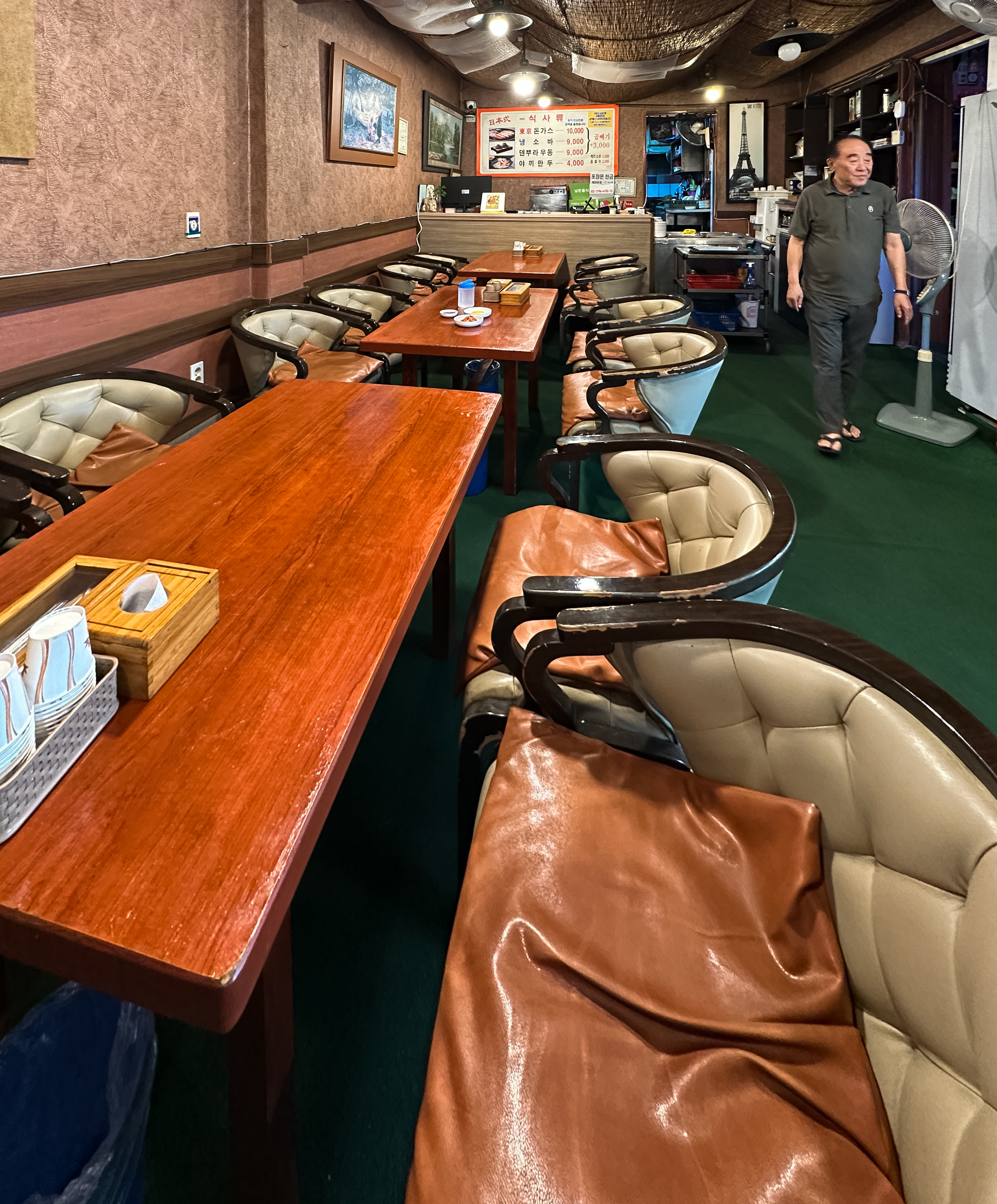동경돈가스 가게 분위기는 위와 같았습니다. 결국은 컨셉이 아니라 나이 지긋하신 할아버지께서 운영하시는 가게였습니다. 이곳은 일본에서 직접 음식점에서 돈카츠를 배워와서, 한국에서 약 26년 이상을 일본식 돈카츠를 판매하고 계신 곳이었습니다. 할아버지 두 분이서 운영하고 계셨는데, 요리하시는 분이 사장님이신 것 같고, 서빙해 주시는 분이 사장님 친구분이라 하시더라고요. 가게 분위기도 그렇지만 가구들도 세월의 흔적이 묻어나는 앤티크 한 모습을 볼 수 있었습니다.