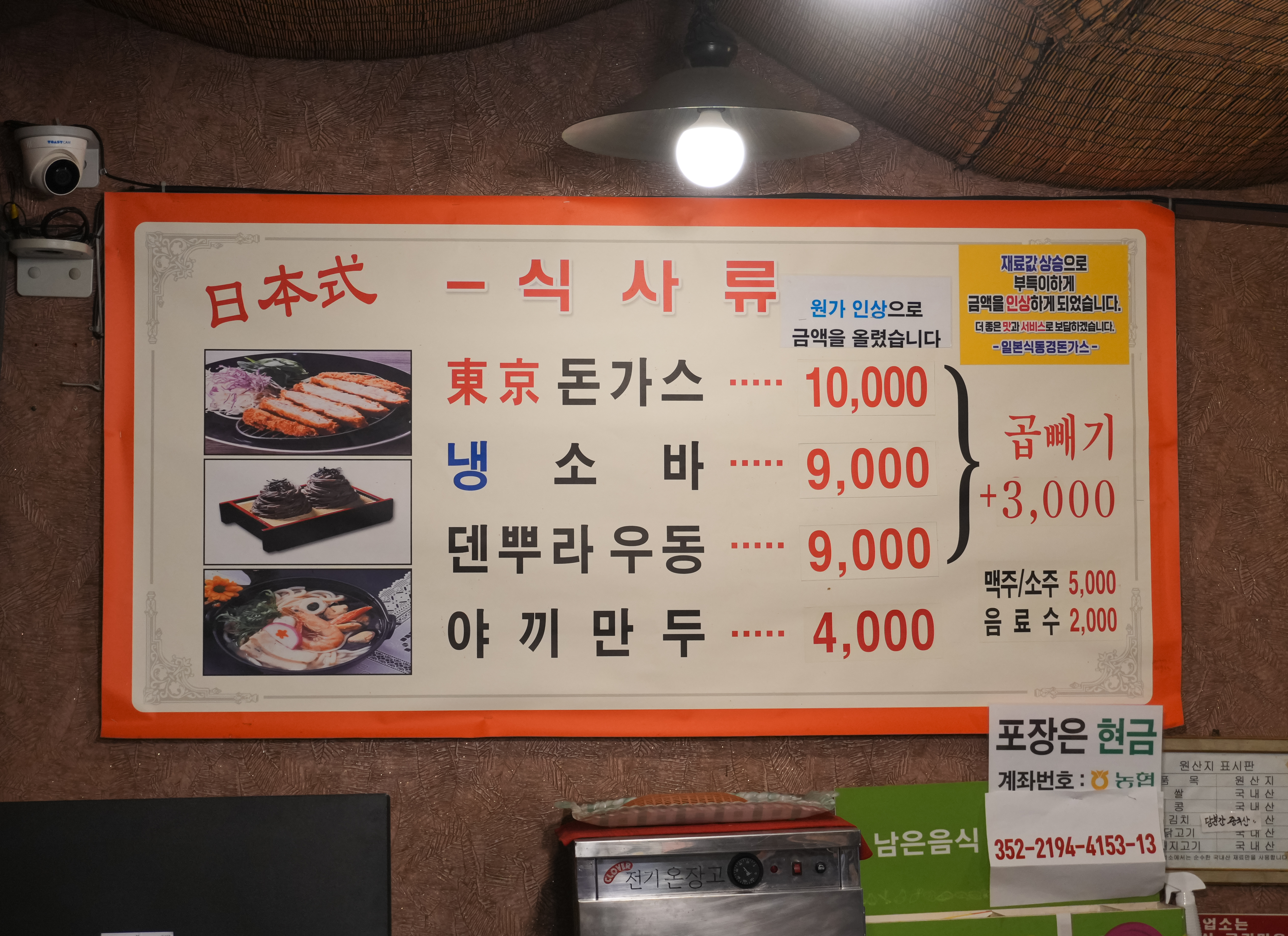 김포 동경돈까스의 메뉴는 東京돈가스, 냉소바, 덴뿌라우동, 야끼만두가 있었습니다. 야끼만두를 제외한 모든 메뉴는 곱빼기가 있었고, 저는 '동경돈가스' 곱빼기와 '냉소바'를 주문했습니다. 메뉴들은 요즘 일본식 돈카츠 시세에 비하면 크게 부담스럽지는 않은 가격대였습니다.