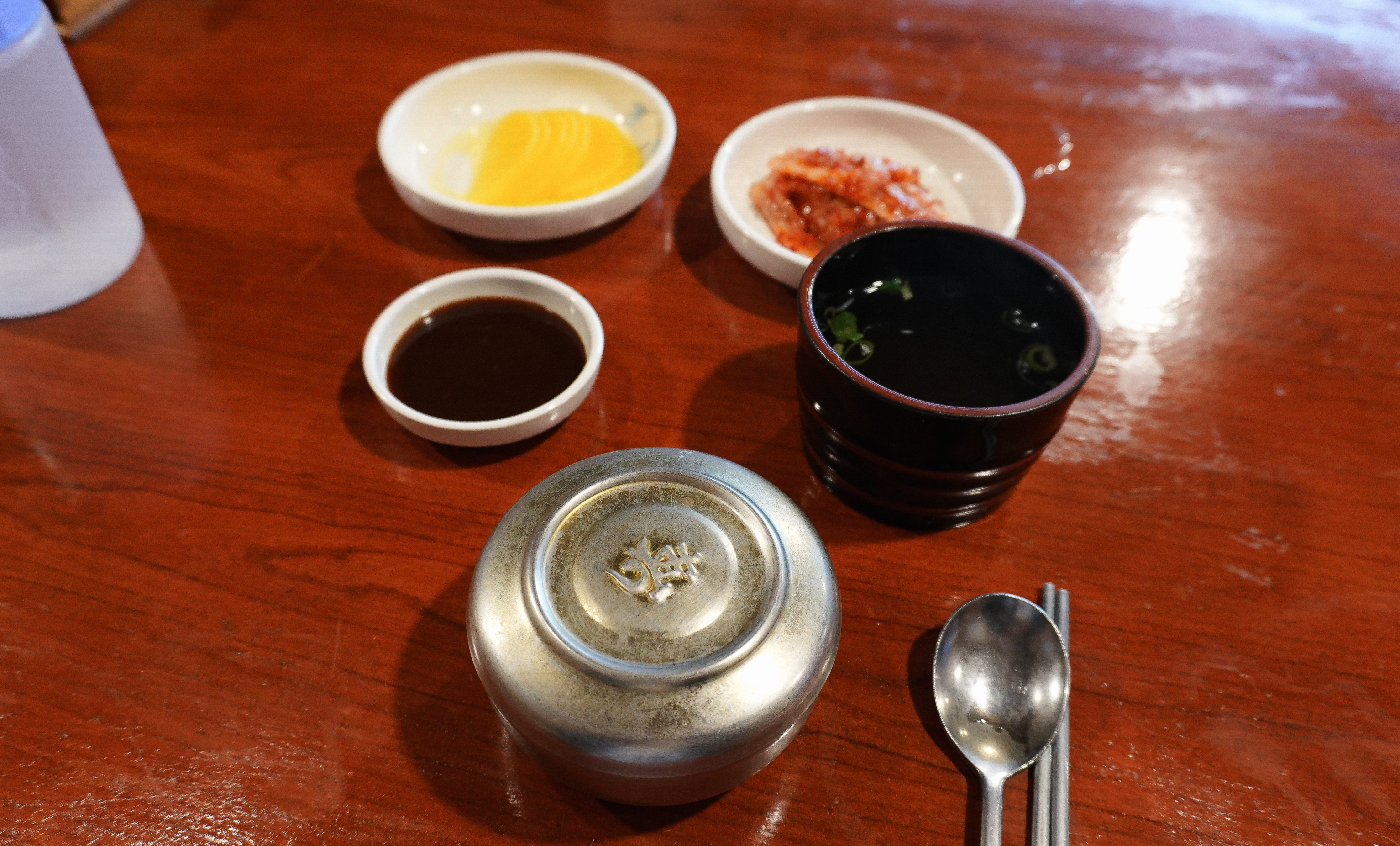 주문한 동경돈가스가 나왔습니다. 메뉴에는 공깃밥과 돈까스 소스, 장국, 단무지, 김치가 함께 제공되었습니다. 사장님 친구분 말에 의하면 돈가스는 생고기를 튀겨 부드럽다고 하였고, 기름을 깨끗하게 유지해 달걀노른자처럼 샛노랗게 튀겨낸다고 했습니다. 그리고 좋은 쌀을 사용해 밥이 맛있다고도 하셨습니다.