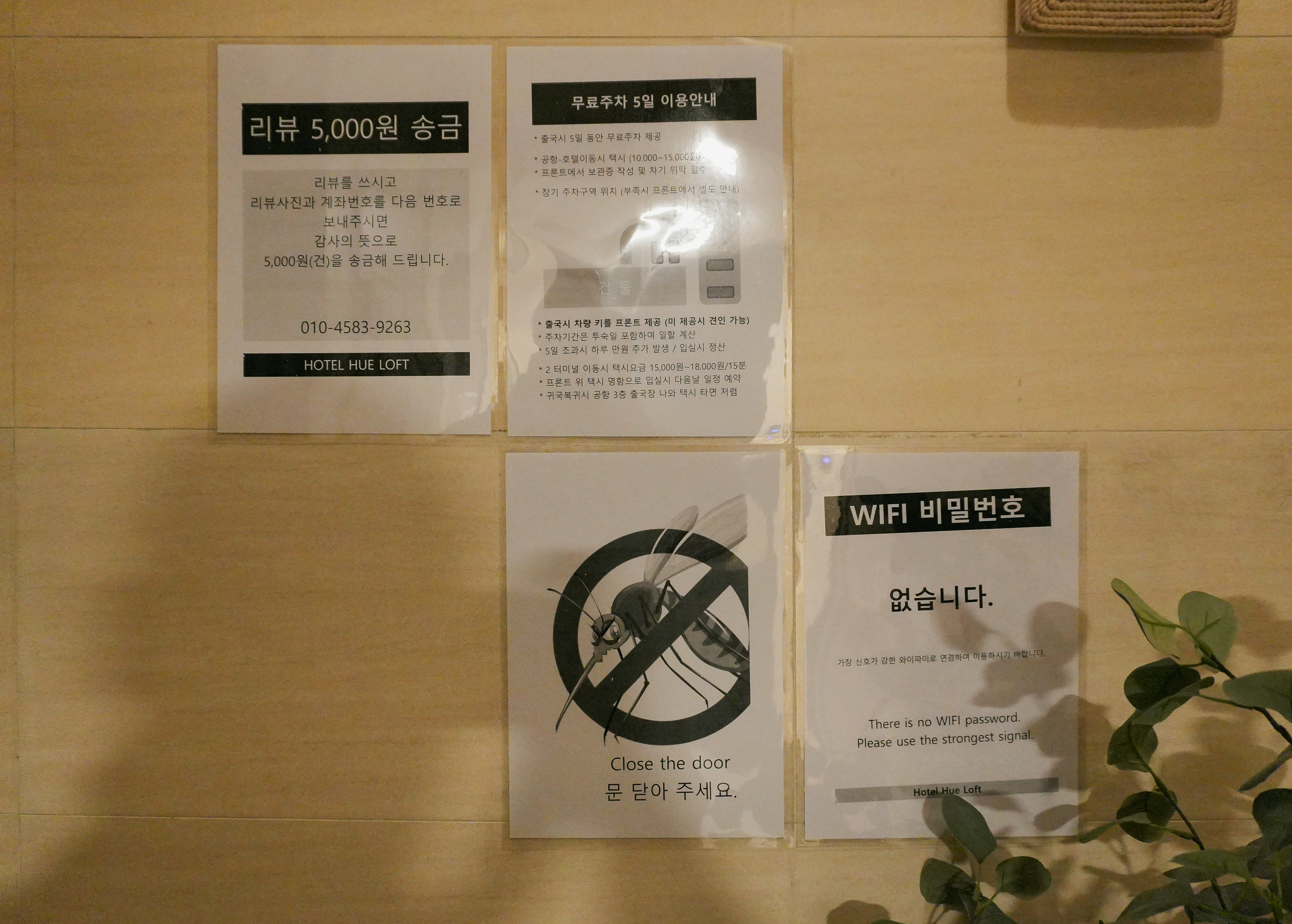 호텔휴로프트는 인천 중구 덕교동 128-64 에 위치해 있었고, 주차공간은 나름 넉넉한 편이었습니다. 가게에는 무료 주차에 대한 안내문이 붙어 있었고, 무료 주차가능한 5일에서 추가될 경우, 하루 10,000원의 추가요금이 발생한다고 적혀있었습니다. 저는 아침에 공항까지 버스를 타고 이동했고요, 택시로 이동시 15,000원 정도 비용이 나온다고 합니다.