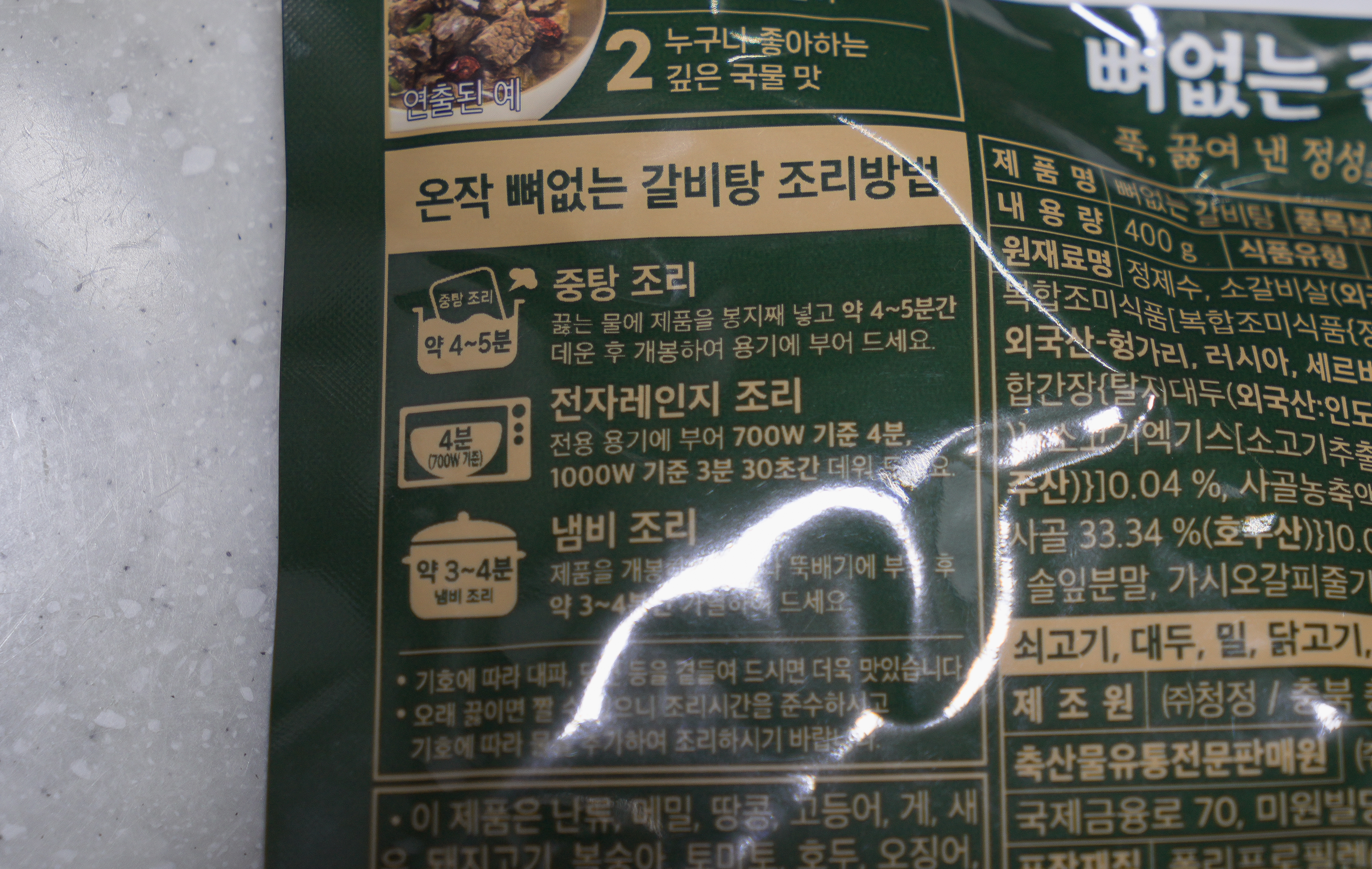 마트에서는 '뼈없는감자탕'과 '뼈없는갈비탕' 두 가지 종류를 판매하고 있었는데, 저는 우선 뼈없는 갈비탕을 먹어보기로 결정했습니다. 이 제품은 중탕이나 전자레인지, 냄비에 직접가열하는 3가지 방식으로 조리할 수 있다고 합니다. 그럼 이제 자세히 살펴보겠습니다.