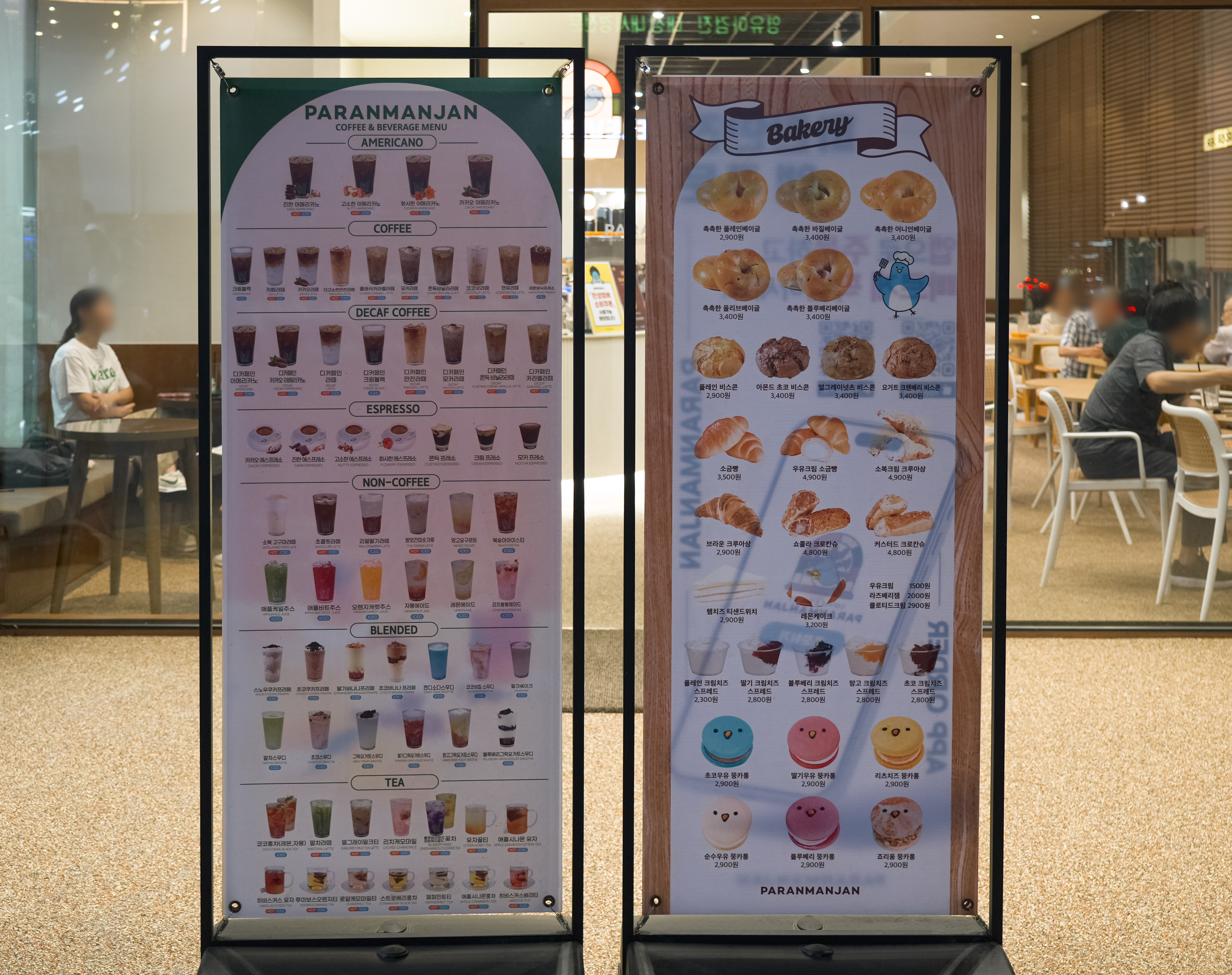 파란만잔의 메뉴는 아메리카노, 커피, 디카페인, 에스프레소, 논커피, 블랜드, 티, 베이커리가 있었습니다. 저희는 만잔컵빙수와 제주말차컵빙수를 주문했습니다. 금액은 각 9,600원 이었습니다.