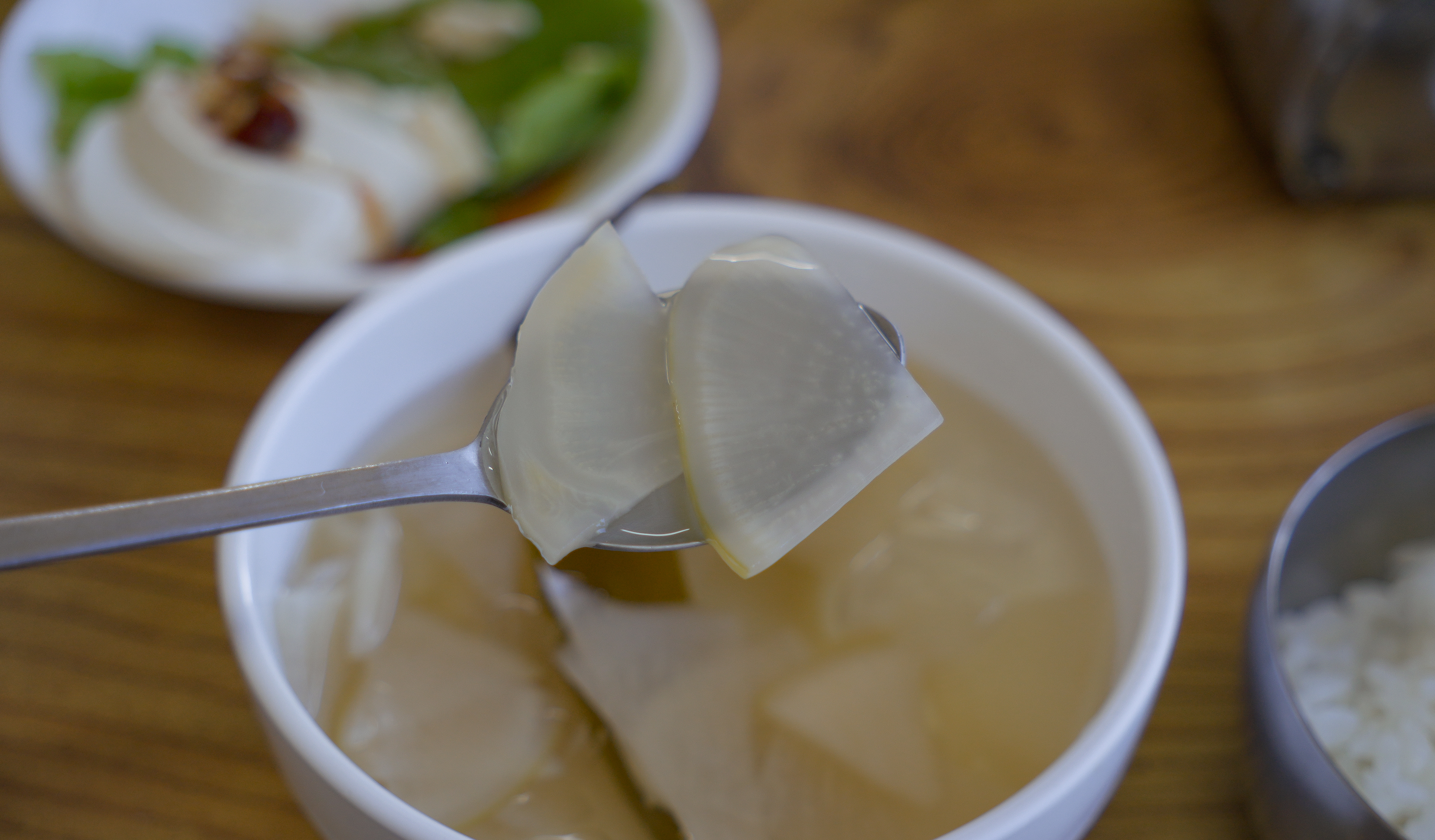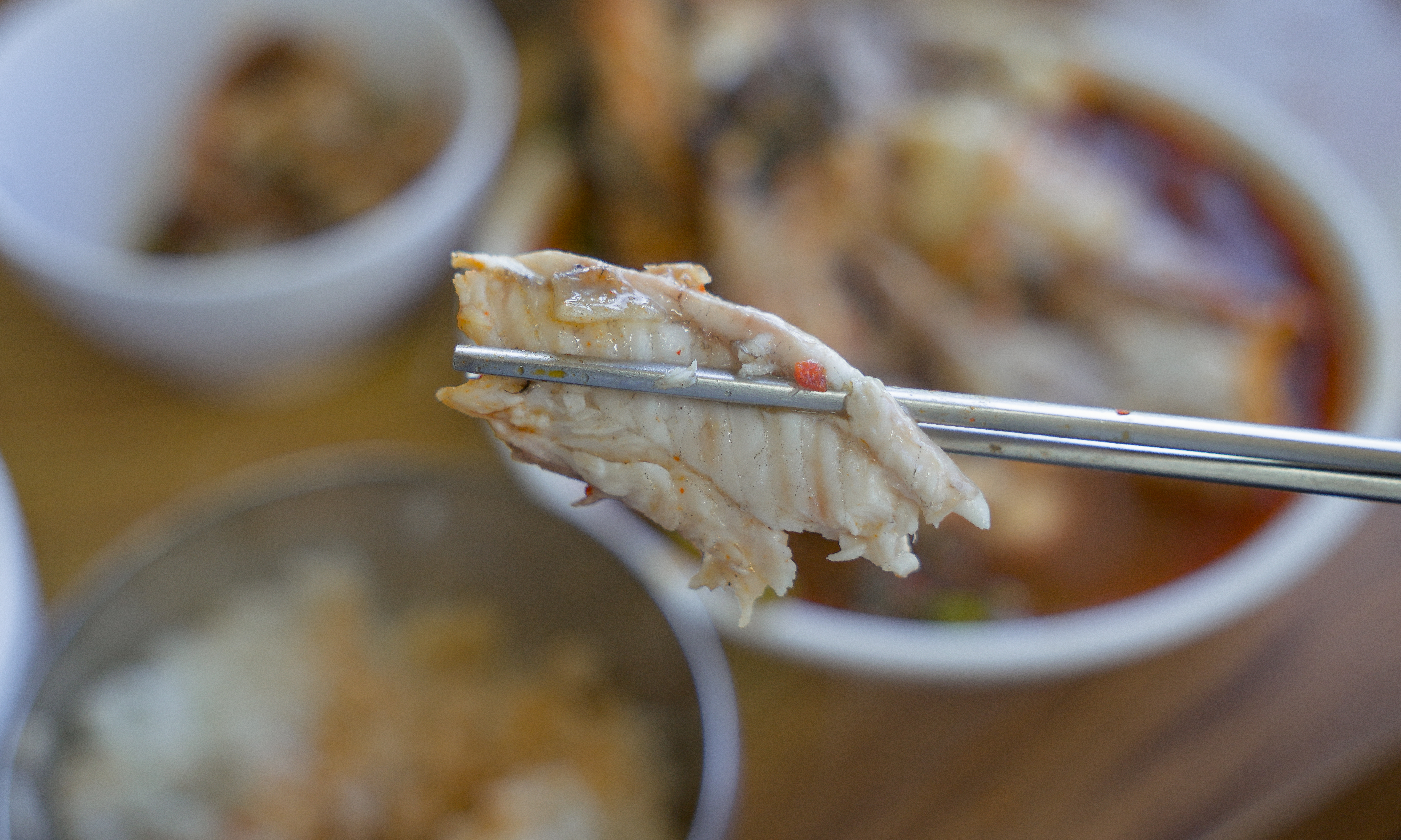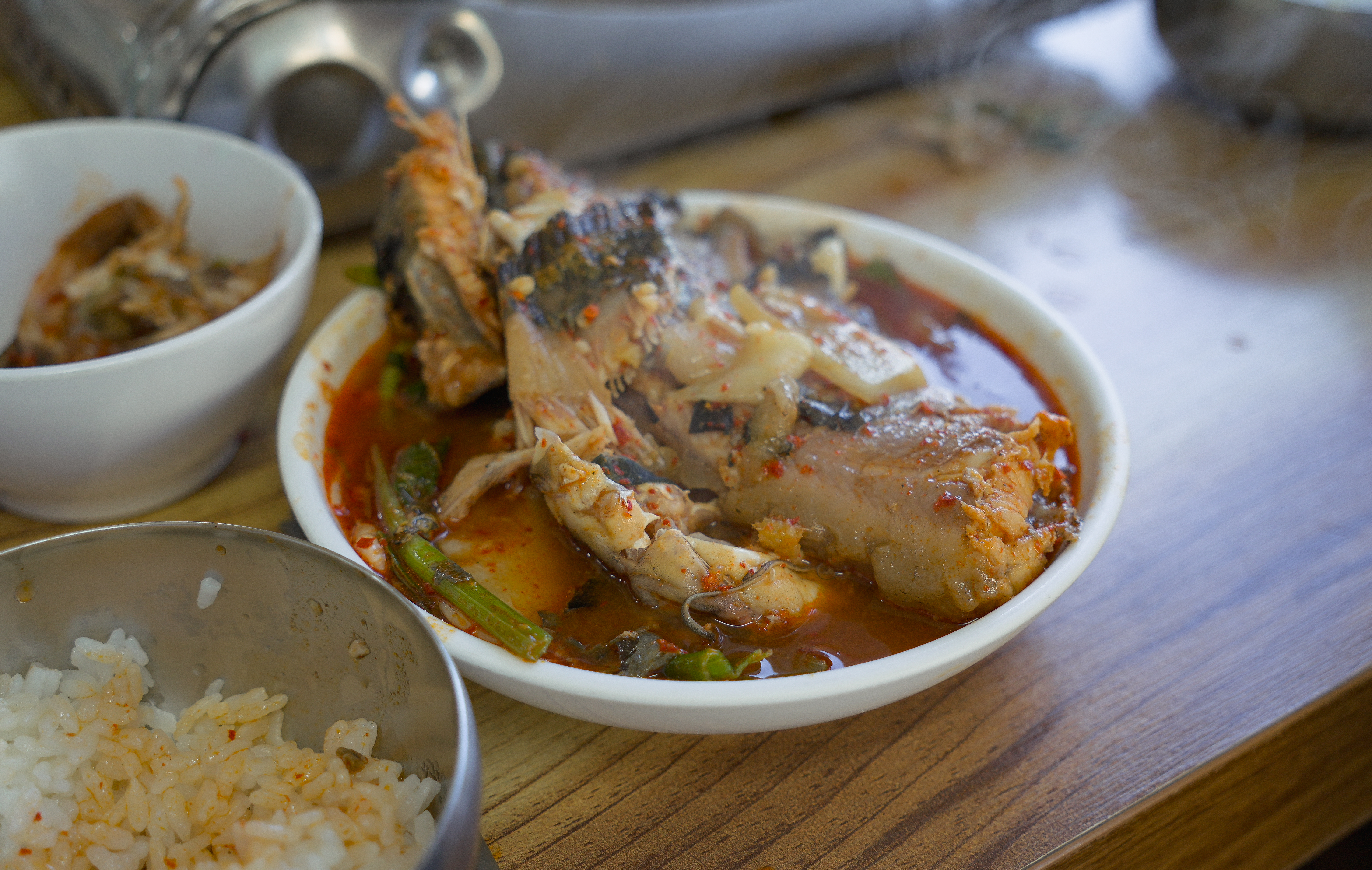 메기매운탕 속 메기가 꽤 넉넉히 들어있어 좋았고, 솥밥으로 갓 지어 나온 따뜻한 밥에 같이 먹으면 더 맛있었습니다. 메기매운탕 속 메기는 살이 부드럽고 흙내가 없어서 거부감이 없었고, 맛도 텁텁하지 않아서 좋았습니다. 끝에 밥을 지었던 솥에 물을 넣어 숭늉까지 먹으니 개운하더라고요.