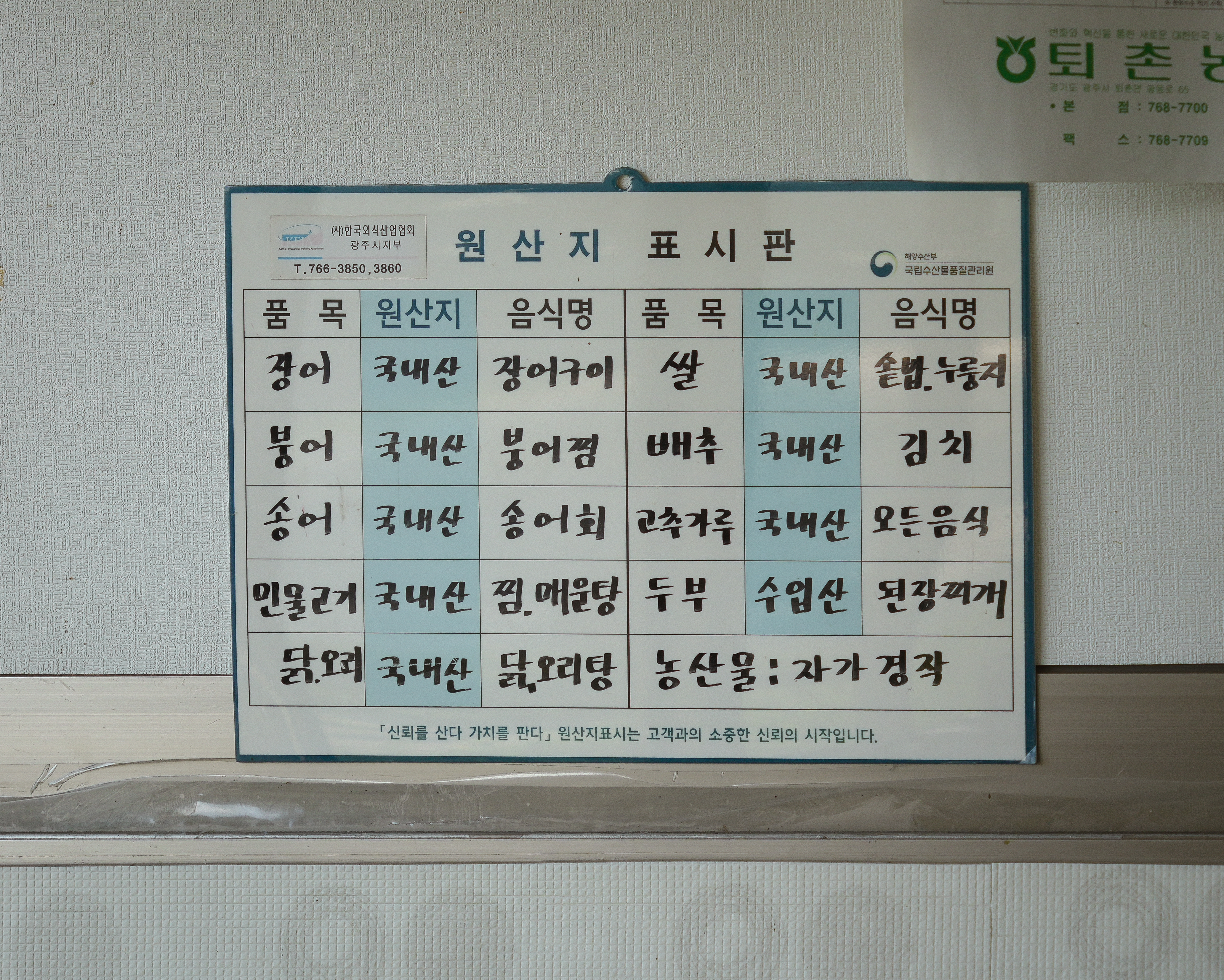 팔당 남강집 가게 내부로 들어가면 위와 같이 창가에 앉아서 팔당호 뷰를 볼 수 있는 자리를 내어주시는데요. 이 날 꽤 더운 날씨였지만 가게 내부는 덥지 않아서 좋았습니다. 남강집의 원산지 표시판을 보면 장어, 붕어, 송어, 민물고기, 닭, 오리, 쌀, 배추, 고추가루는 국내산을 쓰고 있었고, 두부는 수입산을 사용하고 있었습니다.