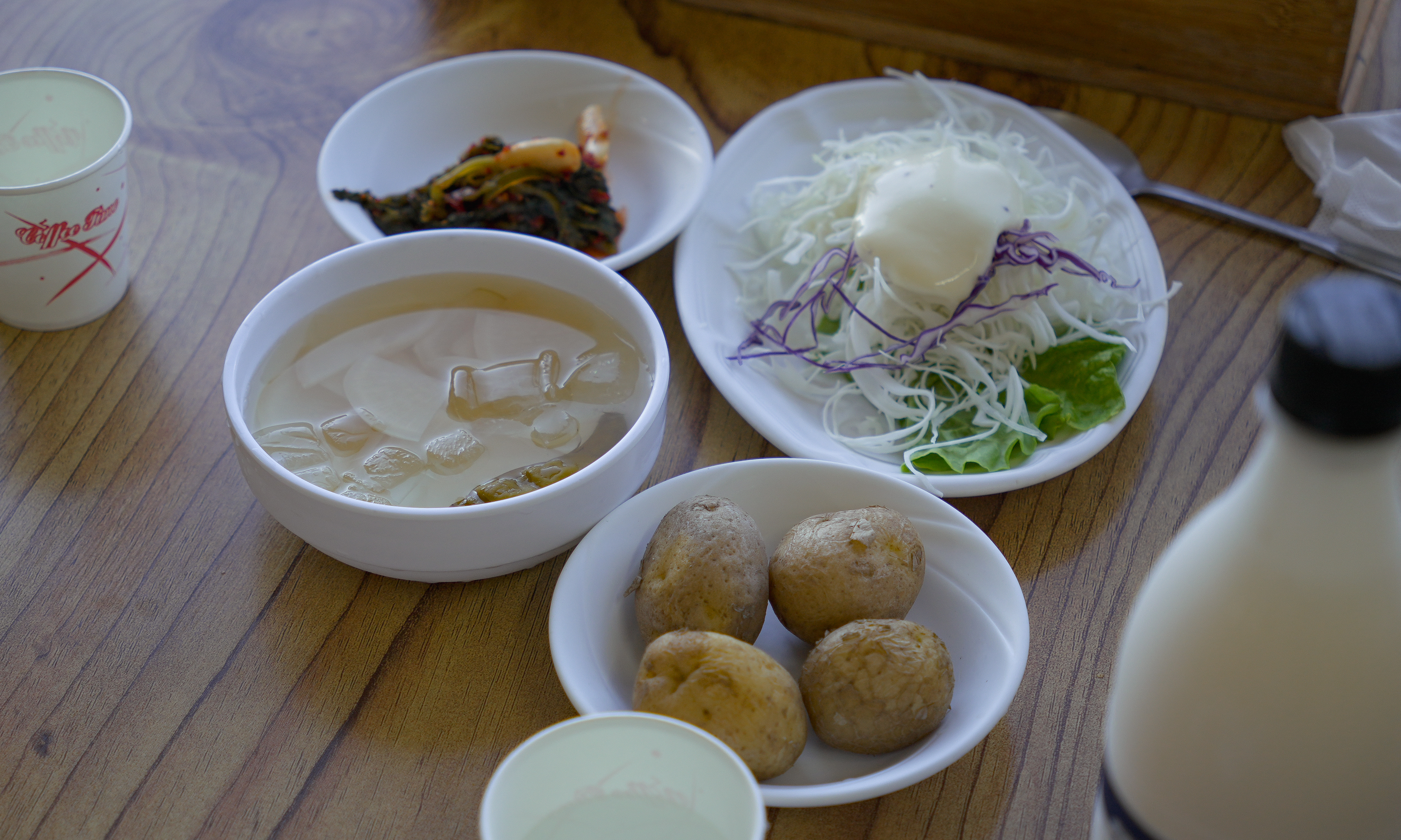 반찬들과 함께 주문한 메기매운탕이 나왔습니다. 반찬은 마늘쫑 새우볶음, 두부, 동치미, 나물무침, 김치, 샐러드, 감자 등이 나왔습니다. 메기매운탕을 살펴보기 전 반찬들을 좀 더 사진으로 담아보았습니다.