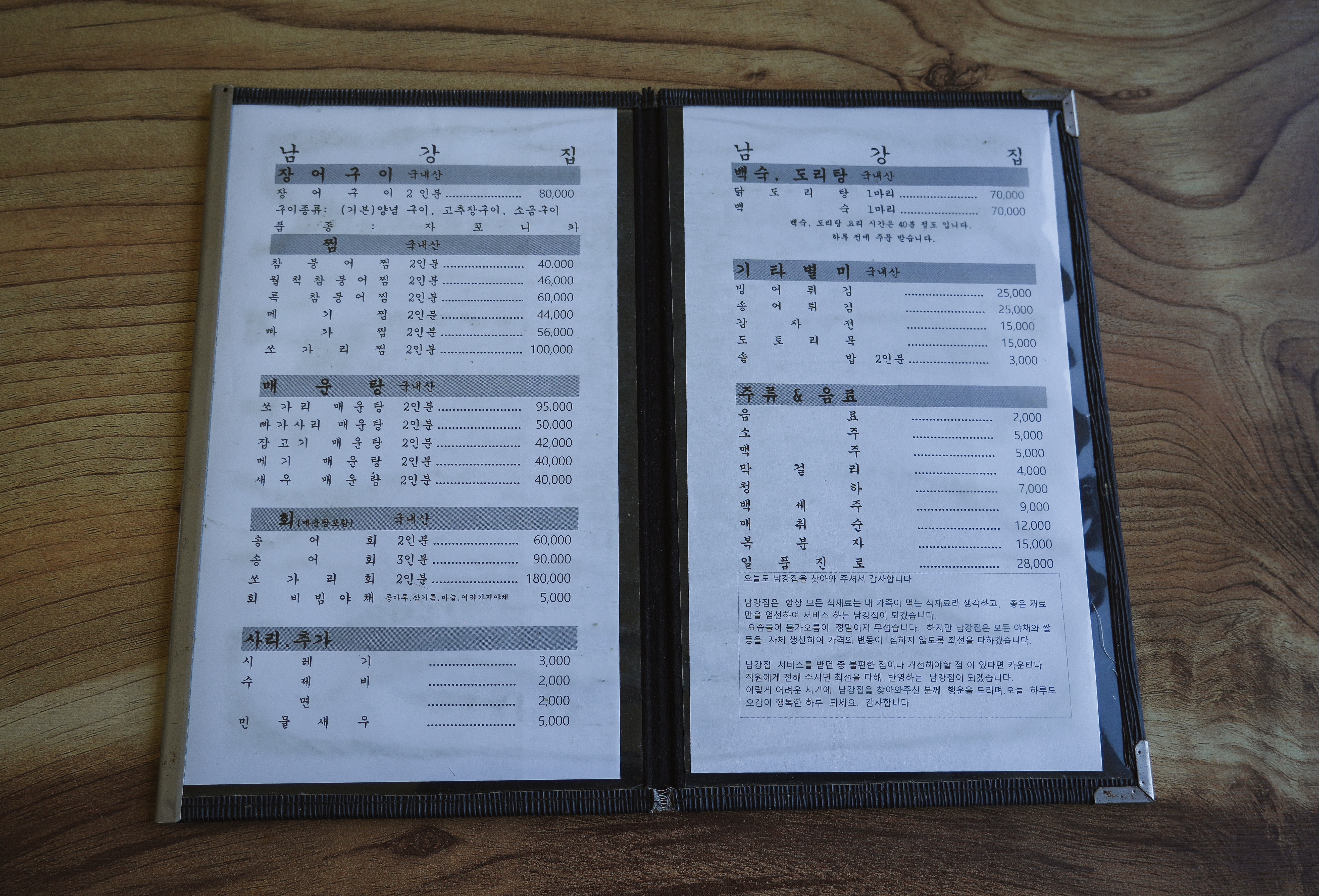 남강집의 메뉴는 장어구이, 참붕어찜, 월척참붕어찜, 특참붕어찜, 메기찜, 빠가찜, 쏘가리찜, 쏘가리매운탕, 빠가사리매운탕, 잡고기매운탕, 메기매운탕, 새우매운탕, 송어회, 쏘가리회, 닭도리탕, 백숙, 빙어튀김, 송어튀김, 감자전, 도토리묵 등이 있었습니다.