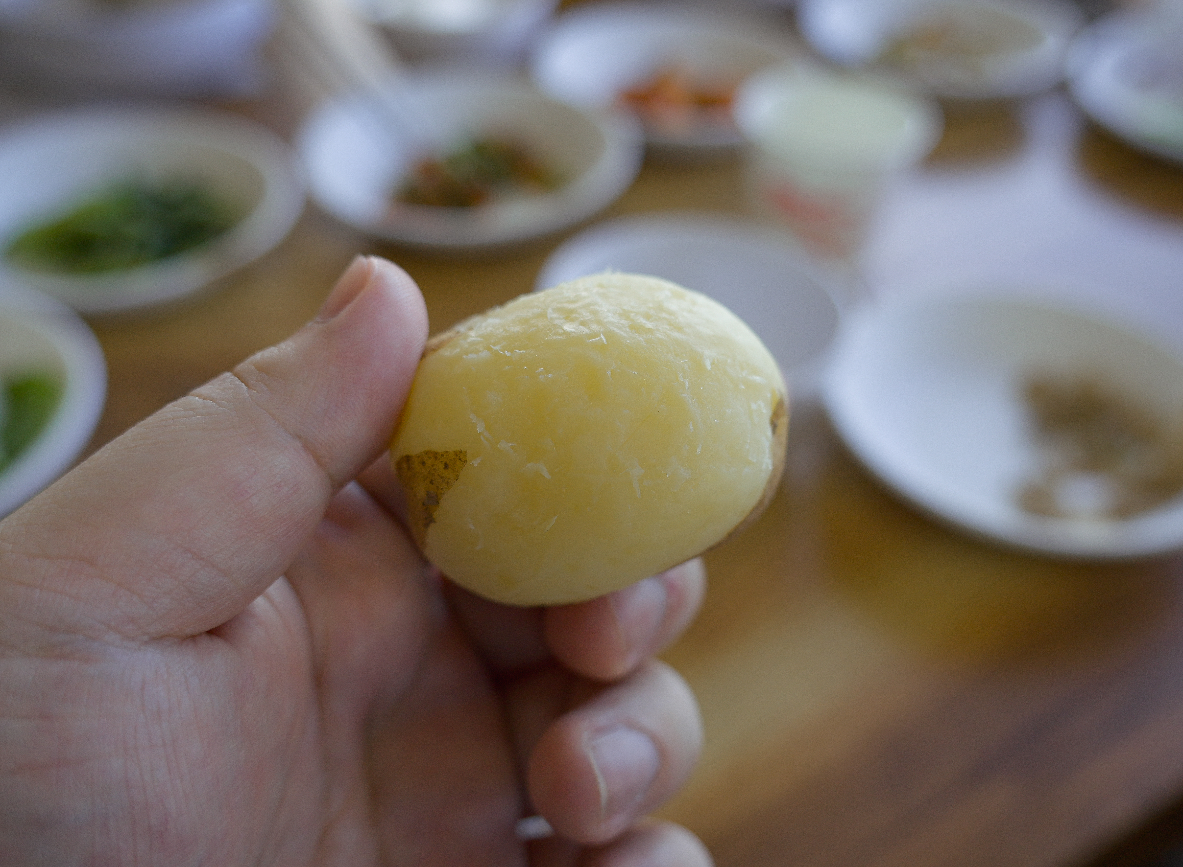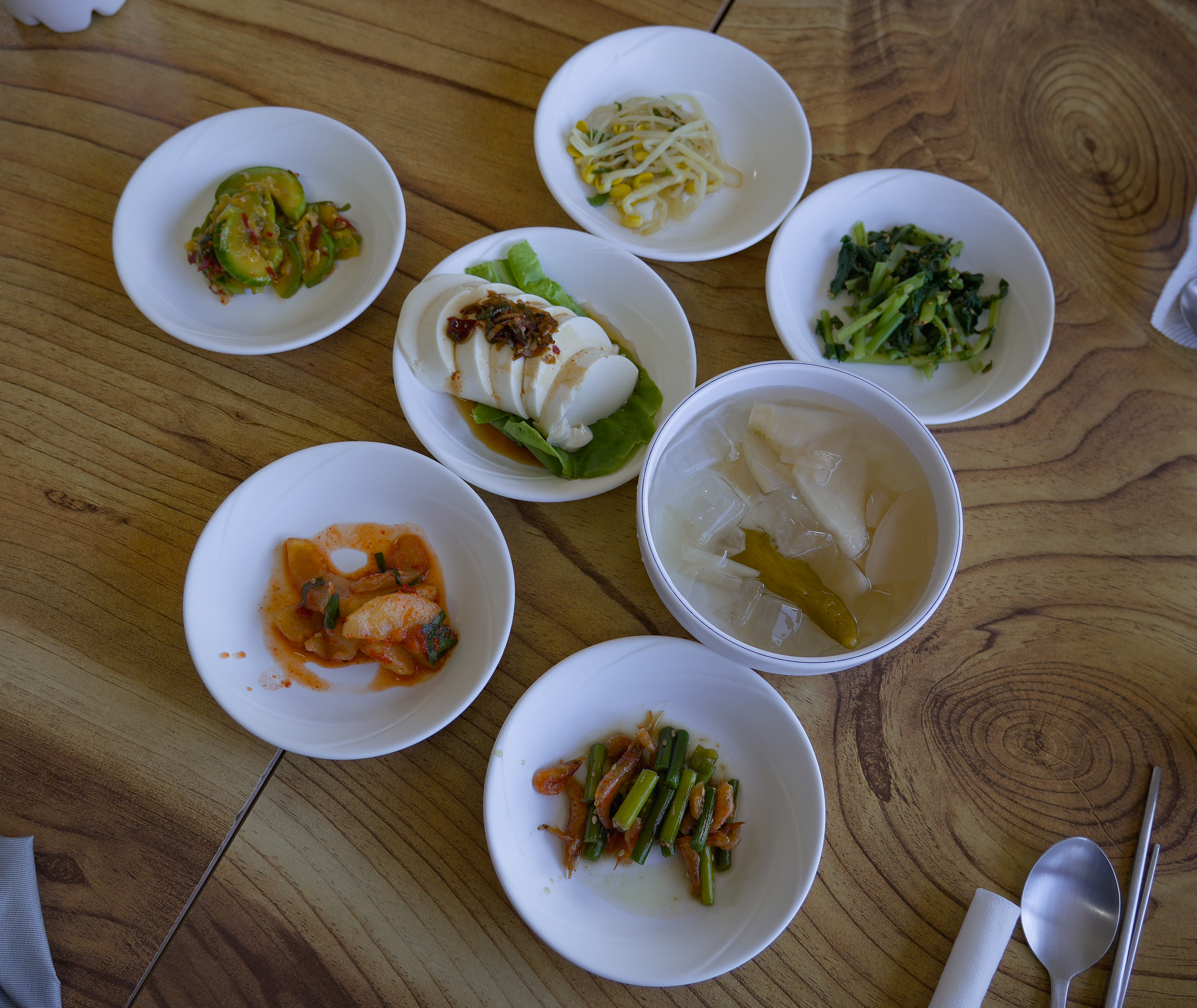 반찬들과 함께 주문한 메기매운탕이 나왔습니다. 반찬은 마늘쫑 새우볶음, 두부, 동치미, 나물무침, 김치, 샐러드, 감자 등이 나왔습니다. 메기매운탕을 살펴보기 전 반찬들을 좀 더 사진으로 담아보았습니다.