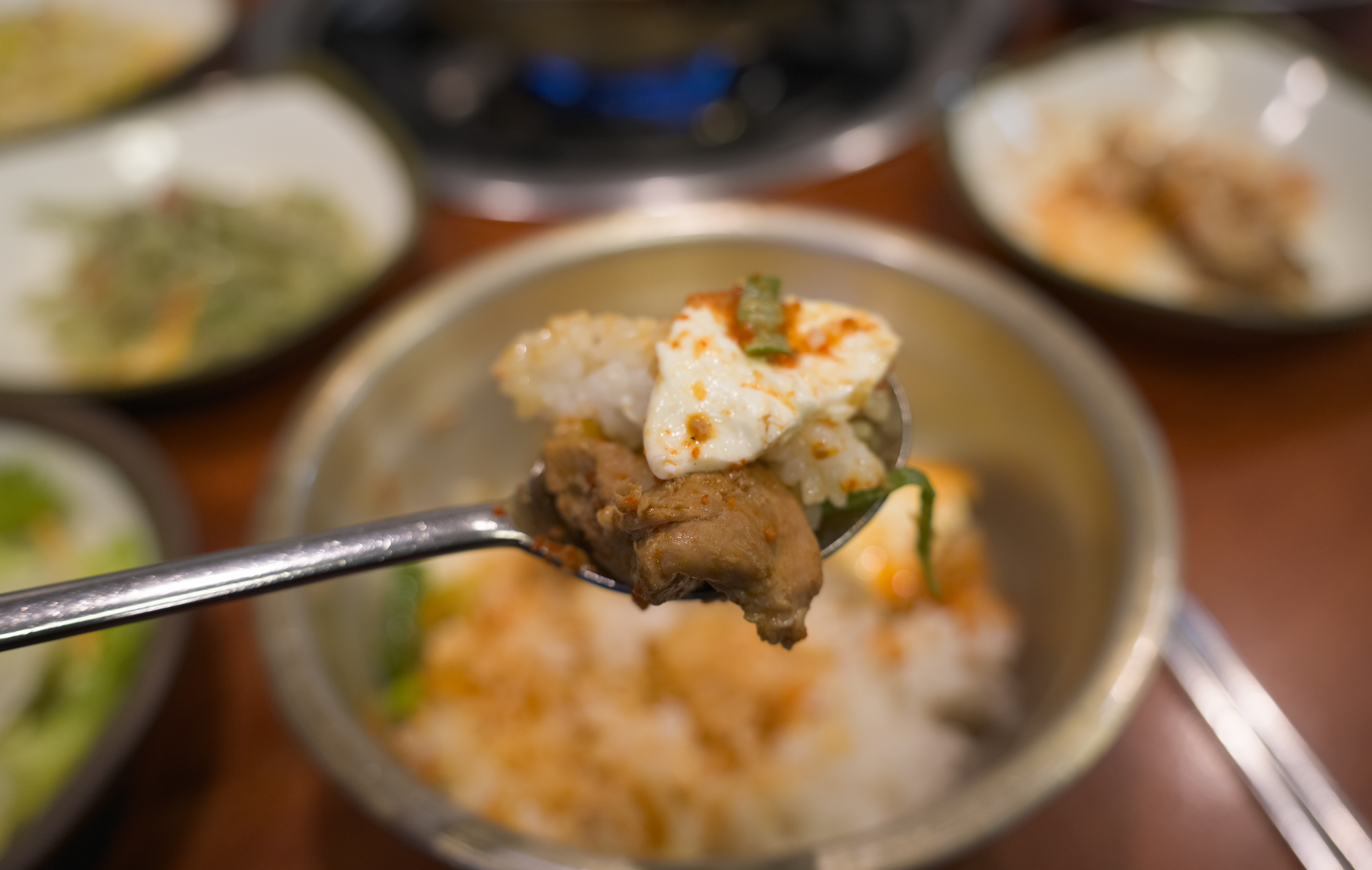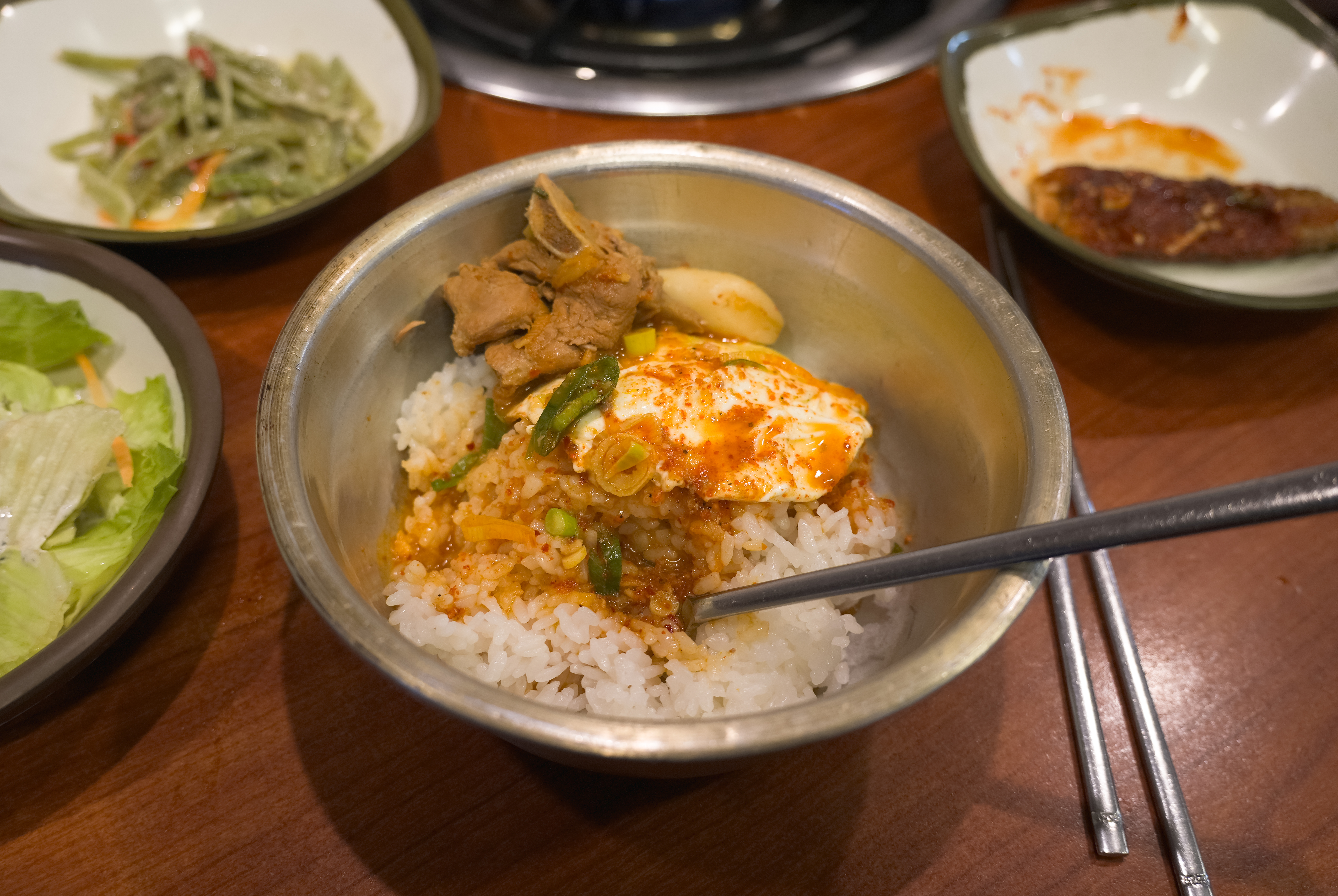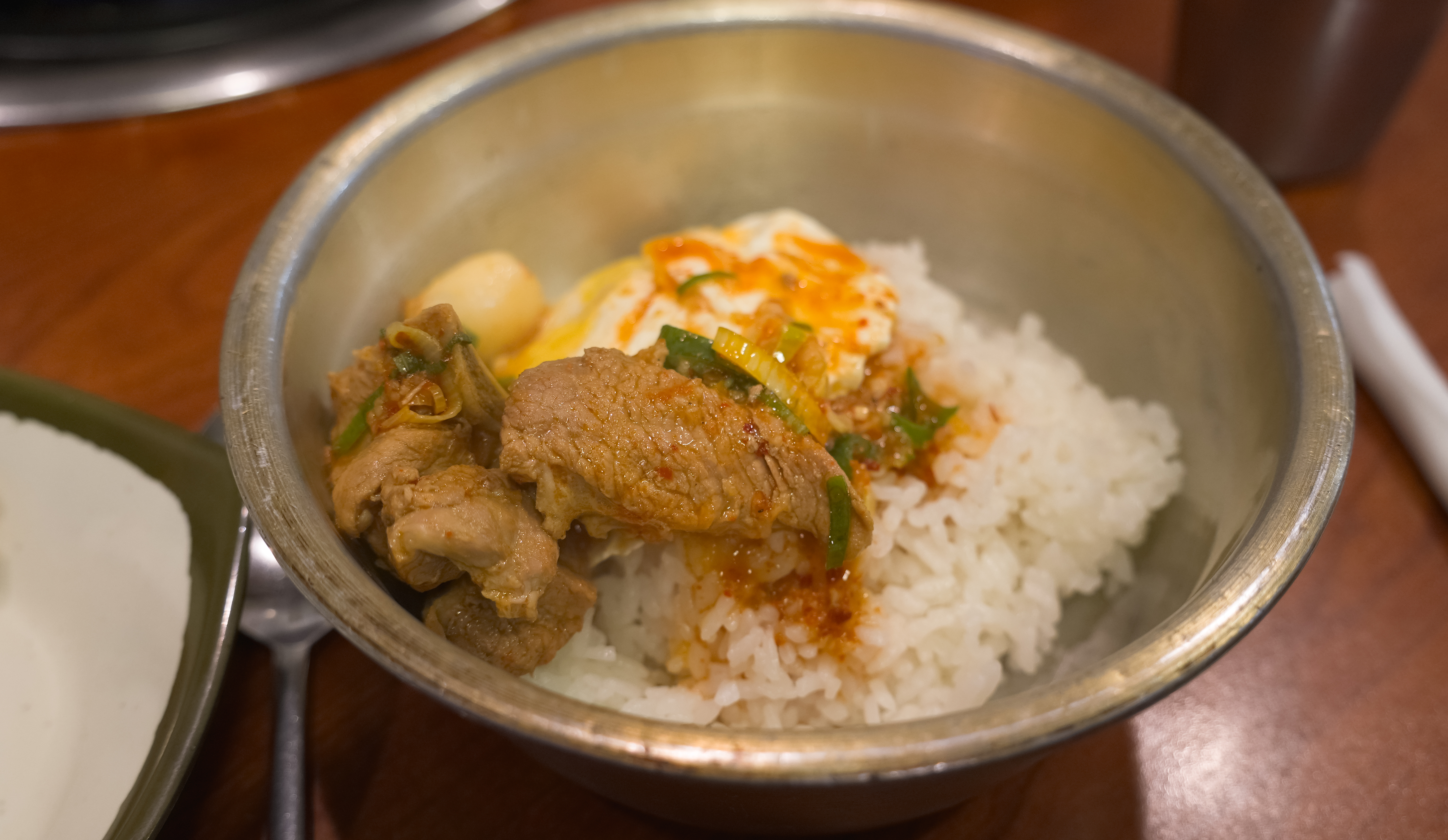 아우네 매운갈비찜 가게의 매운돼지갈비찜과 코다리정식 그리고 반찬들의 모습입니다. 특이한 게 이곳은 기본으로 달걀프라이를 얹은 밥을 같이 내어주고 있었습니다.