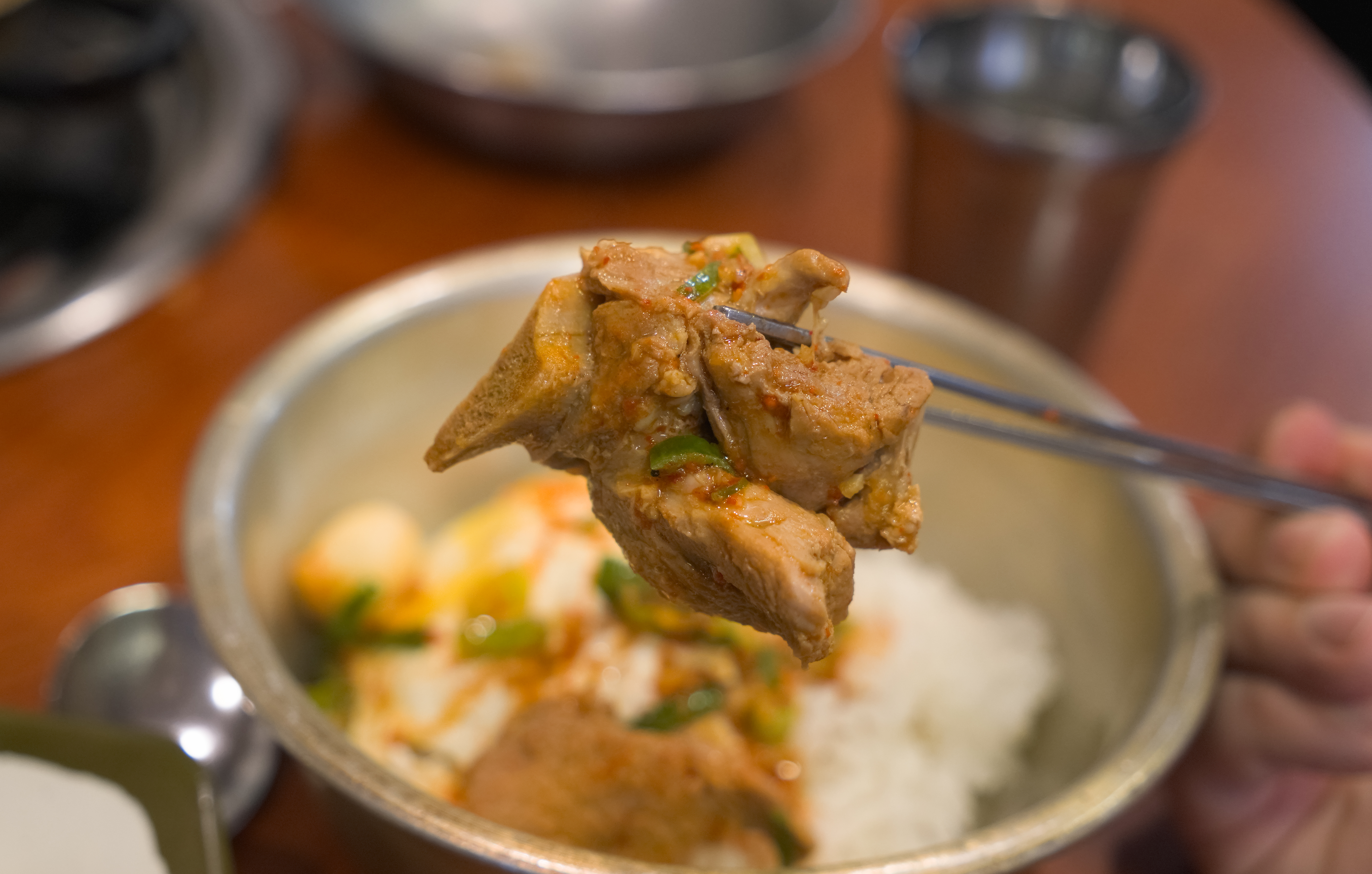 먼저, 매운 돼지갈비찜부터 살펴보겠습니다. 돼지갈비찜에 들어간 고기도 부드럽고 맛은 있었는데, 솔직한 평을 덧붙이자면 김치찜에 김치가 너무 신 맛이 강해서 조금만 잡아주면 감칠맛 있게 먹을 것 같은데 하는 아쉬움도 있었습니다.