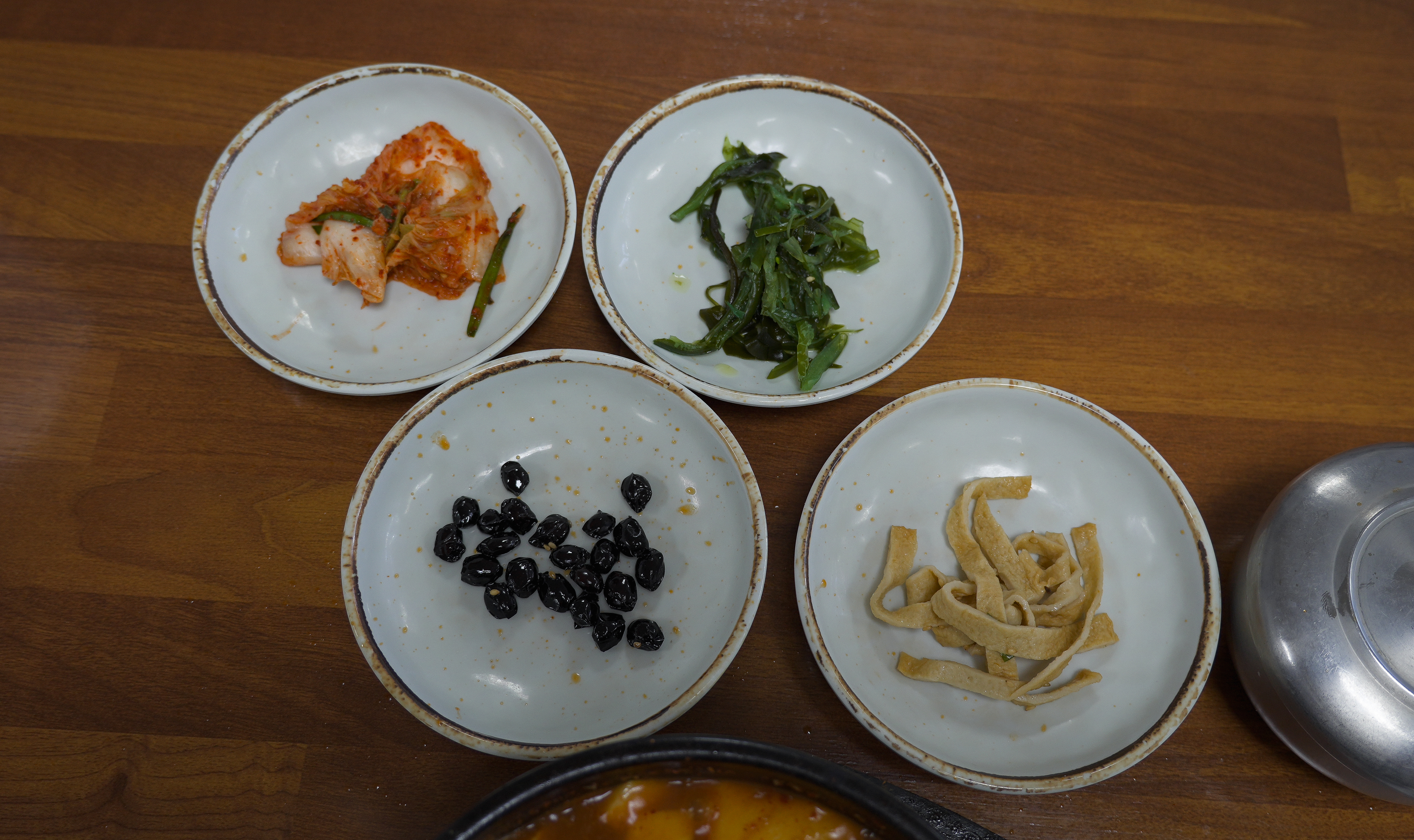 곧이어 잠실 전주고을해물순두부의 해물순두부가 나왔습니다. 반찬들은 배추김치, 미역줄기, 콩자반, 어묵볶음이 나왔습니다. 추가반찬은 셀프코너에서 직접 덜어다 먹을 수 있도록 하고 있었습니다.