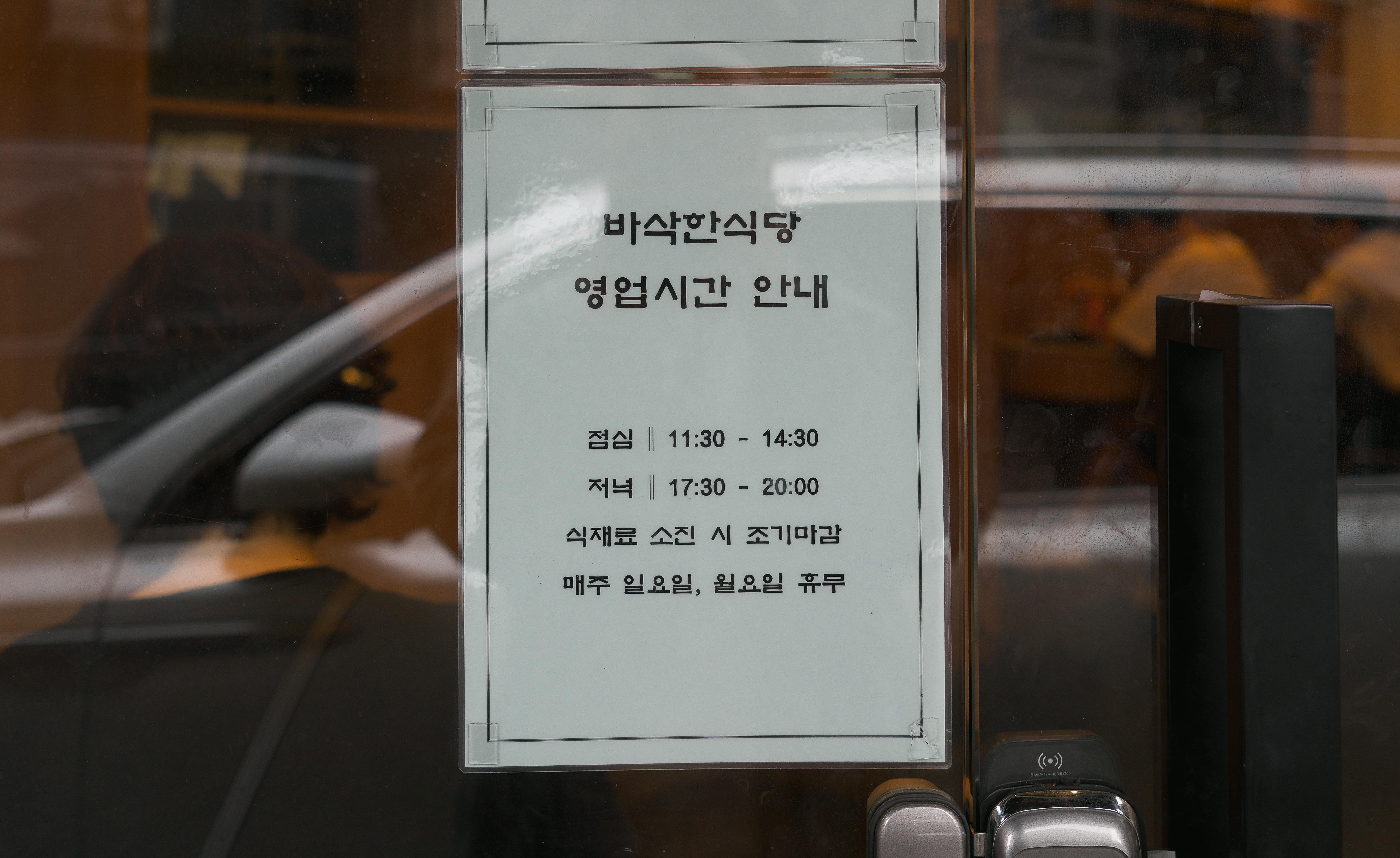바삭한식당은 서울 송파구 오금로25길 23, 1층 101호에 위치해 있었습니다. 이곳은 대부분 주차를 가게 건물을 둘러싸고 하고 있었고, 인근에 공영주차장을 이용해도 되었습니다. 영업시간은 점심 11:30-14:30, 저녁 17:30-20:00 였습니다. 그리고 이곳은 매주 일요일, 월요일은 휴무라고 합니다.