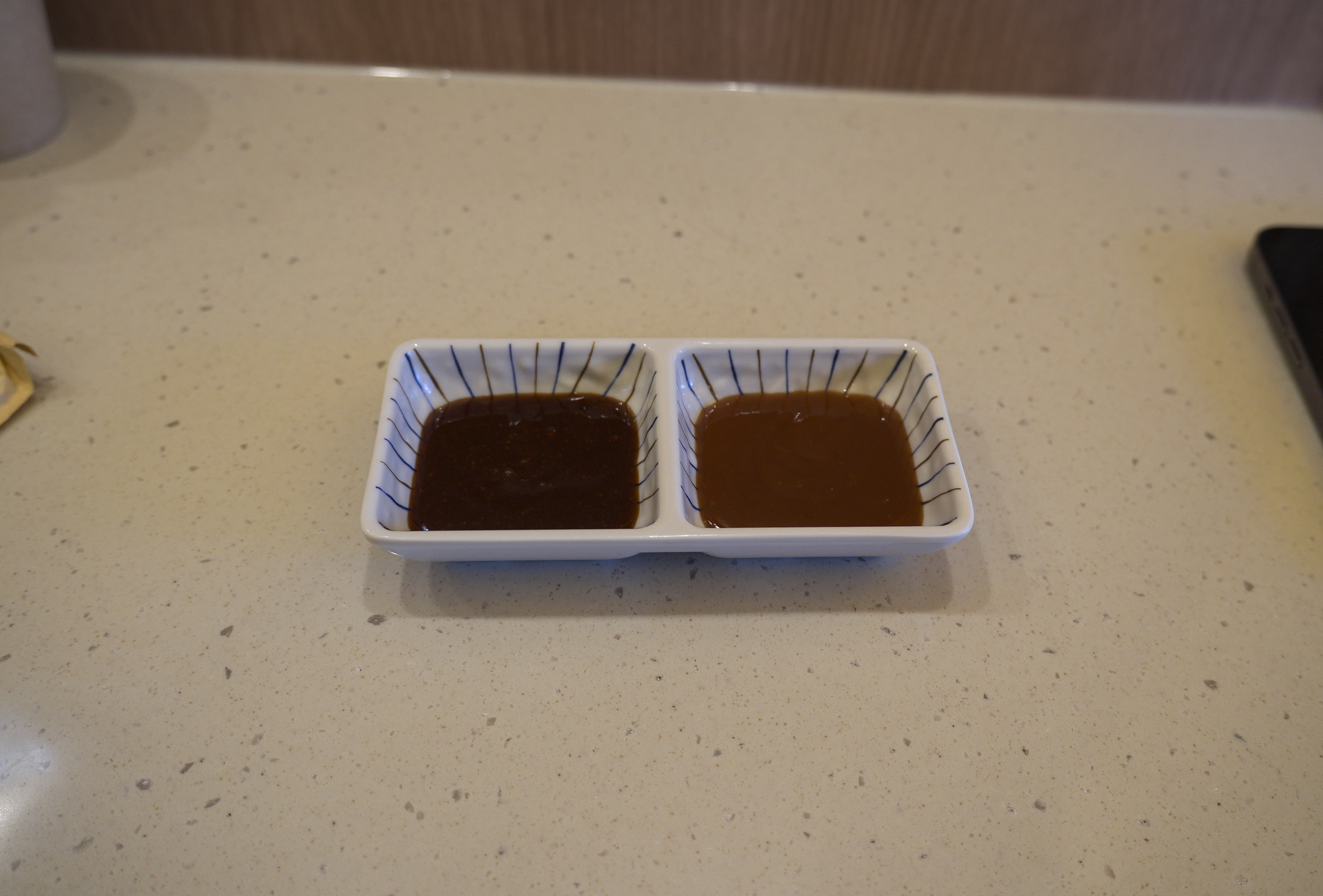 자리에서 메뉴를 기다리면서 장국과 소스그릇에 소스를 담아보았습니다. 바삭한식당의 소스는 두 가지가 제공되는데, 하나는 매콤한 맛이고 다른 하나는 달콤한 맛이었습니다.