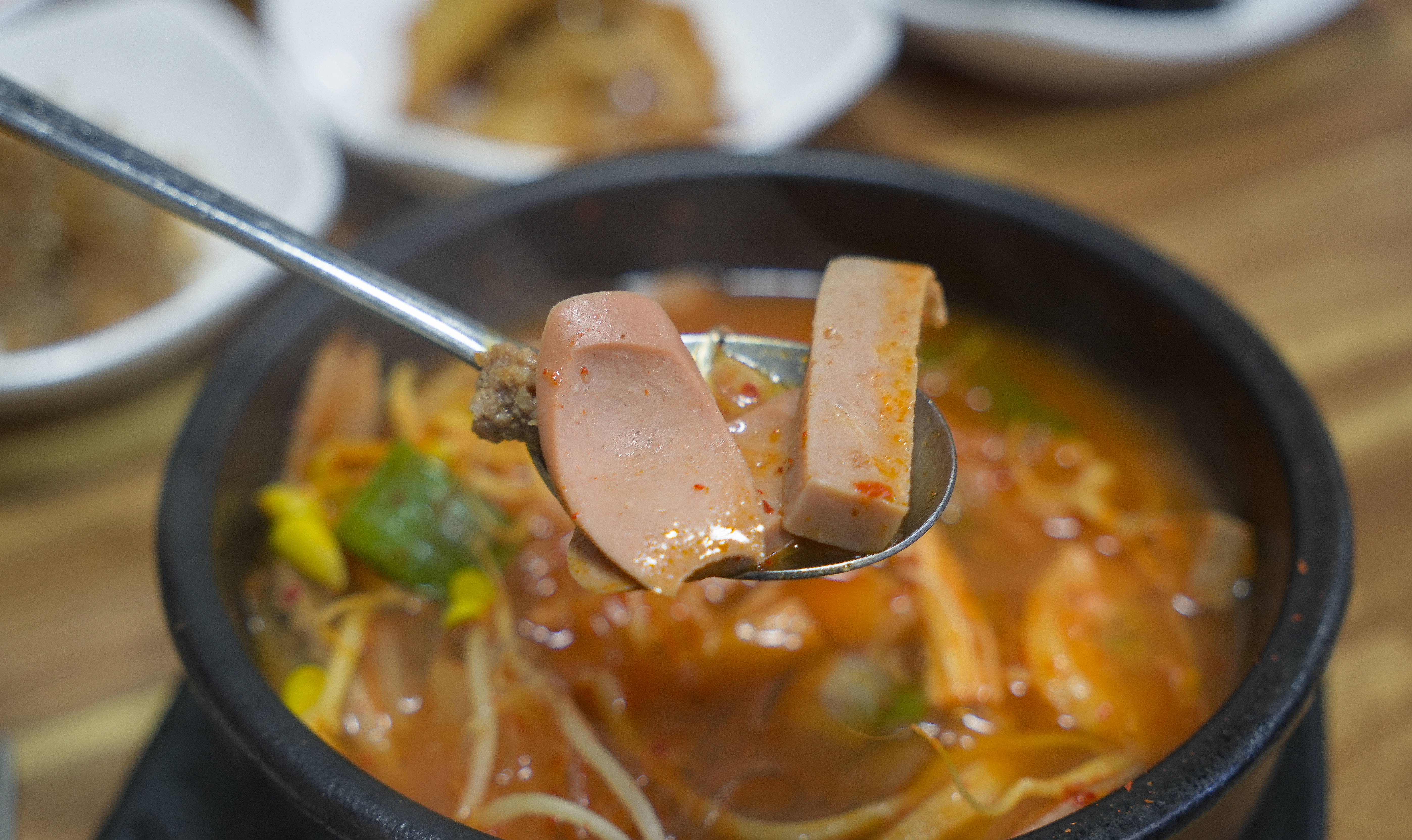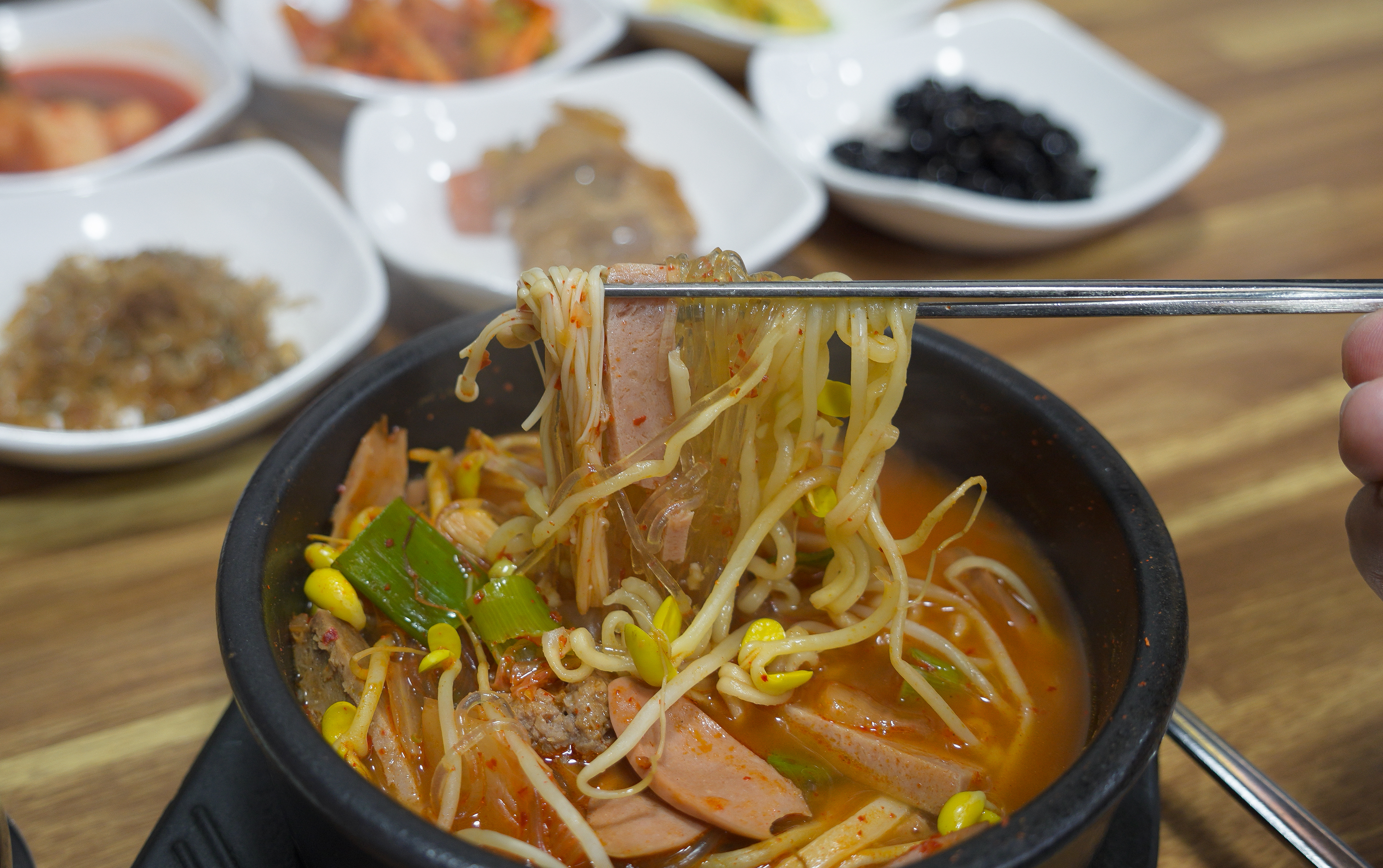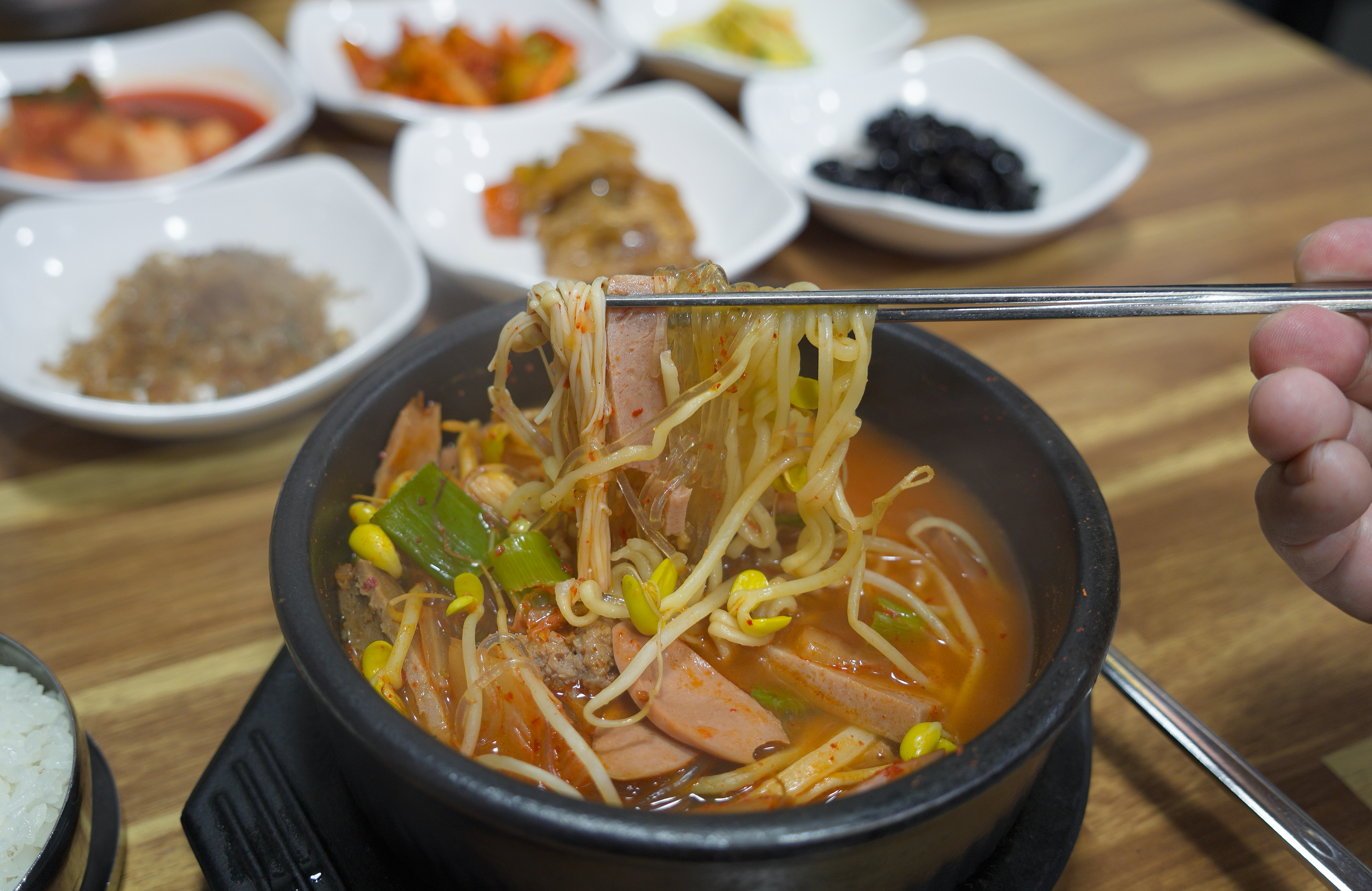 제가 주문한 메뉴는 부대찌개는 크게 기대하지 않았었는데, 생각보다 다양한 재료들이 들어가 있더라고요. 소시지, 햄, 민찌, 콩나물, 대파, 떡, 팽이버섯, 라면, 당면 등이 들어있었습니다. 재료도 푸짐하고 맛도 생각보다 맛있어서 맛있게 식사할 수 있었습니다.