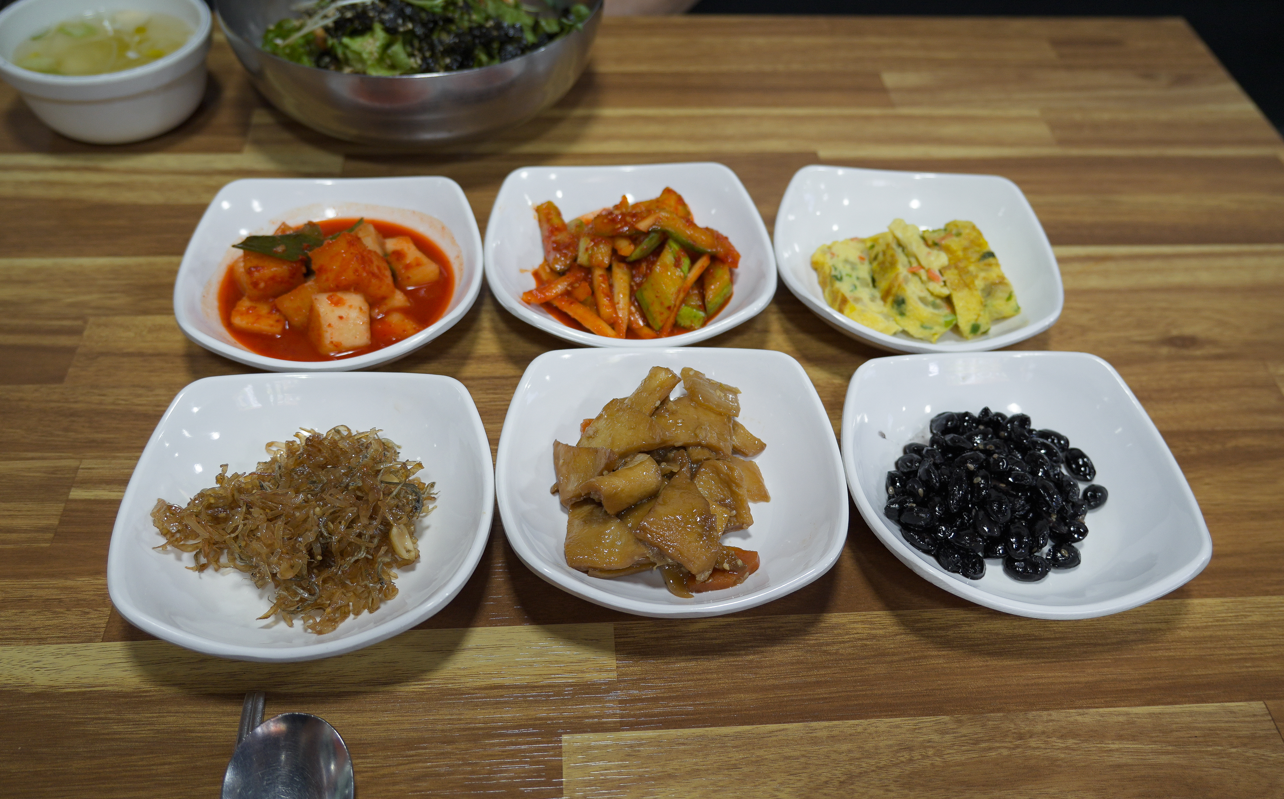 거여동 맛고을식당에서 메뉴를 주문하니까 백반집답게 다양한 반찬들이 나오더라고요. 반찬은 달걀말이, 콩자반, 진미채볶음, 어묵볶음, 오이소박이, 깍두기가 나왔습니다. 그리고 주문한 오징어덮밥과 부대찌개도 함께 나왔습니다.