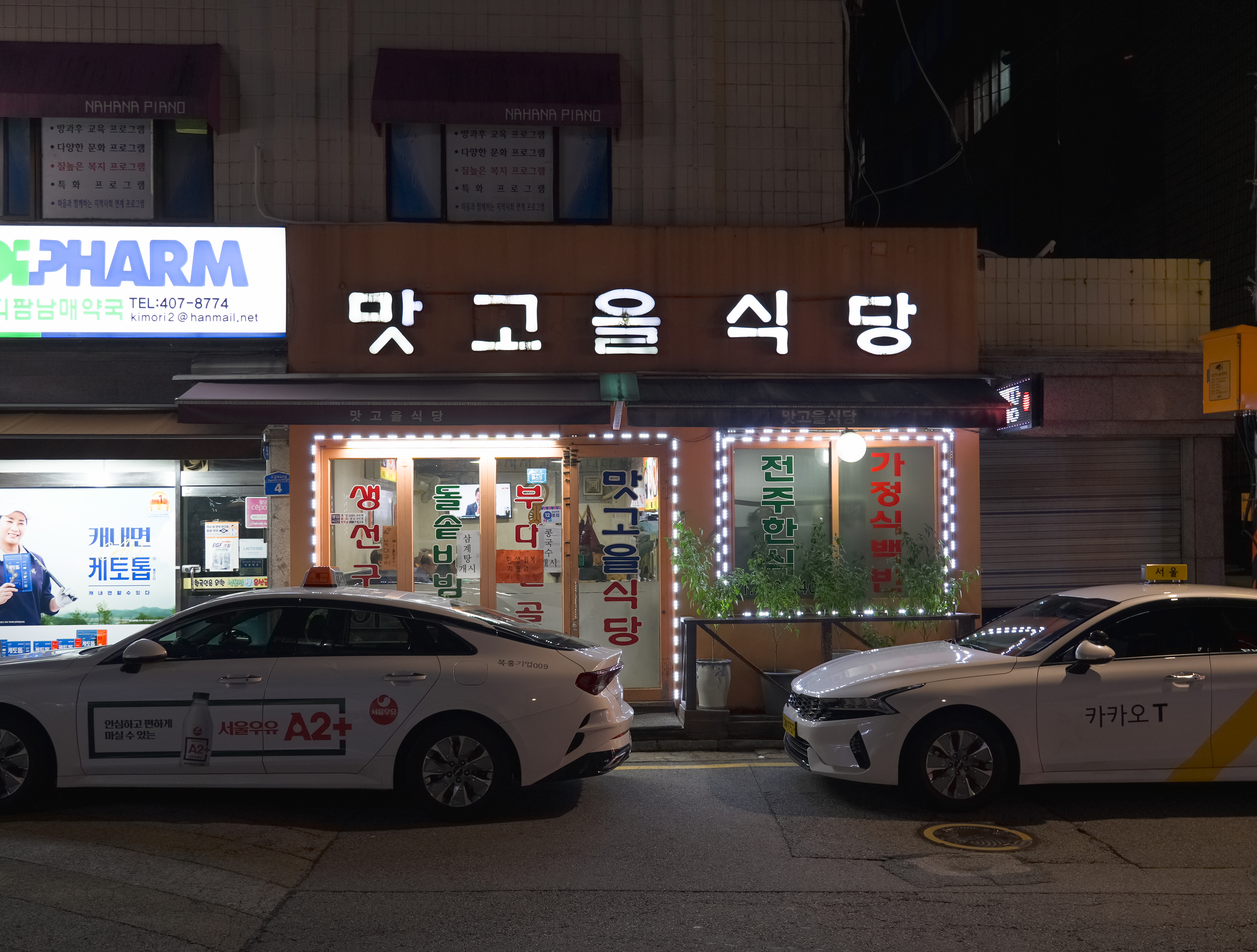 맛고을식당이라는 이름이 흔한 건지 포털에 검색해 보니 동네마다 맛고을식당이라는 이름이 보이더라고요. 제가 방문한 가게는 서울 송파구 거여동 31, 1층에 위치해 있었습니다. 이곳은 택시 기사님들이 많이 찾는 가게인지, 가게 앞에는 택시들이 주차되어 있더라고요.