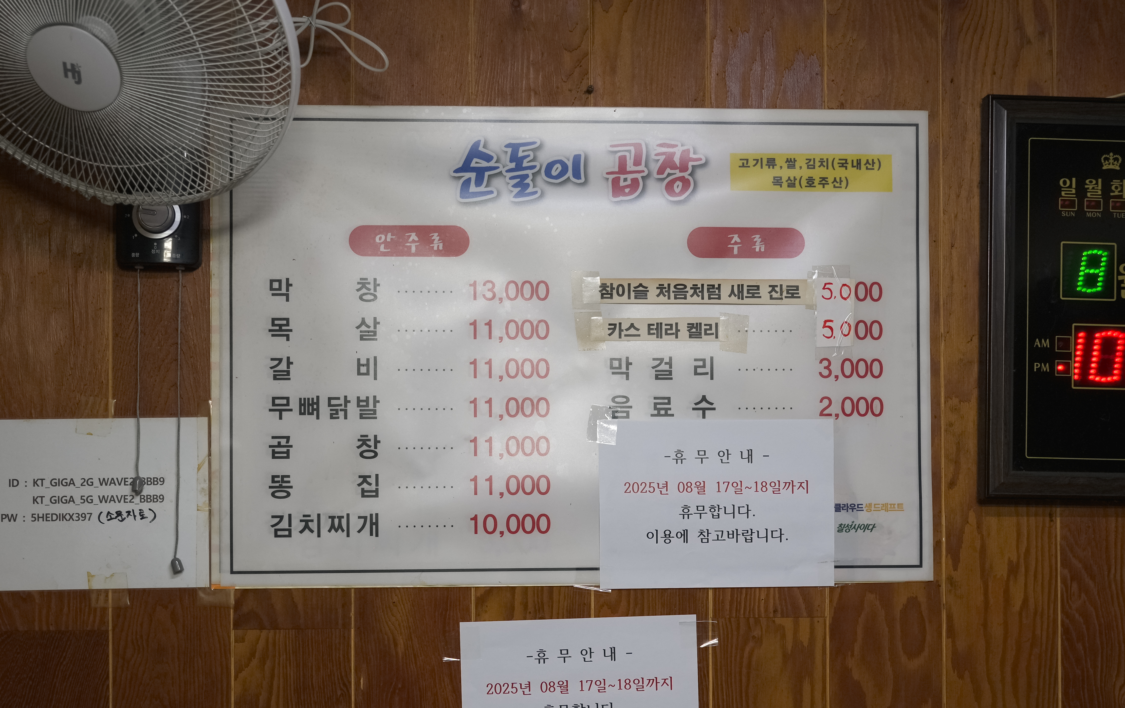순돌이곱창의 메뉴는 이렇습니다. 막창, 목살, 갈비, 무뼈닭발, 곱창, 똥집, 김치찌개가 있었습니다. 이곳은 직화로 구워서 불맛이 제대로 느껴지는 메뉴를 판매하고 있었습니다. 특히 막창이 맛있다고 하던데, 아쉽게도 이 날 막창은 재료가 다 소진되었다고 하더라고요. 아쉬운 대로 곱창과 갈비를 주문해 보았습니다.