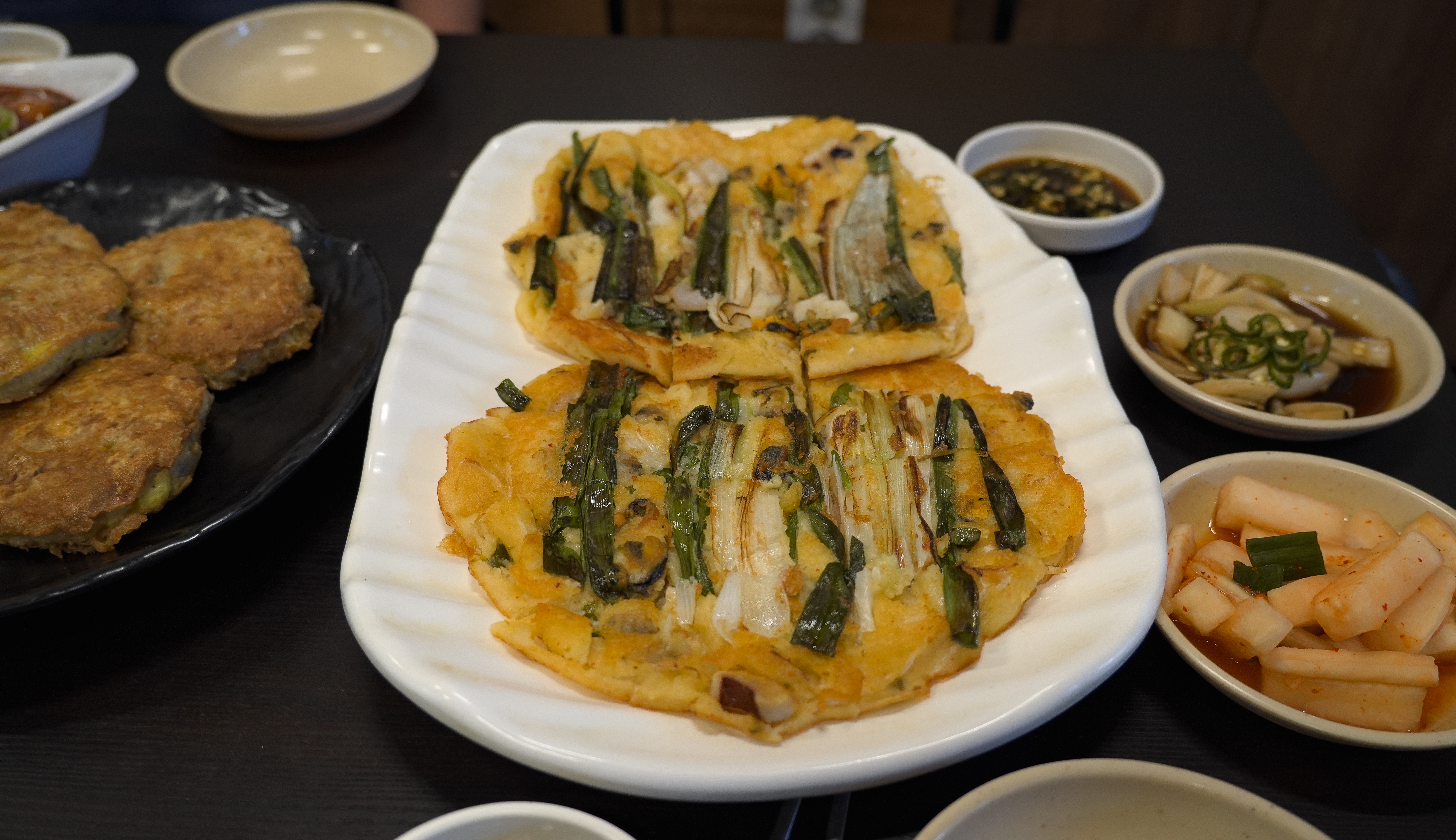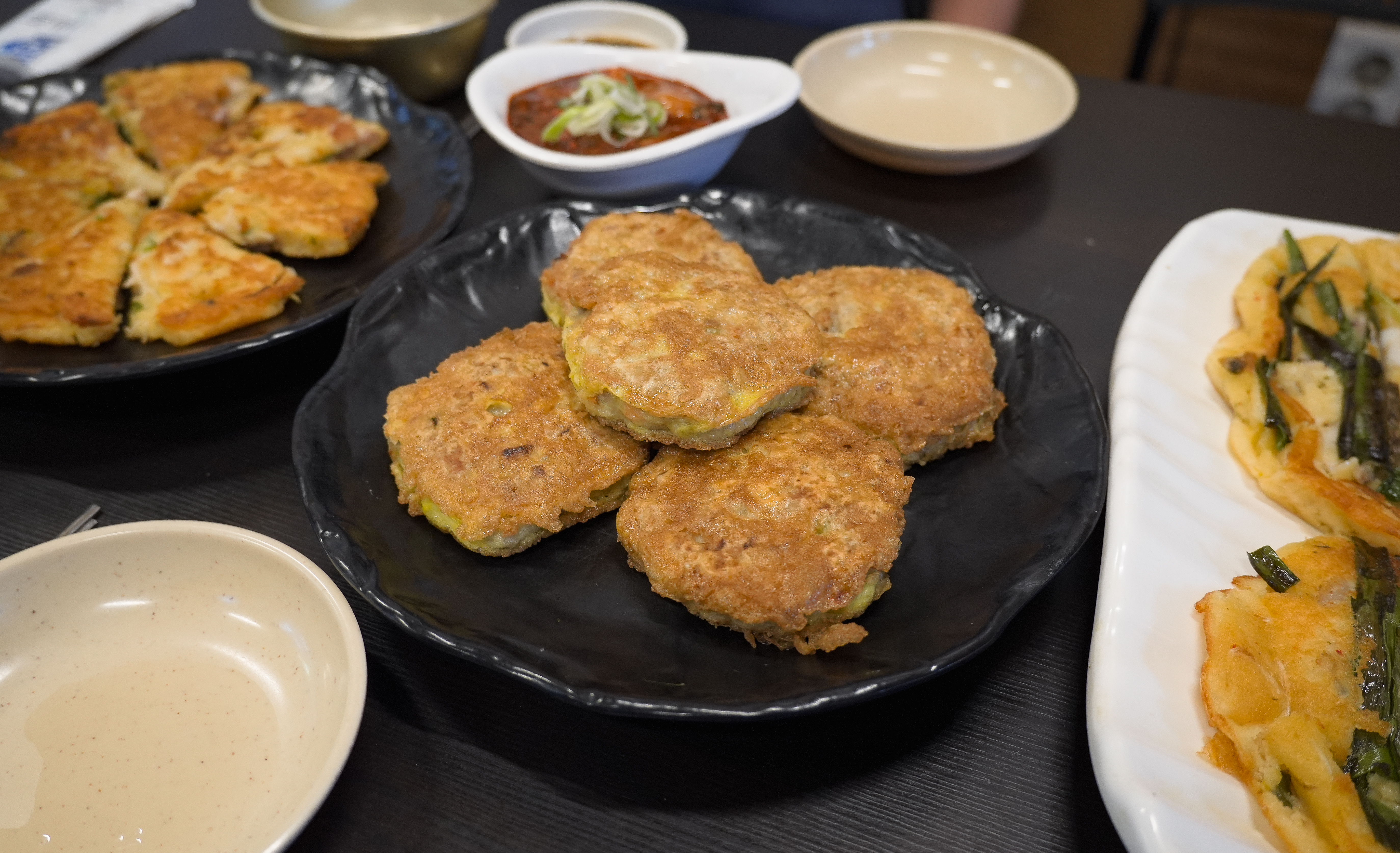 서울빈대떡의 메뉴가 나왔습니다. 왼쪽부터 녹두빈대떡, 녹두고기빈대떡, 녹두해물파전입니다. 이곳은 전체적으로 빈대떡을 베이스로 파전을 만들고 있어서 전체적으로 녹두가 들어가 있었습니다.
