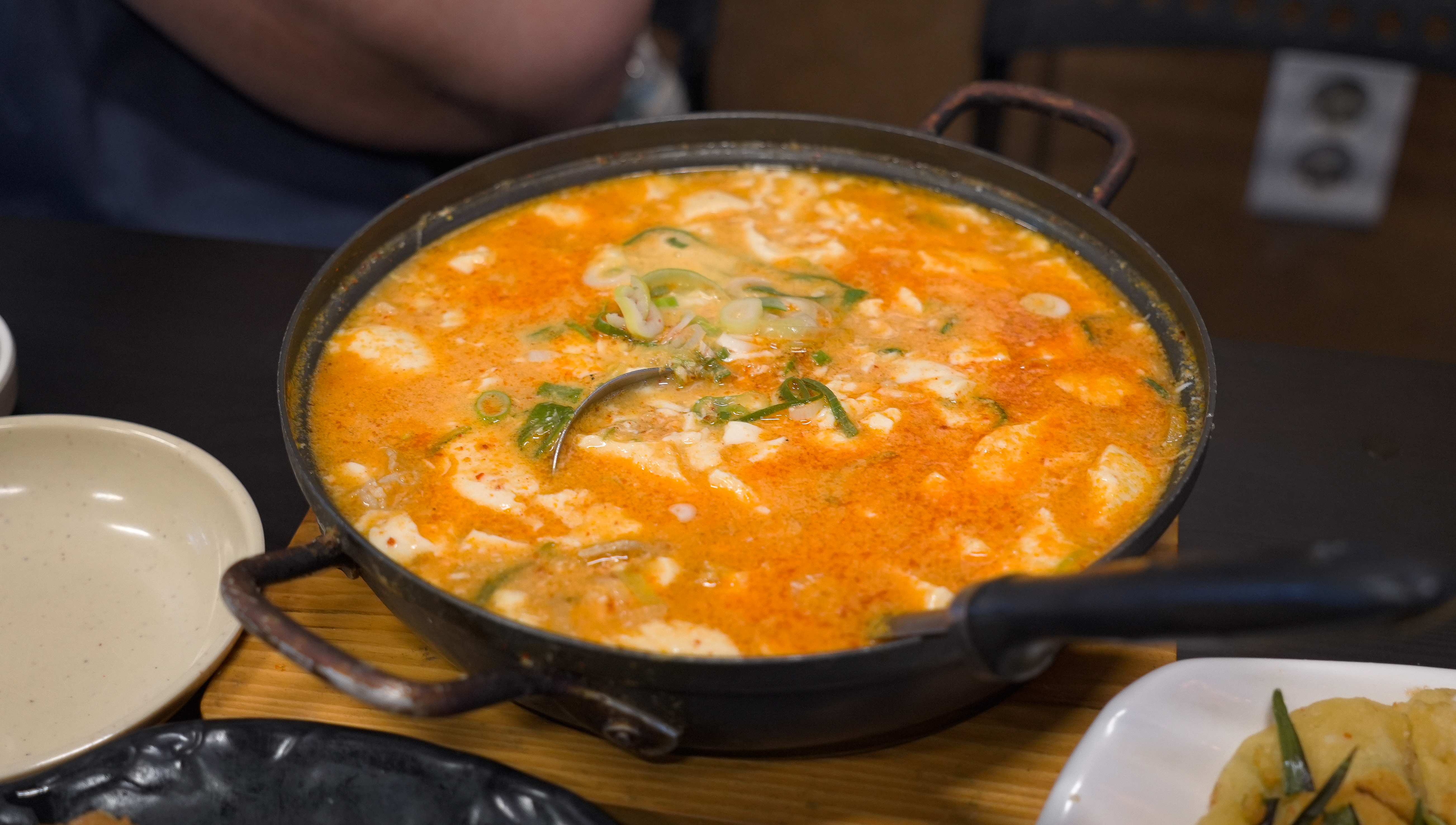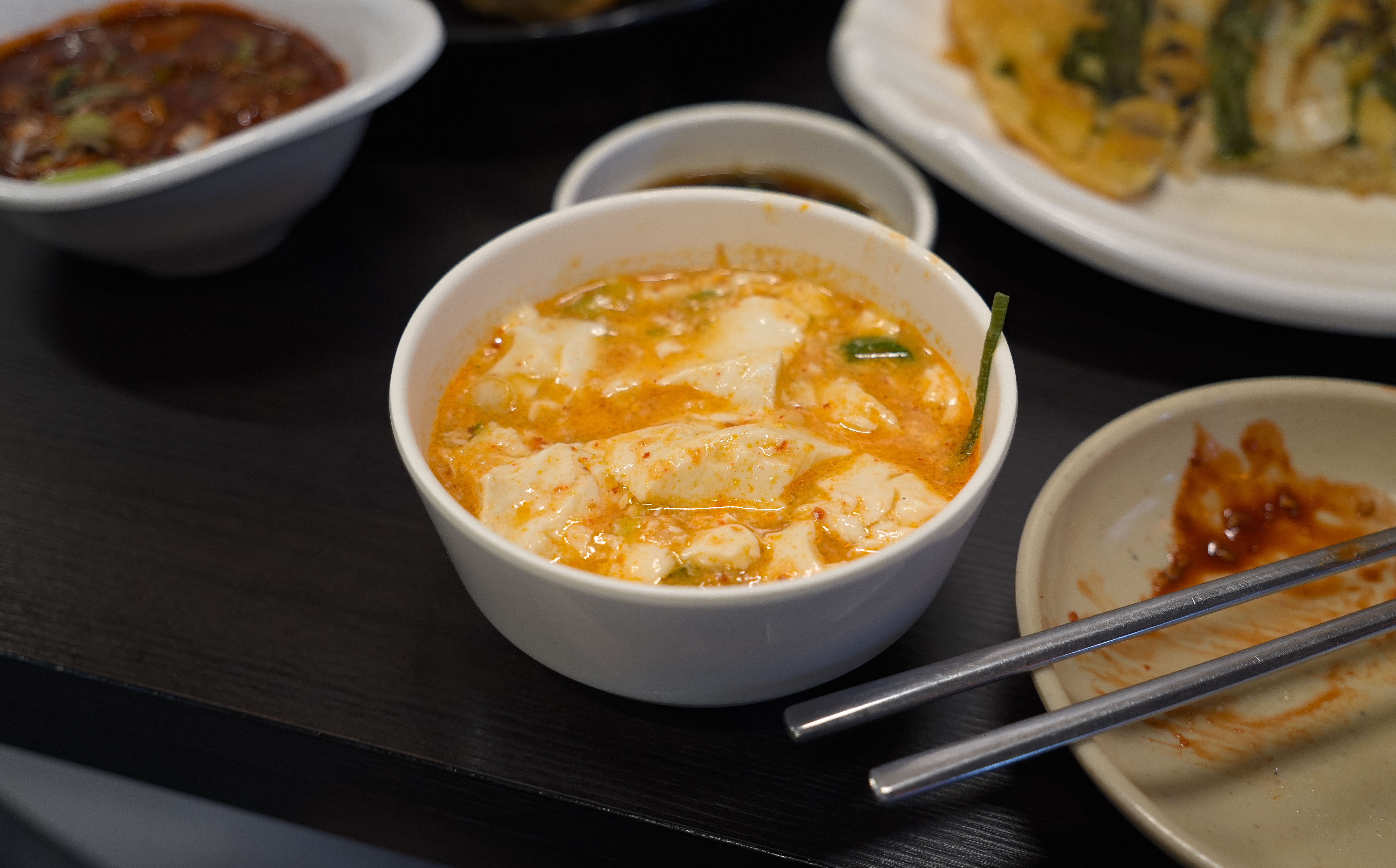 기름진 빈대떡만 먹다보니 살짝 느끼한 감이 있어서, 중간에 순두부찌개도 주문했습니다. 순두부찌개는 양이 꽤 많았는데, 아무래도 느끼함을 덜어주는 메뉴여서 그런지 칼칼하게 송송 채 썬 청양고추가 많이 들어가 있었습니다.
