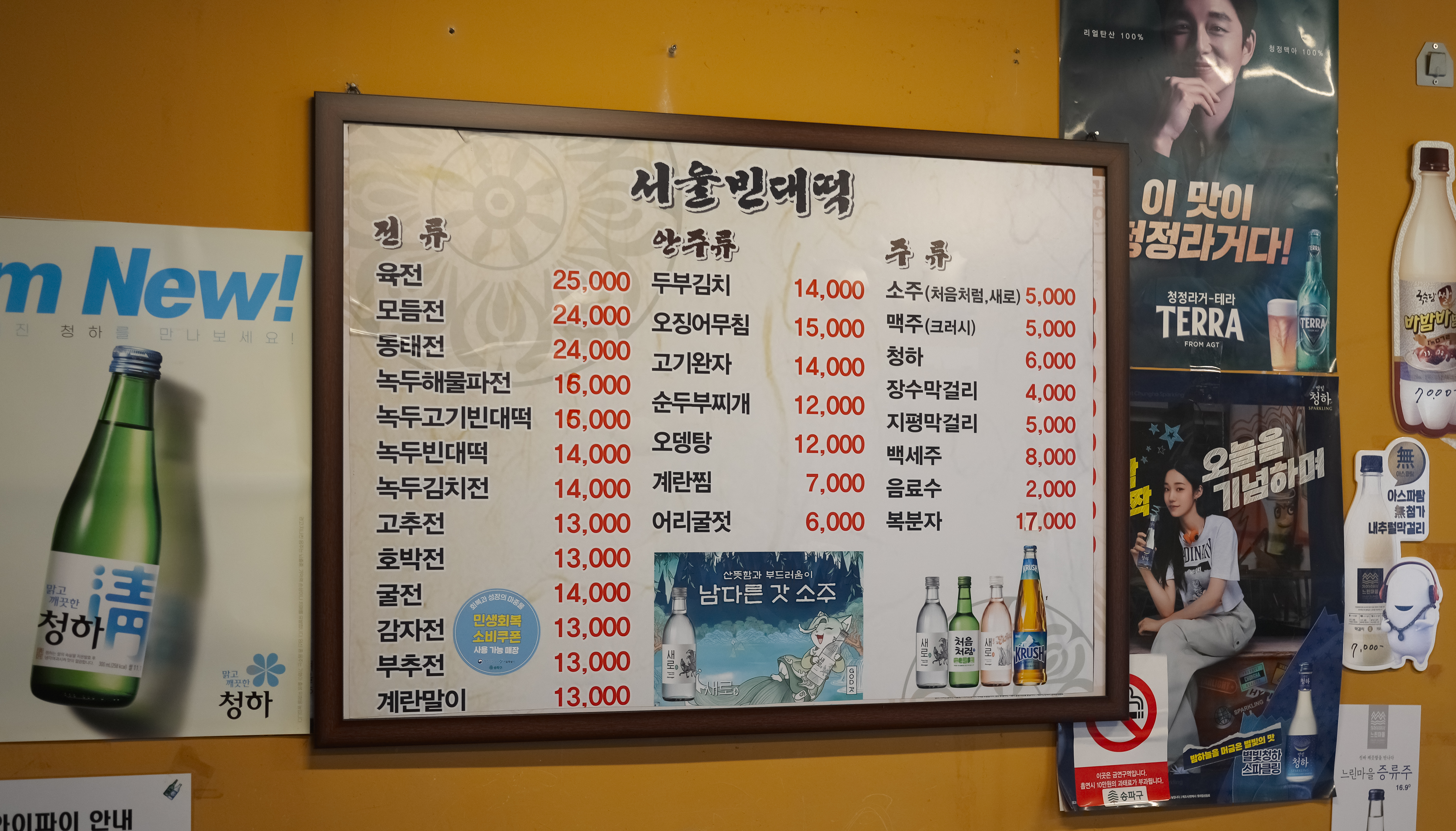 가락동에 위치한 서울빈대떡의 메뉴는 위와 같습니다. 육전, 모듬전, 동태전, 녹두해물파전, 녹두고기빈대떡, 녹두빈대떡, 녹두김치전, 고추전, 호박전, 굴전, 감자전, 부추전, 계란말이, 두부김치, 오징어무침, 고기완자, 순두부찌개, 오뎅탕, 계란찜, 어리굴젓이 있었습니다. 저희는 녹두해물파전, 녹두빈대떡, 녹두고기빈대떡을 먹었습니다.