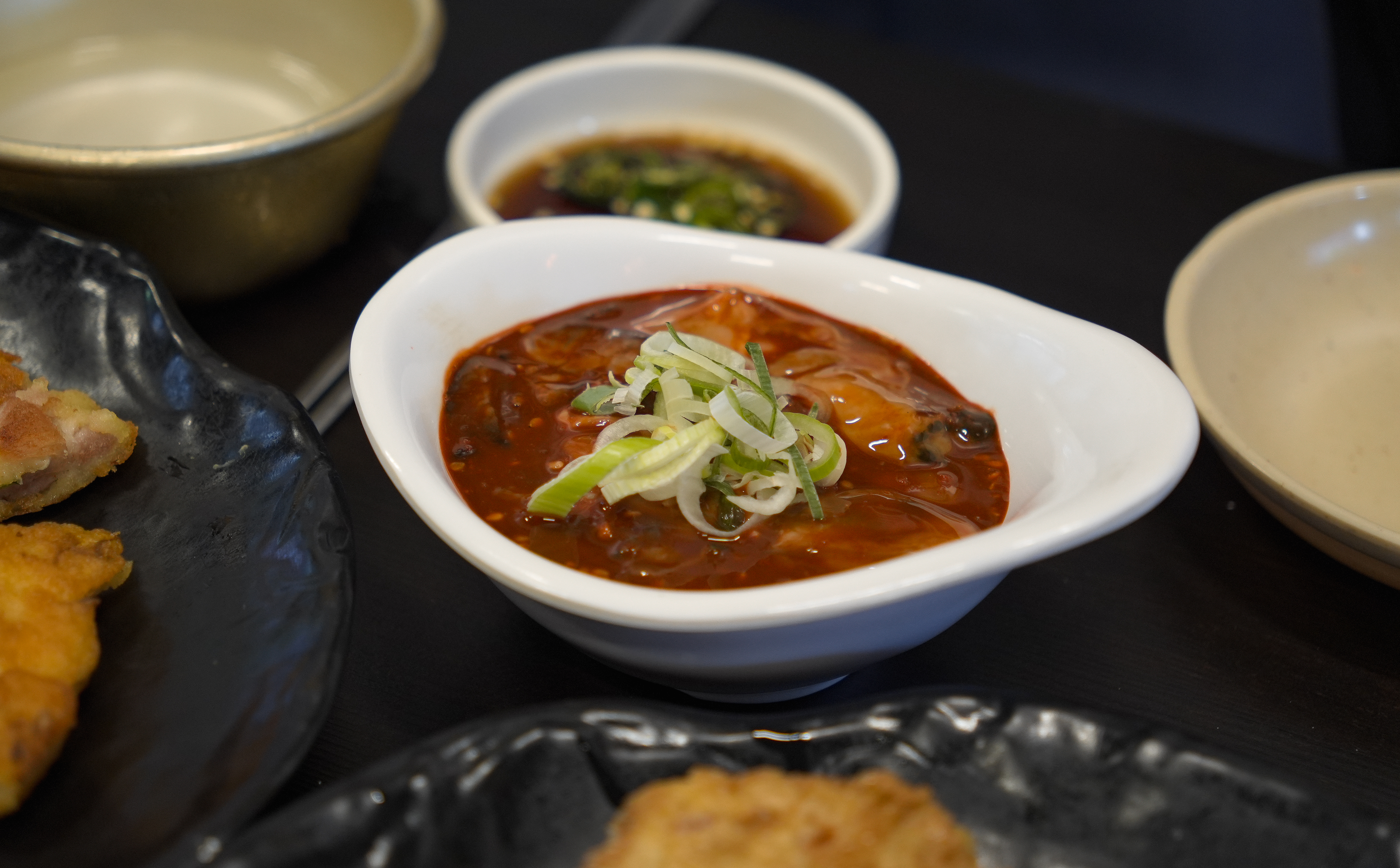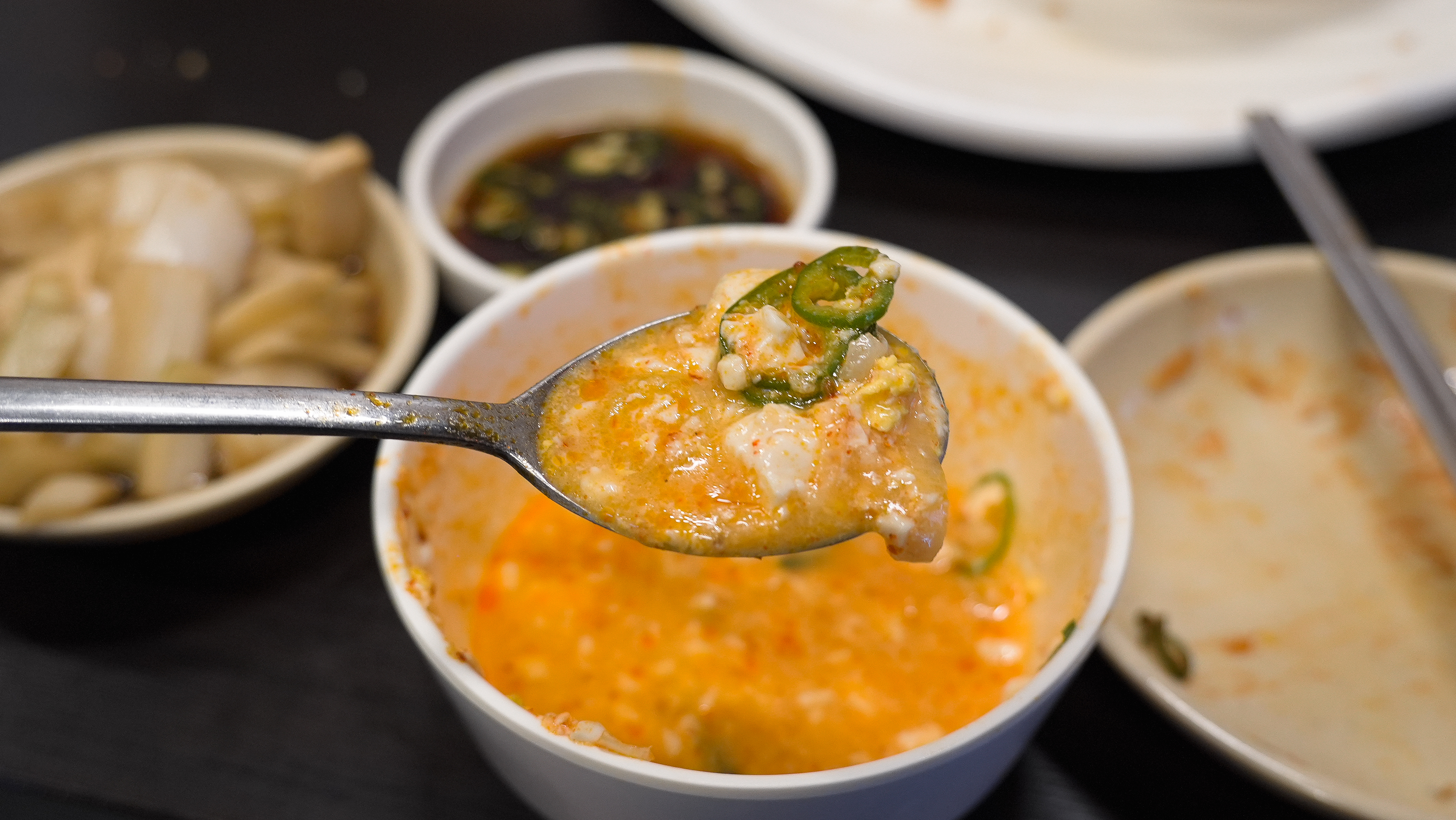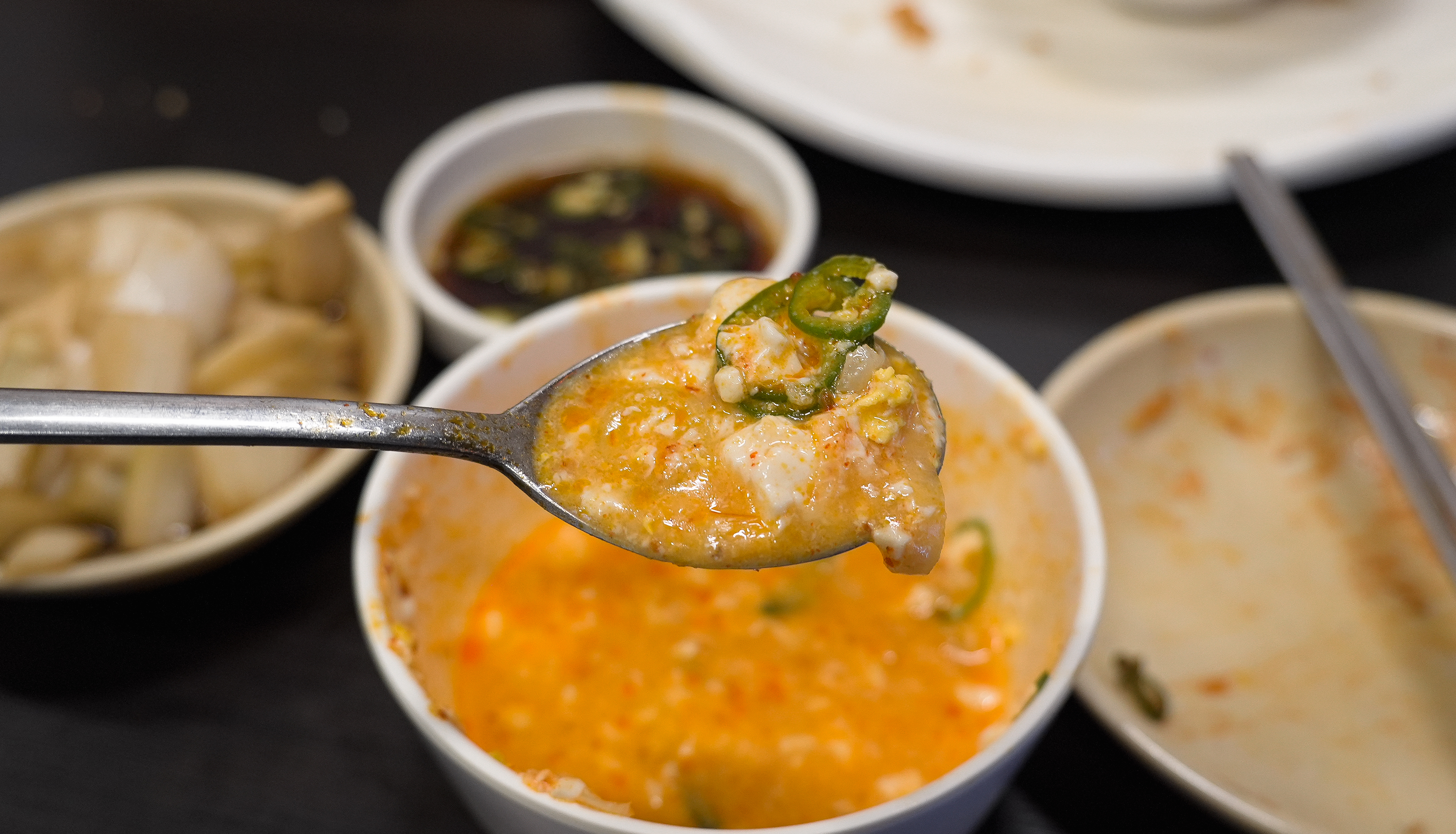 기름진 빈대떡만 먹다보니 살짝 느끼한 감이 있어서, 중간에 순두부찌개도 주문했습니다. 순두부찌개는 양이 꽤 많았는데, 아무래도 느끼함을 덜어주는 메뉴여서 그런지 칼칼하게 송송 채 썬 청양고추가 많이 들어가 있었습니다.
