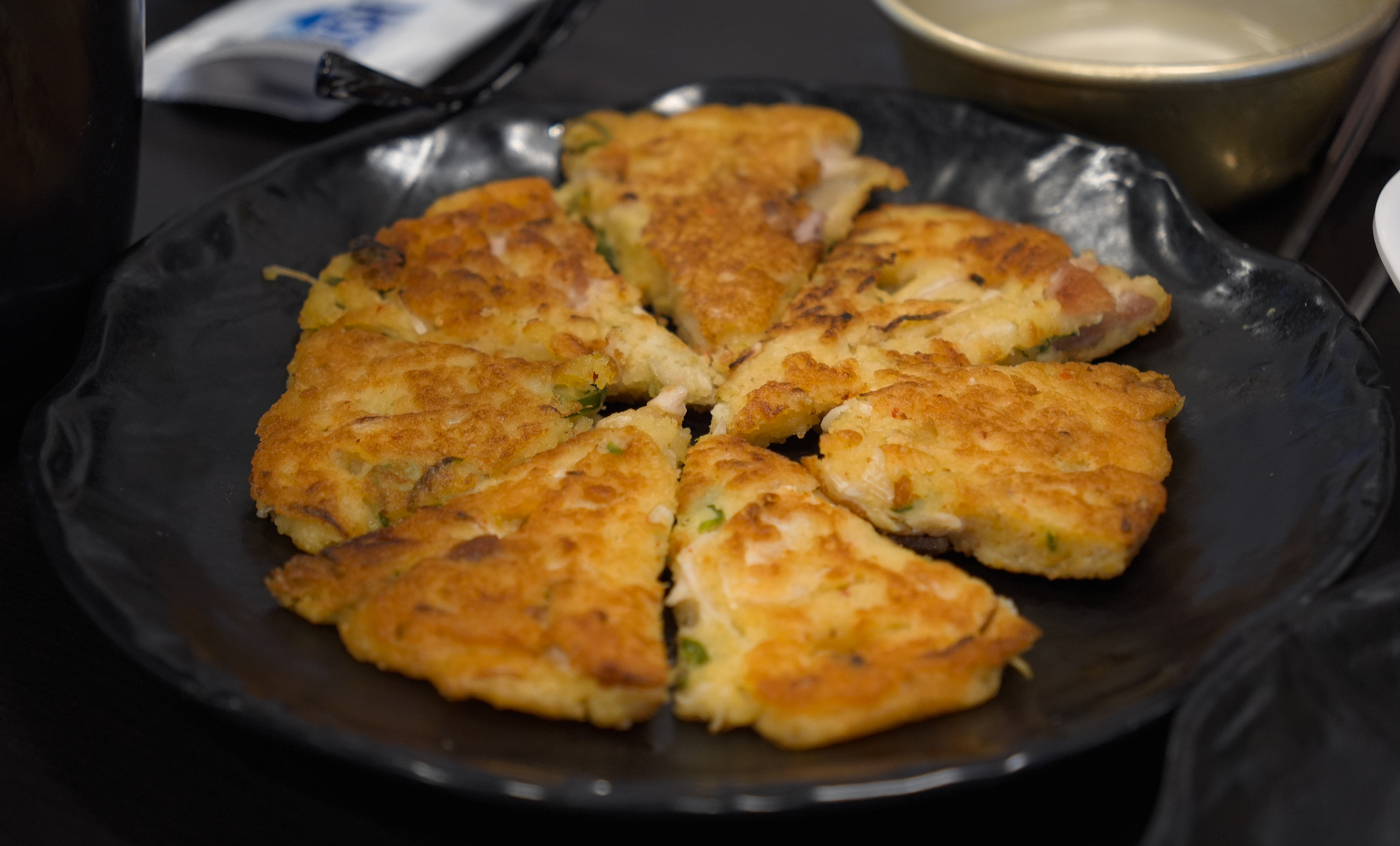서울빈대떡의 메뉴가 나왔습니다. 왼쪽부터 녹두빈대떡, 녹두고기빈대떡, 녹두해물파전입니다. 이곳은 전체적으로 빈대떡을 베이스로 파전을 만들고 있어서 전체적으로 녹두가 들어가 있었습니다.
