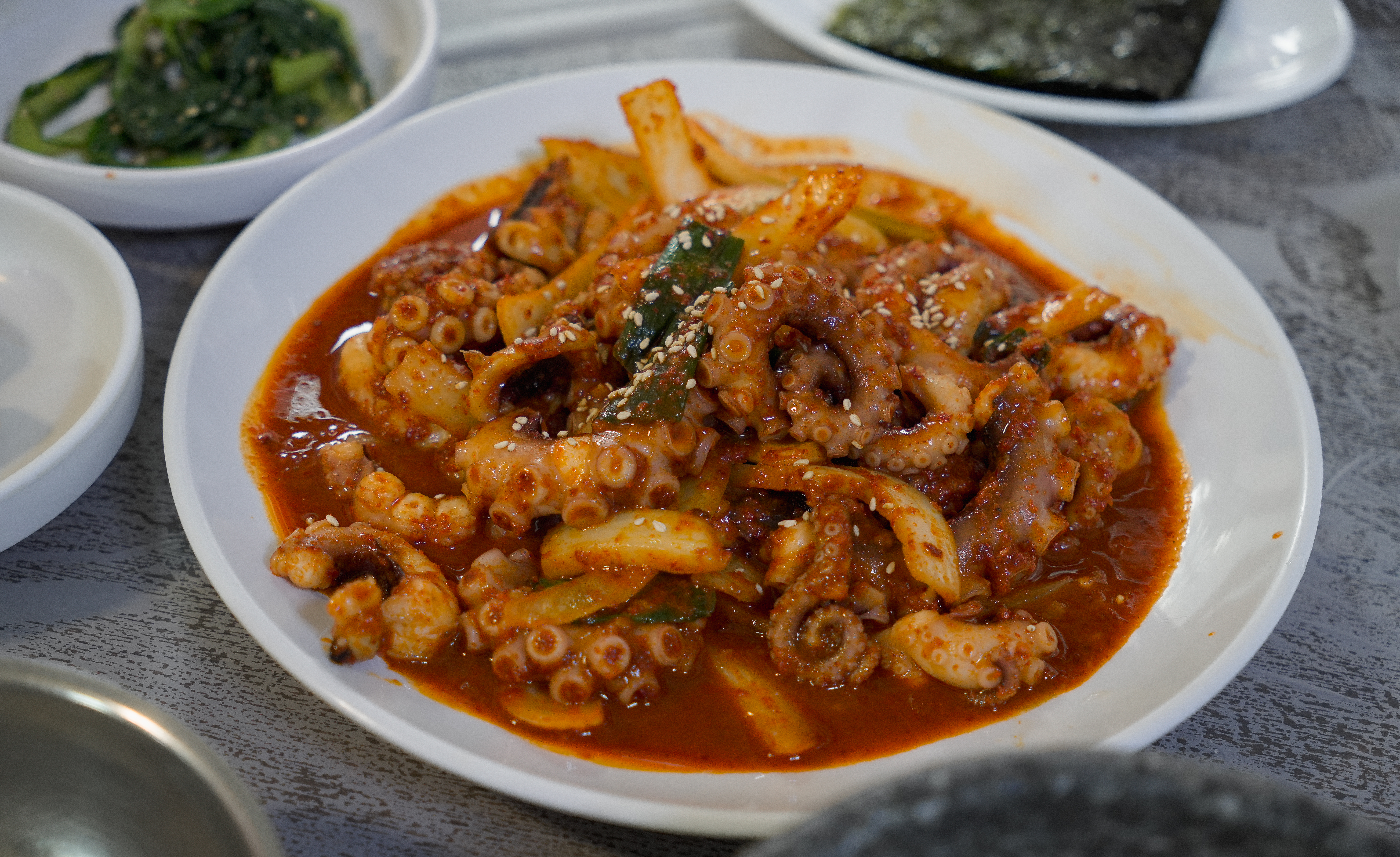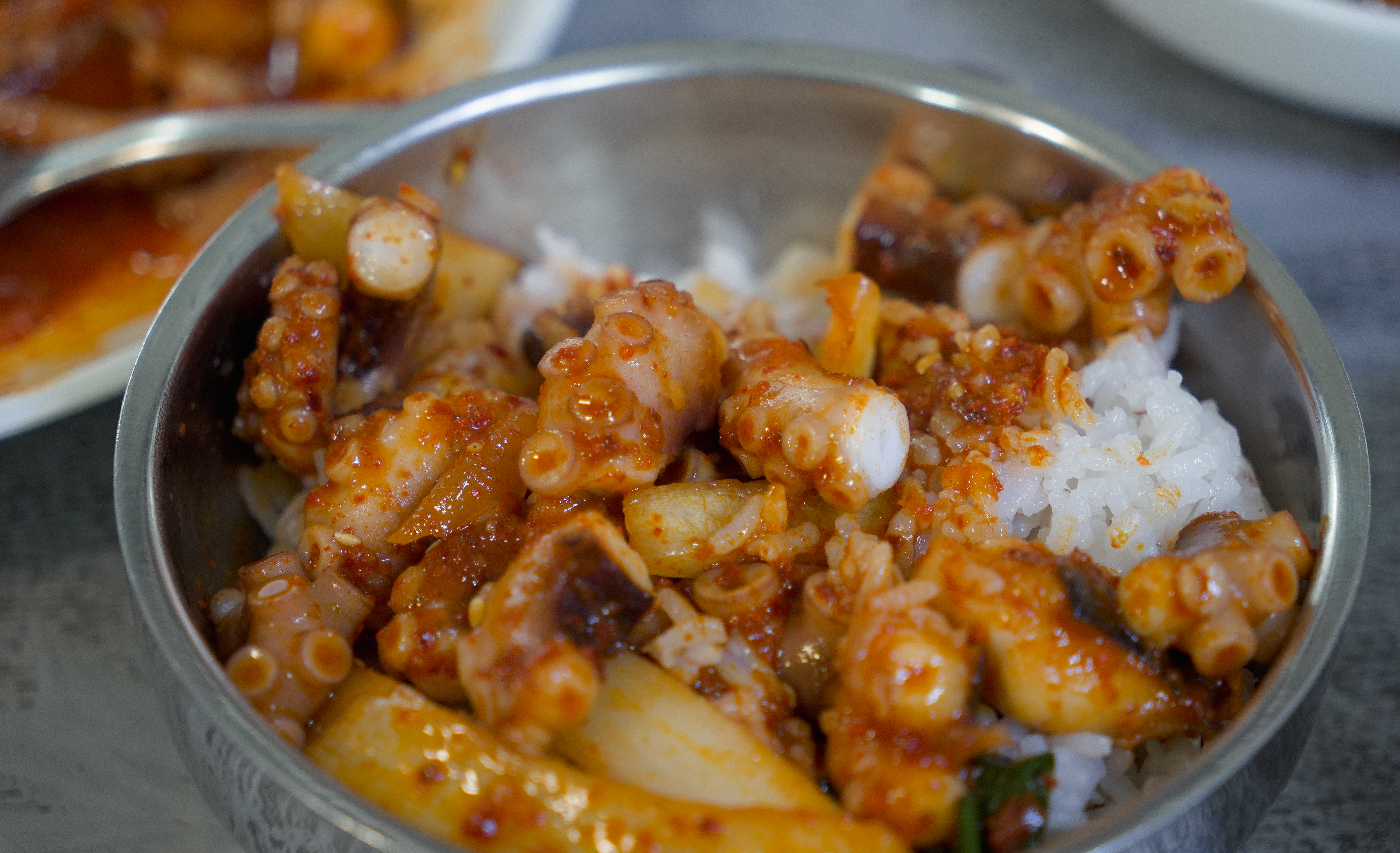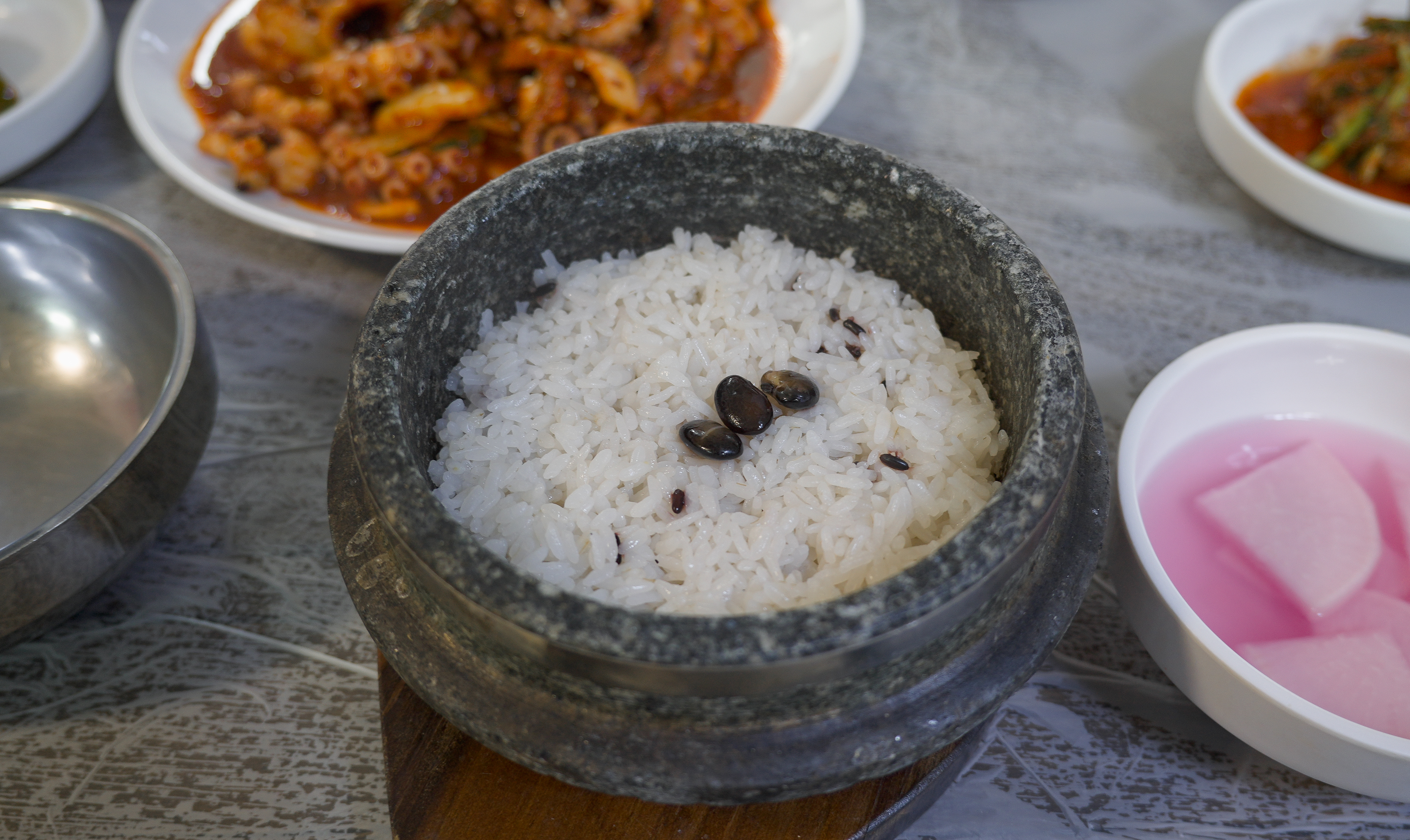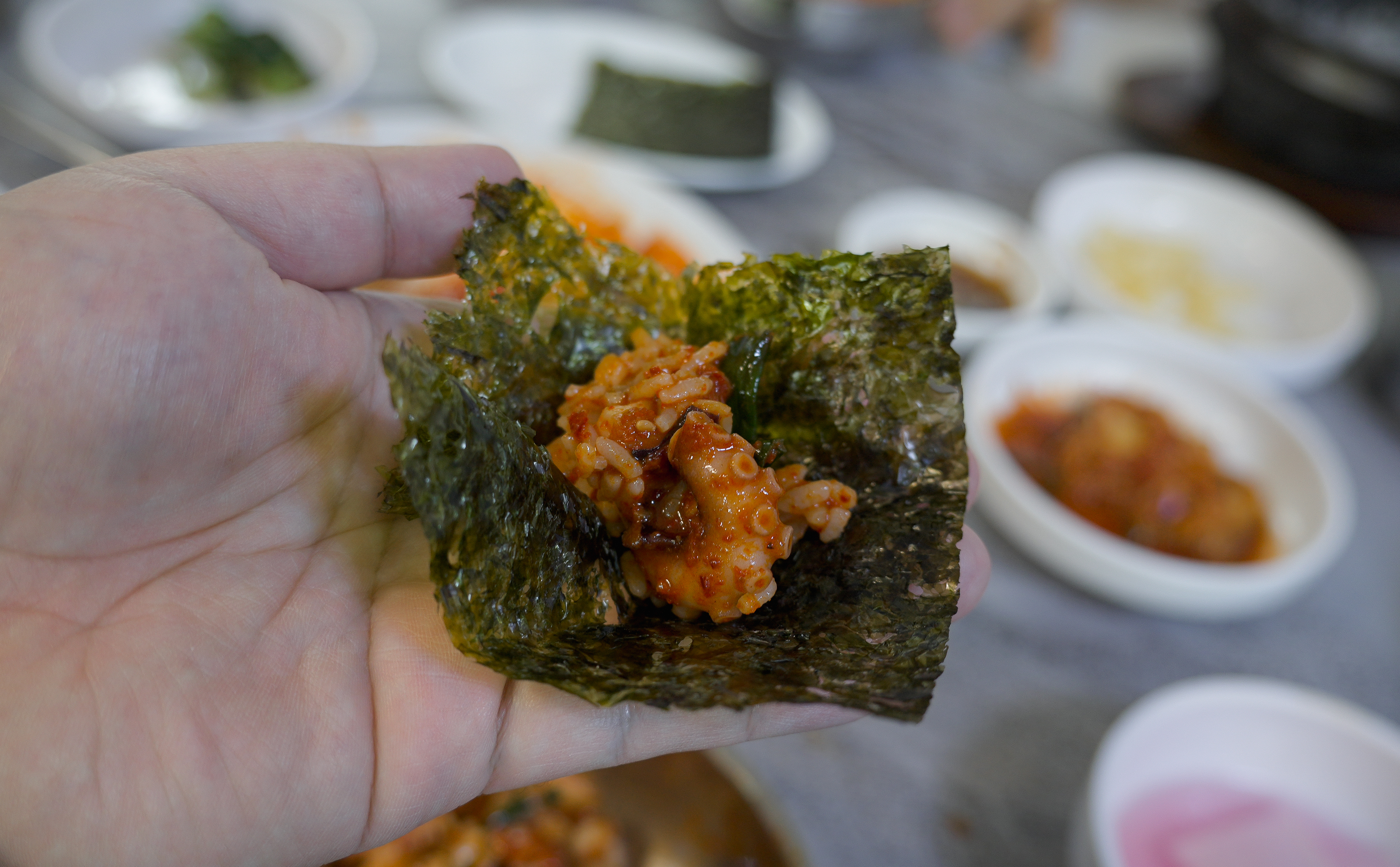 낙지볶음과 같이 곁들여 먹는 밥이 돌솥밥이라 더 찰기있고 맛있었습니다. 낙지볶음비빔밥(?)도 맛있었지만, 김에 같이 곁들여서 싸서 먹으면 해초의 향이 더해져 더 좋았습니다.